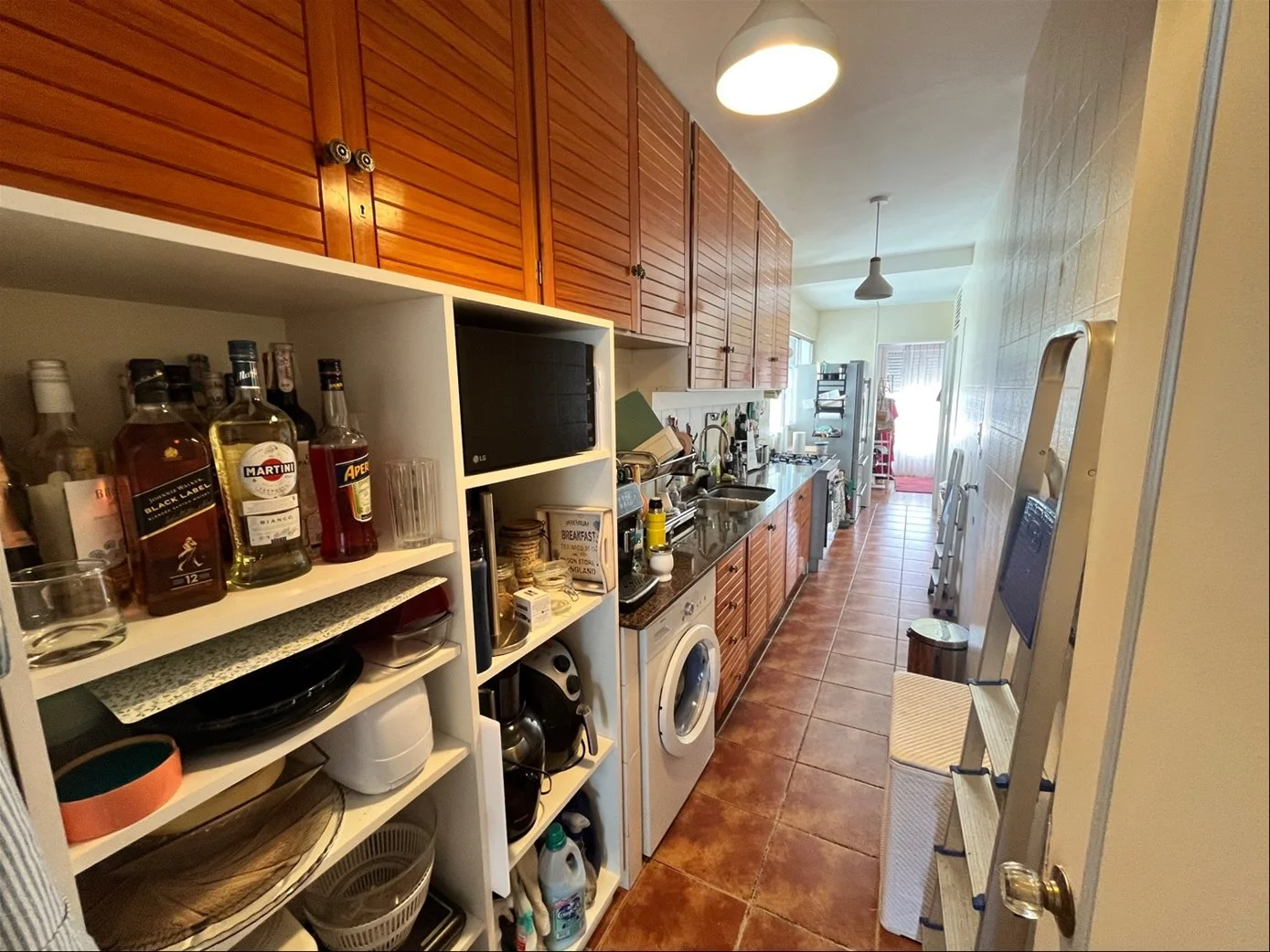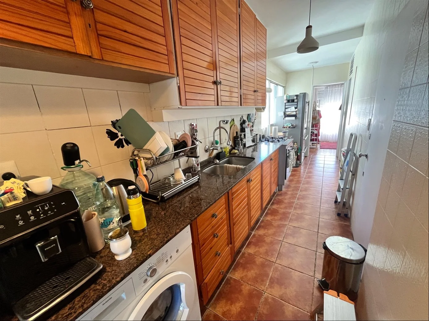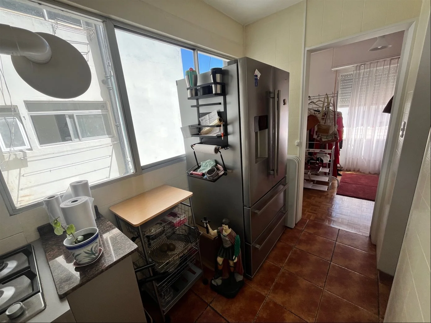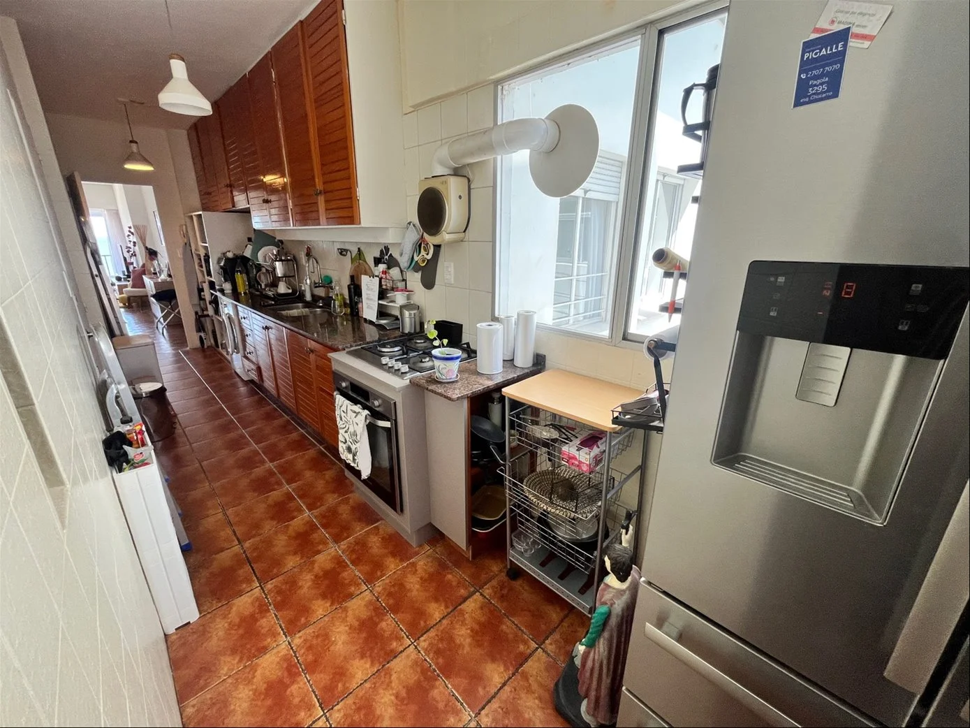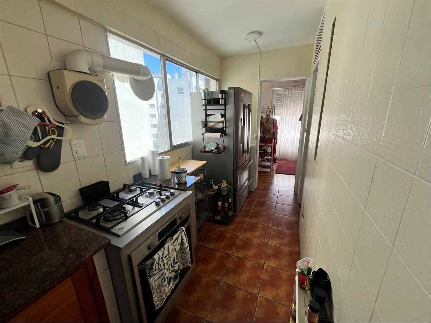 La cocina definida es en formato rectangular de muy buenas dimensiones con área de desayunador, gran superficie de mesadas y buenos placares de madera, gas por cañería, segunda puerta de acceso al apartamento desde el hall y ascensor de servicio. Además, dispone de dormitorio y baño de servicio, el dormitorio con pisos de parquet y la misma vista y orientación al contrafrente que tiene el dormitorio secundario.