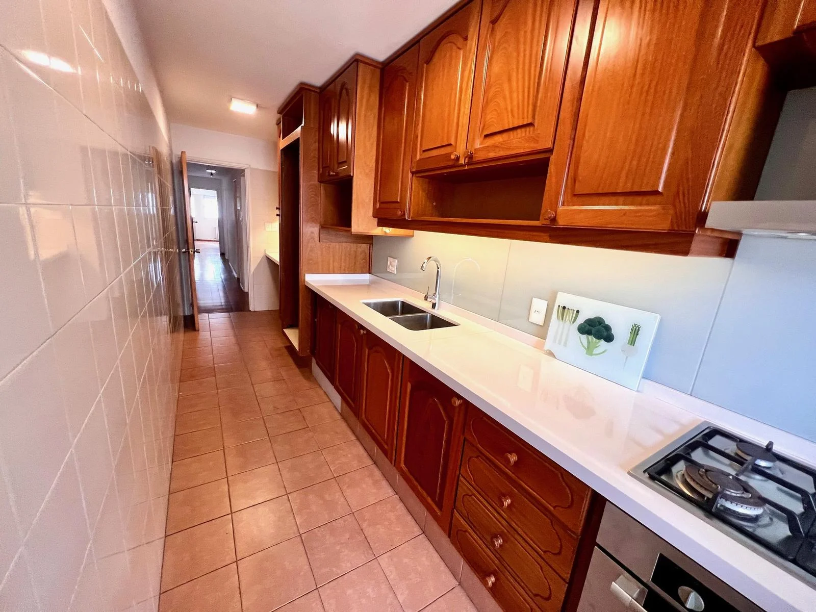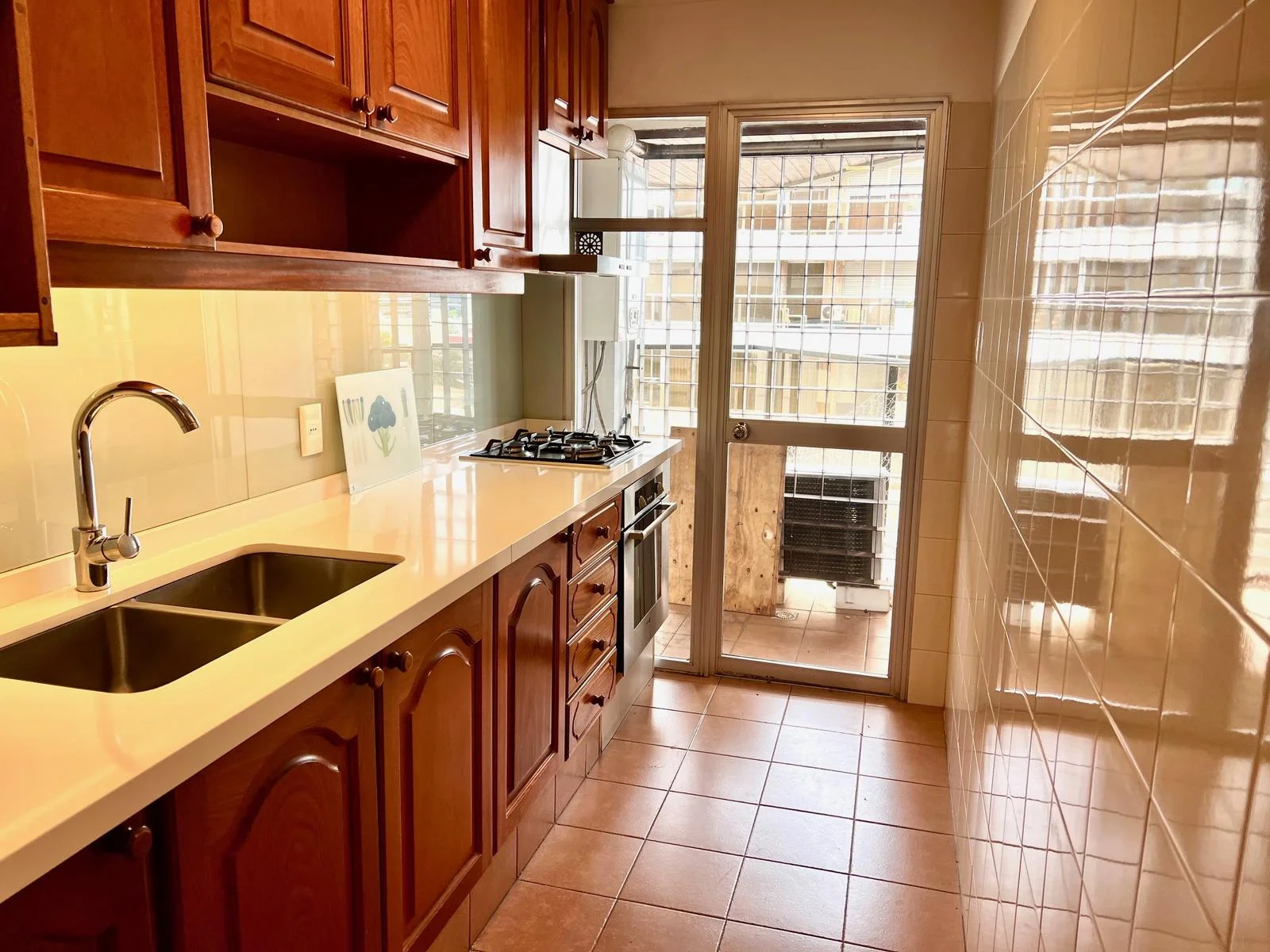 Cocina definida con muchos armarios, mesada de silestone, horno eléctrico y anafe a gas.