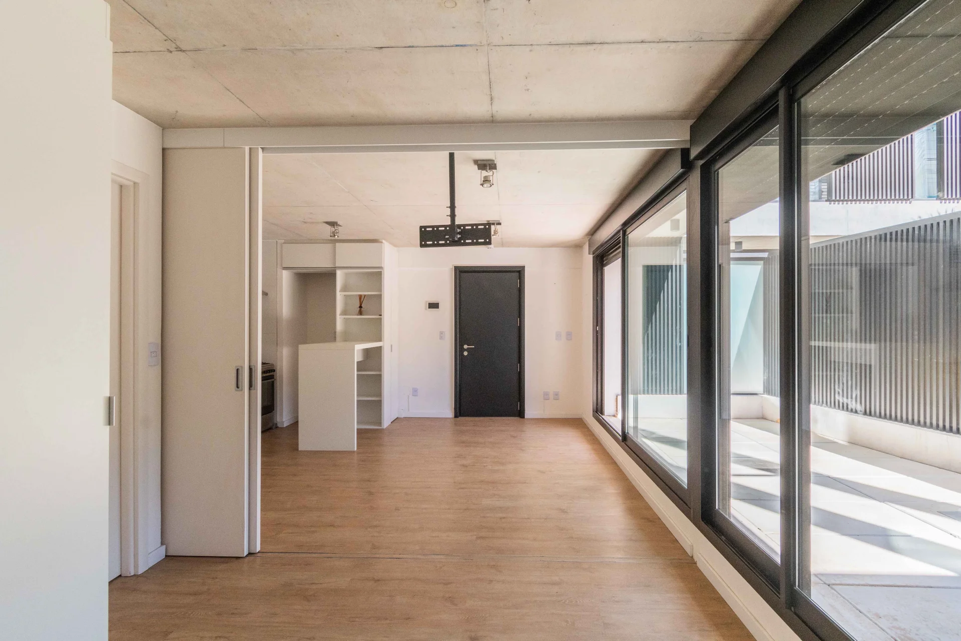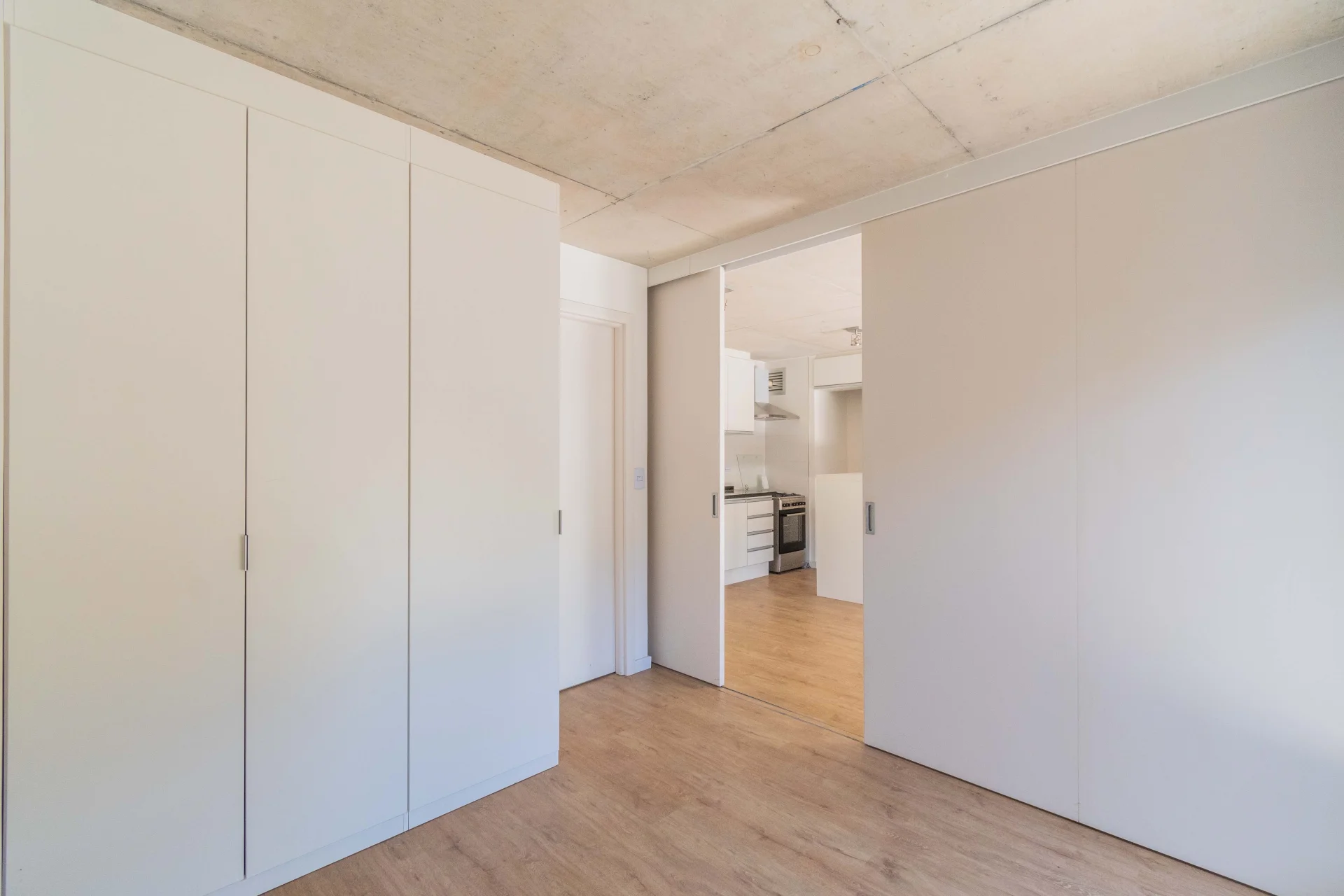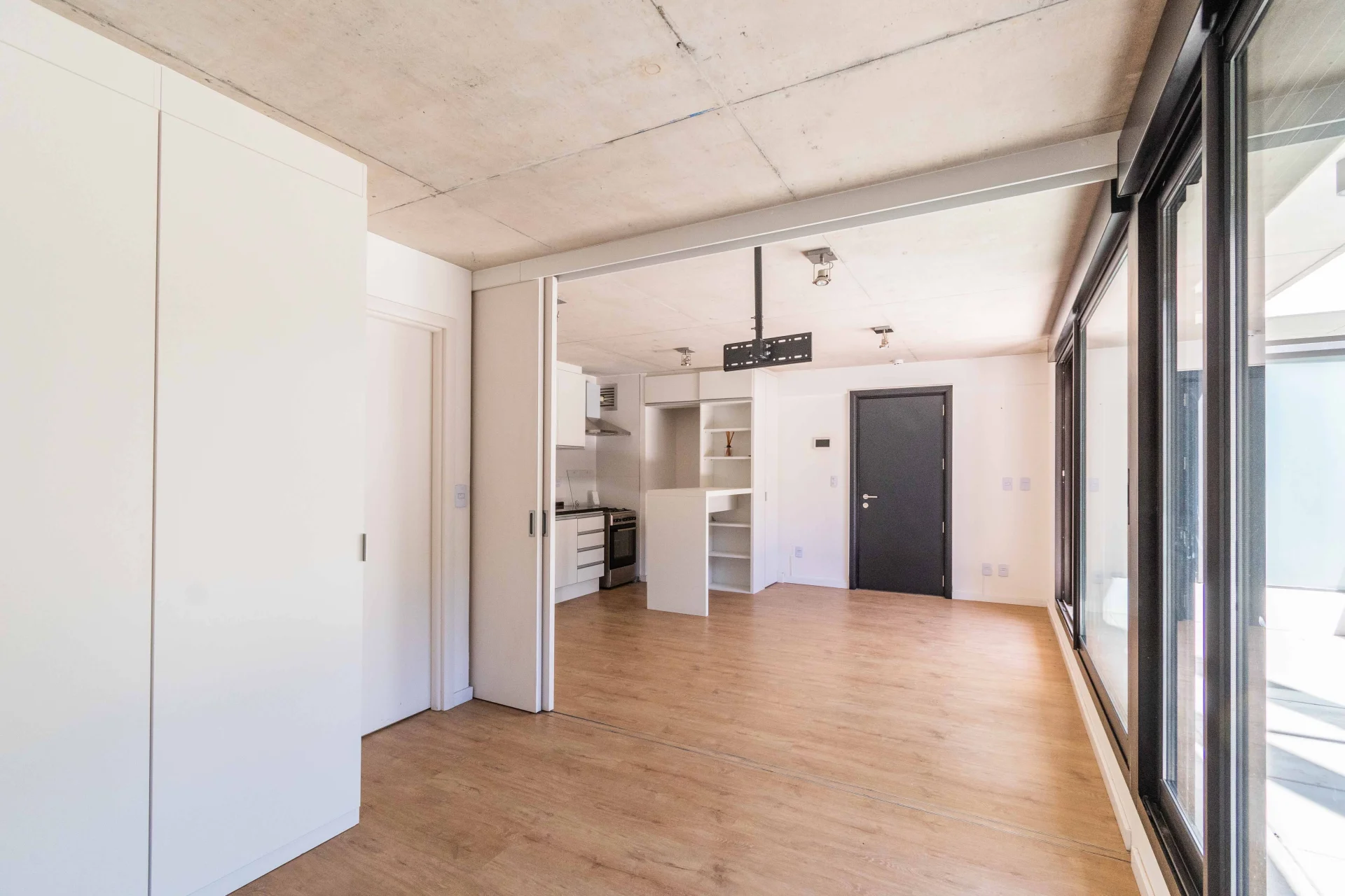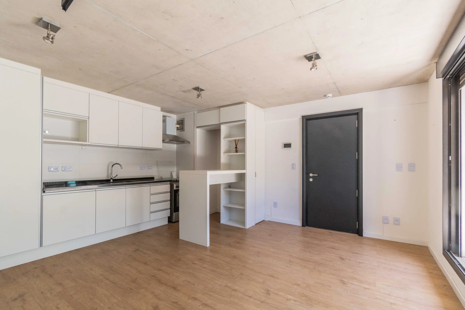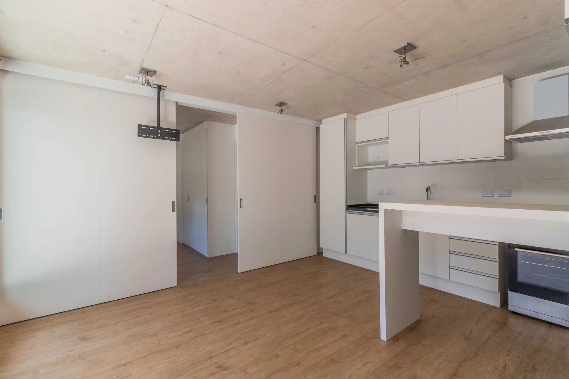 Living con despojador, cocina integrada con barra separadora y gran capacidad de guardado, puertas corredizas que dividen el ambiente, dormitorio con placares y un baño completo.