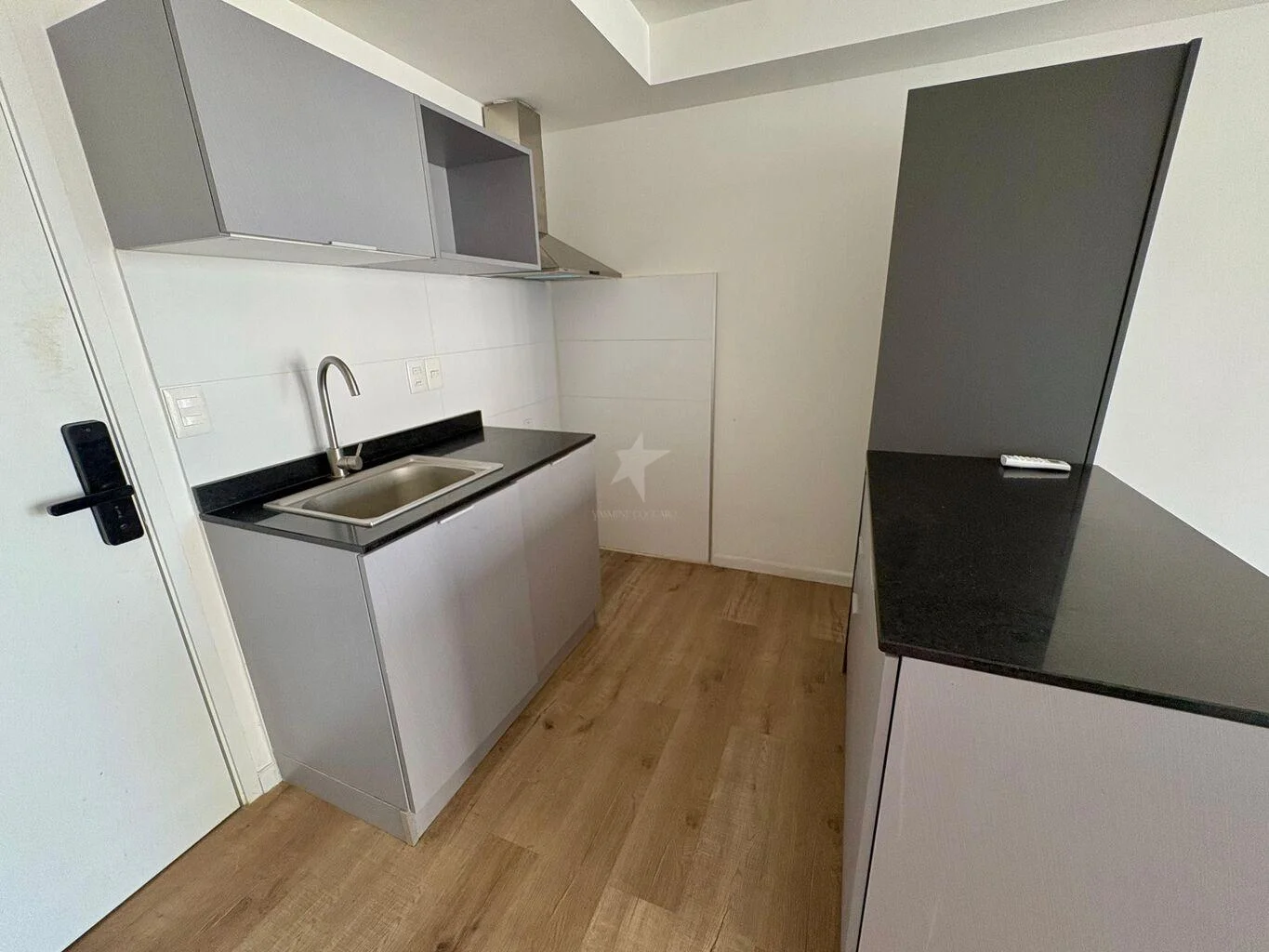 Cocina abierta con profusión de placares y campana.