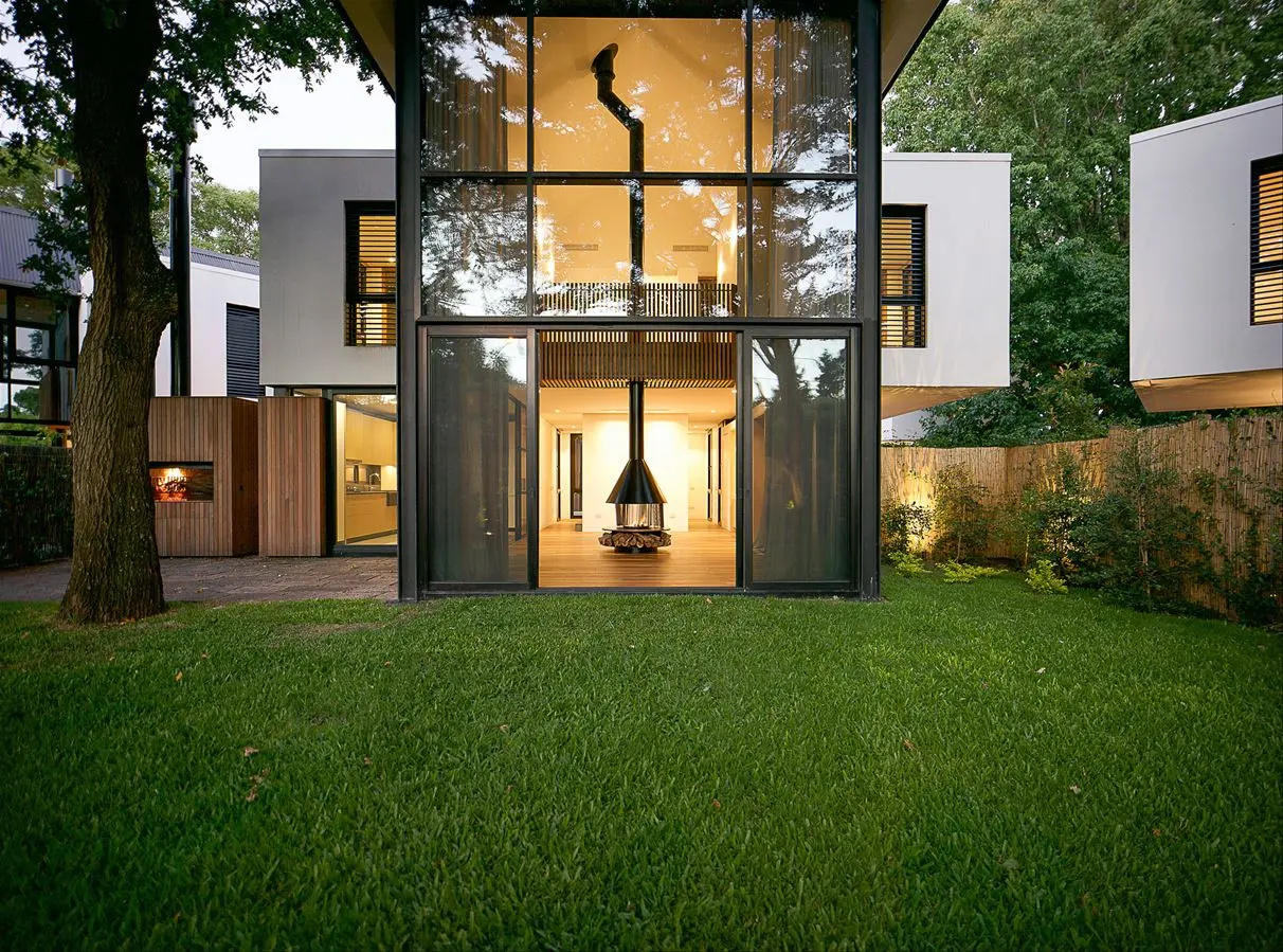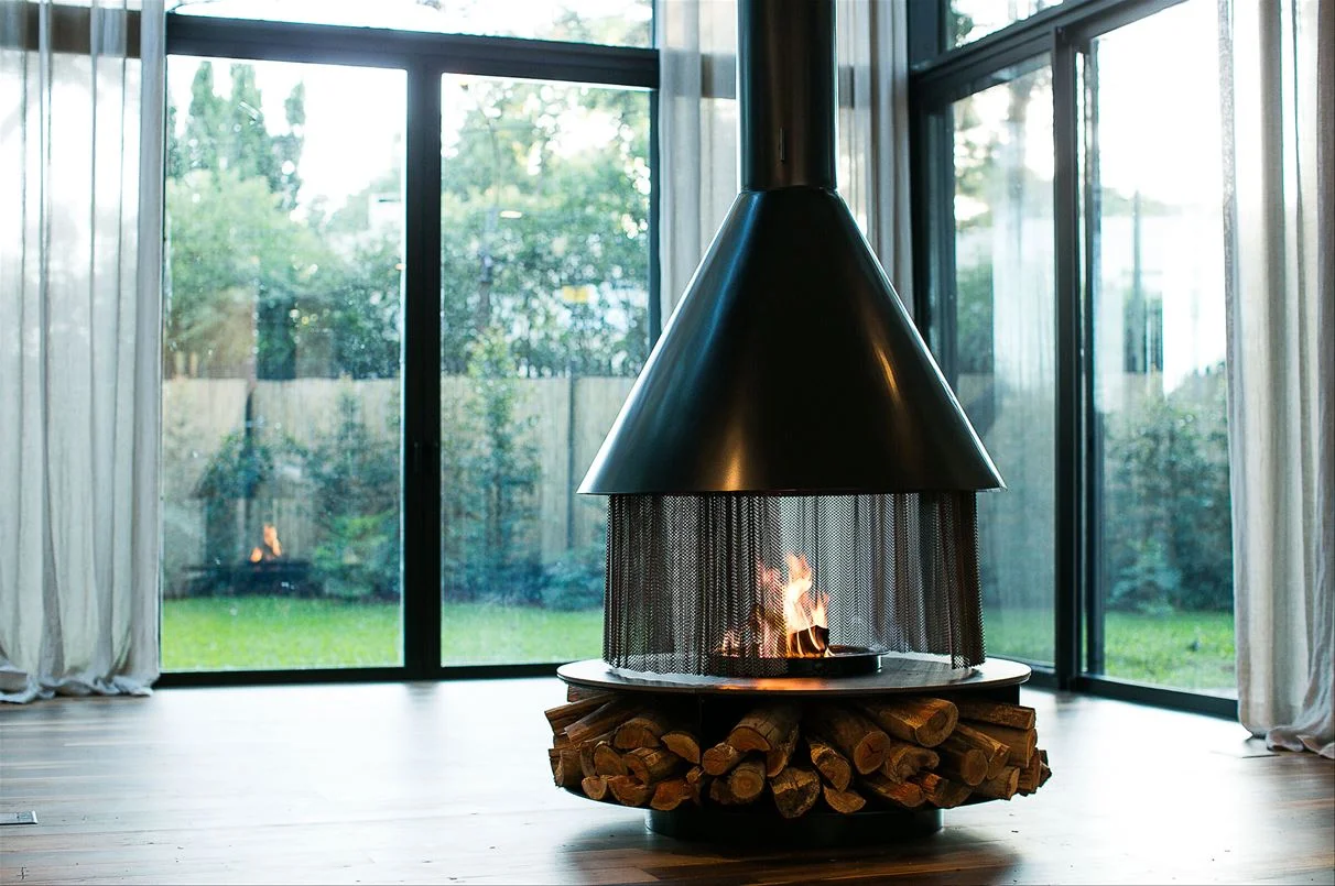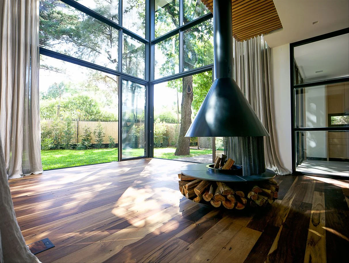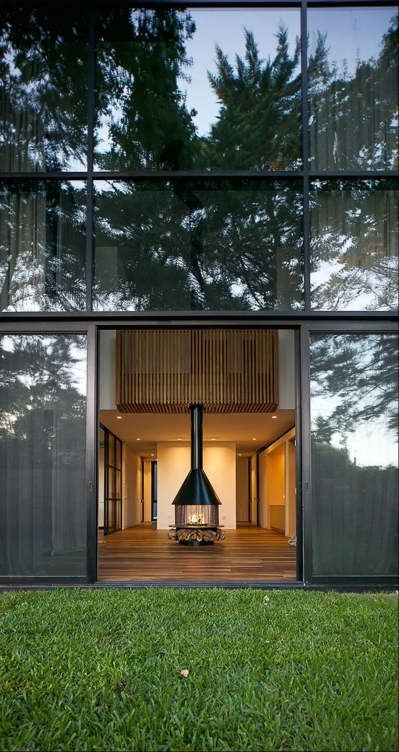 En planta baja, living comedor con doble altura y ventanales de piso a techo, que generan una increíble integración con el jardín, un espacio amplio, luminoso y cálido por los pisos de madera y la estufa a leña central diseñada especialmente para el espacio.