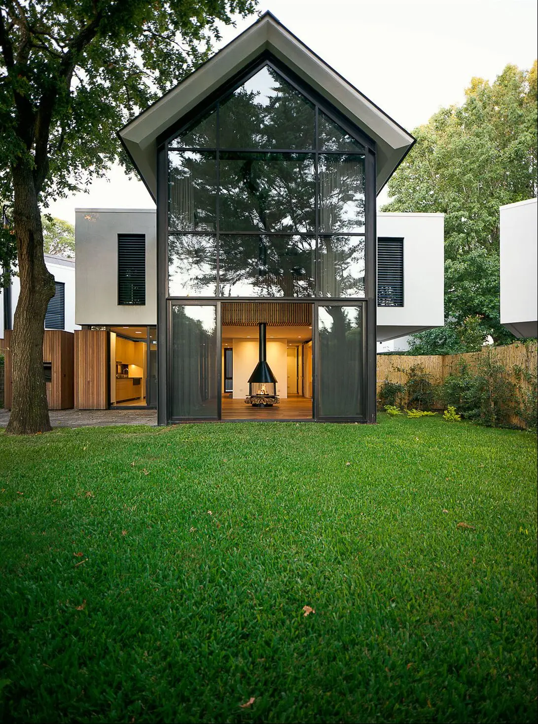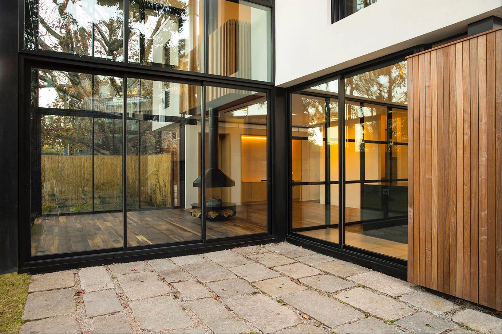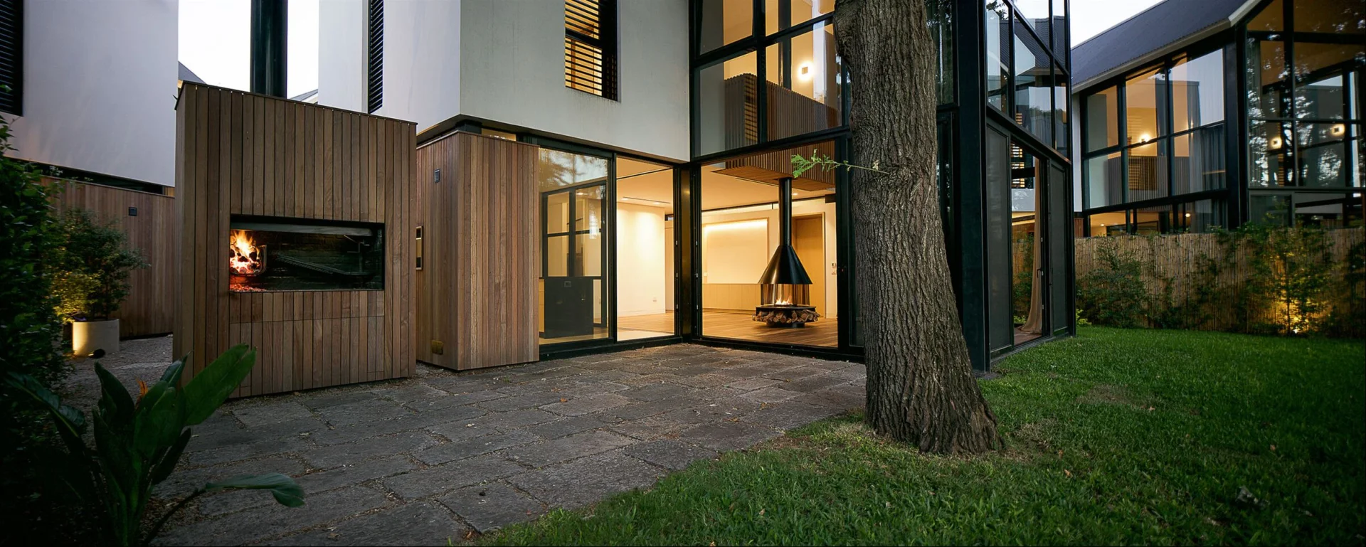 En planta baja, living comedor con doble altura y ventanales de piso a techo, que generan una increíble integración con el jardín, un espacio amplio, luminoso y cálido por los pisos de madera y la estufa a leña central diseñada especialmente para el espacio.