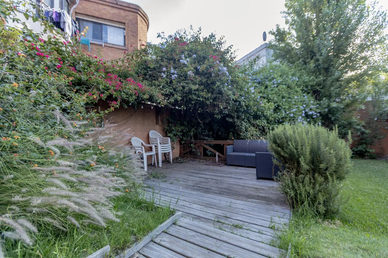 Fondo: Jardín íntimo con paisajismo cuidado, deck de madera y pergola.
