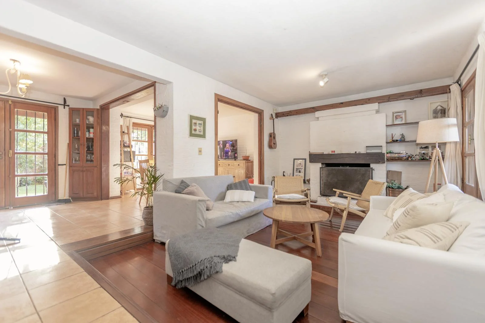 Lo mejor de la planta baja es su conexión con el exterior: ventanales de vidrio repartido que se abren hacia un hermoso deck de madera y el jardín, integrando el verde al interior de la casa.