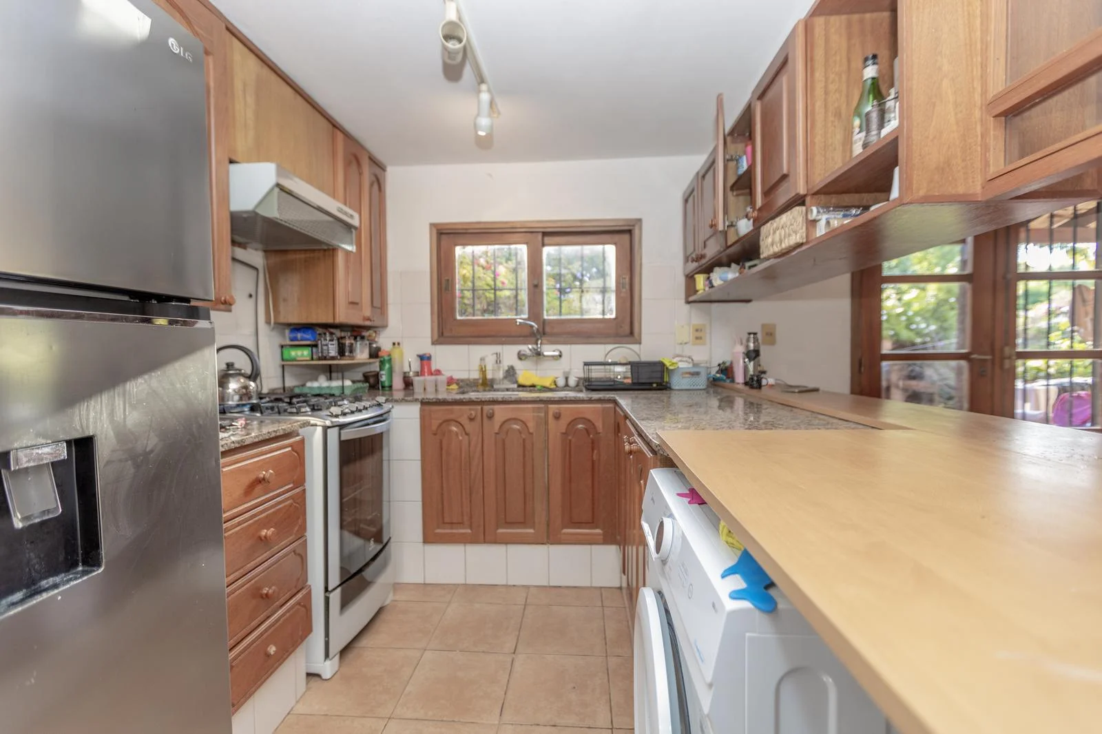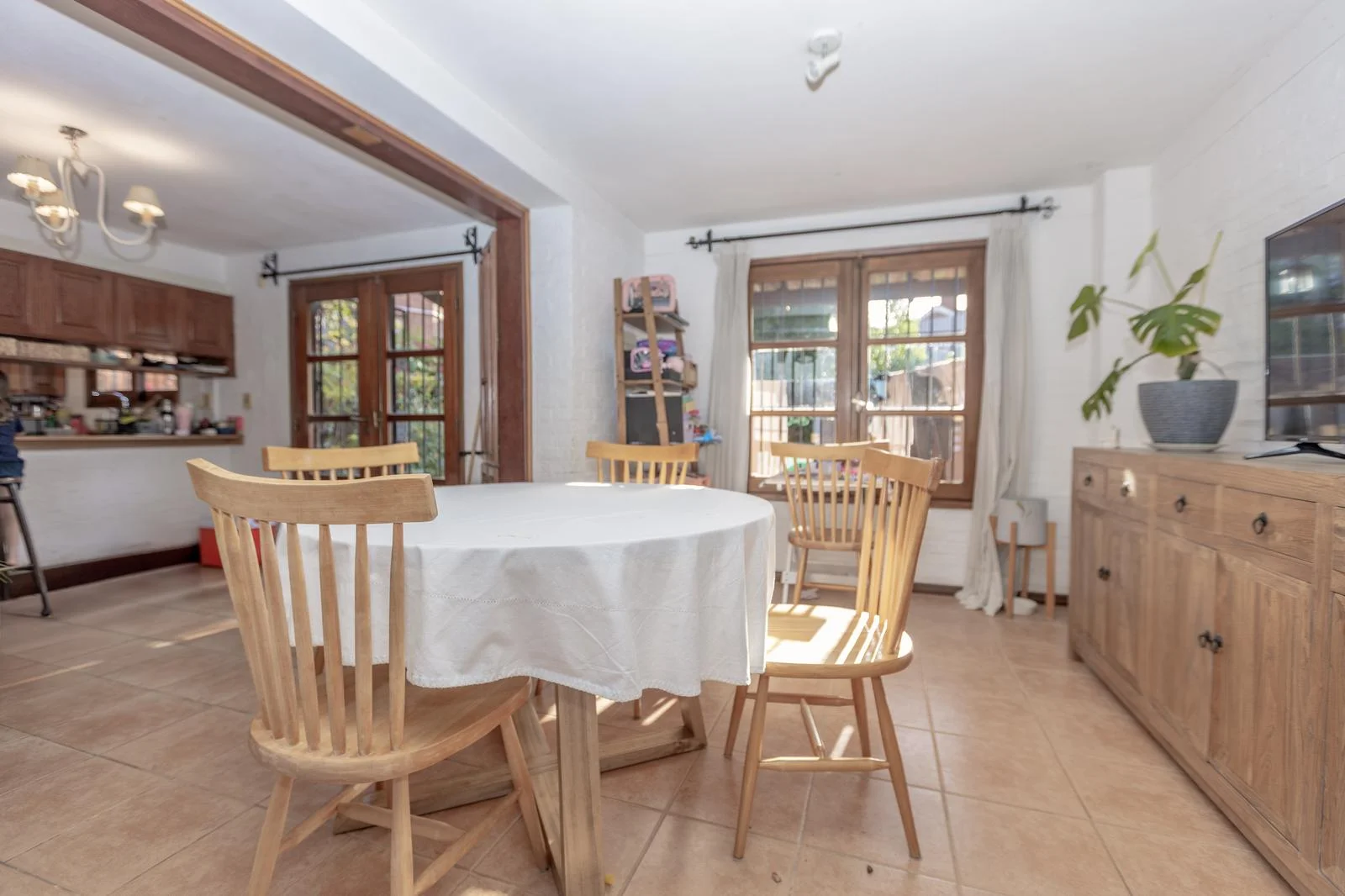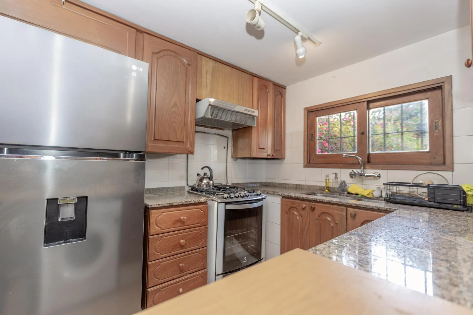 PLANTA BAJA Y ÁREA SOCIAL Al ingresar, destaca la luminosidad y calidez de sus ambientes. Cuenta con un amplio living con estufa a leña y paredes de ladrillo pintado que aportan textura y diseño. El comedor se encuentra semi-integrado, conectado a una cocina funcional con barra desayunadora, ideal para la vida diaria.