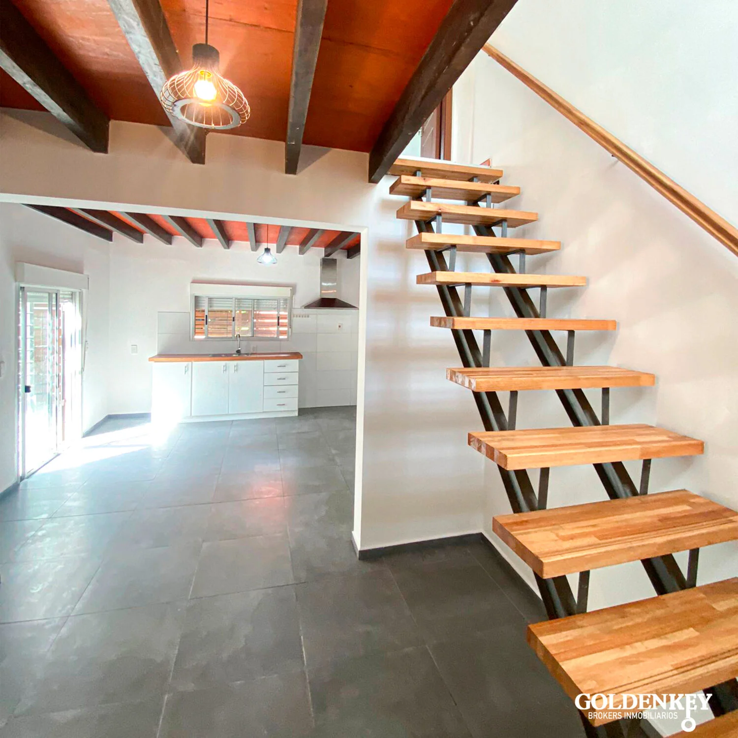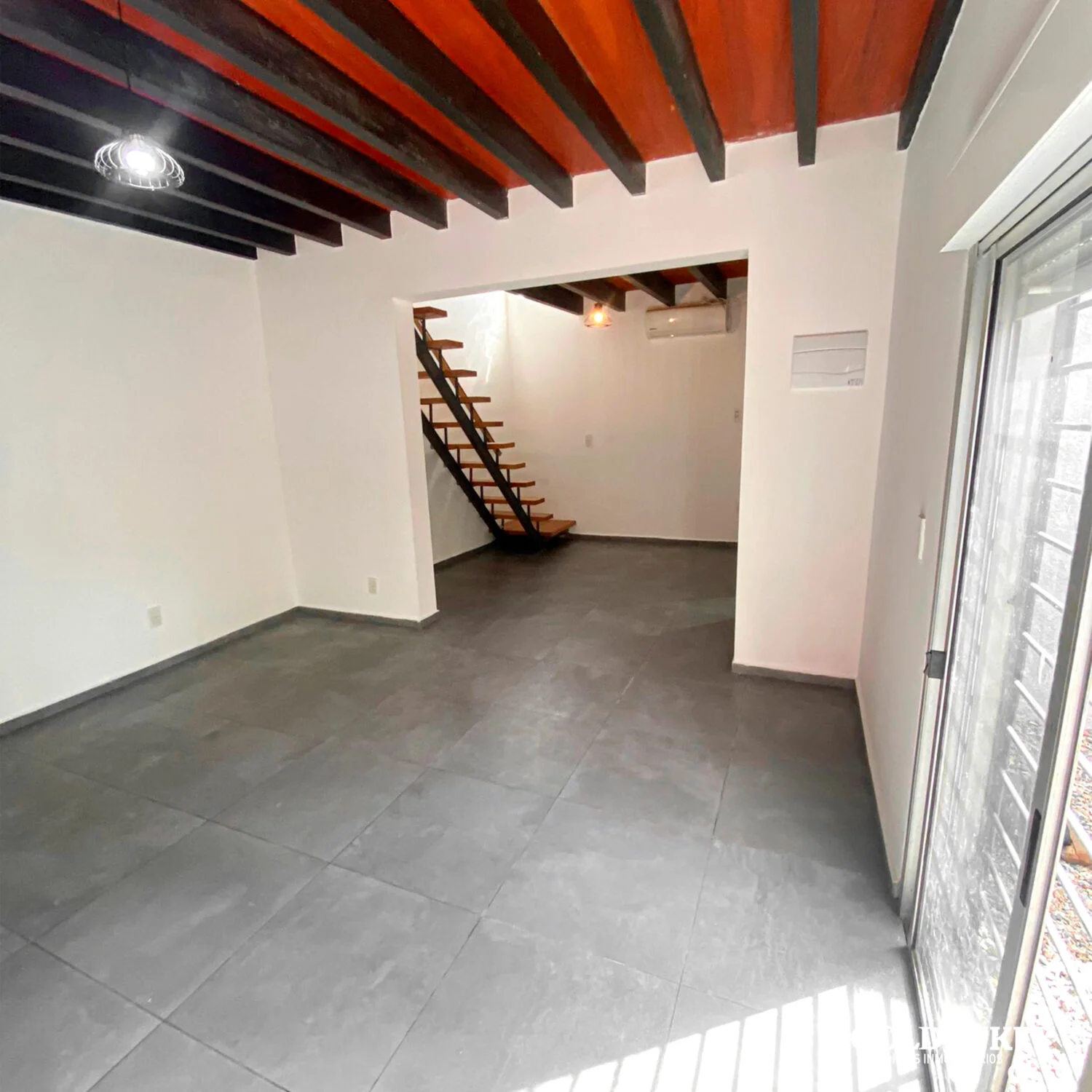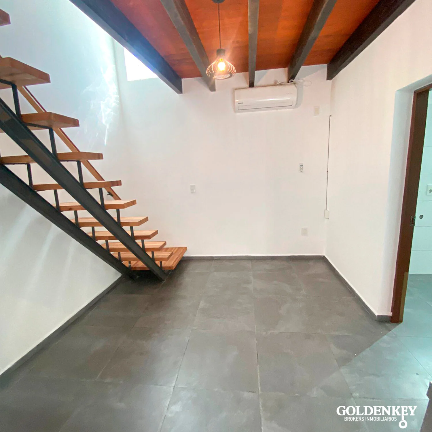 Amplia zona de Living Comedor con aire acondicionado. Escalera en madera para acceso a segunfo piso.