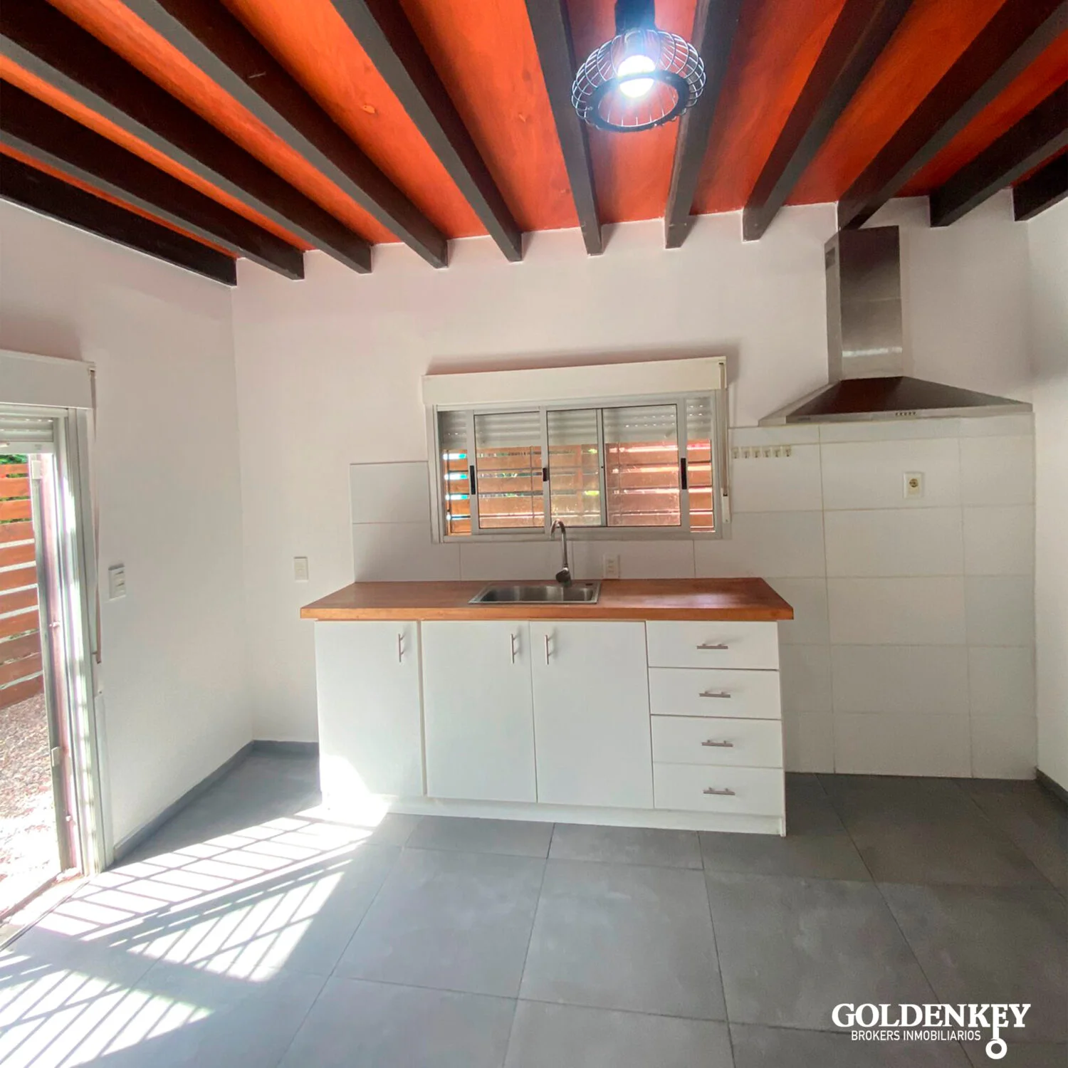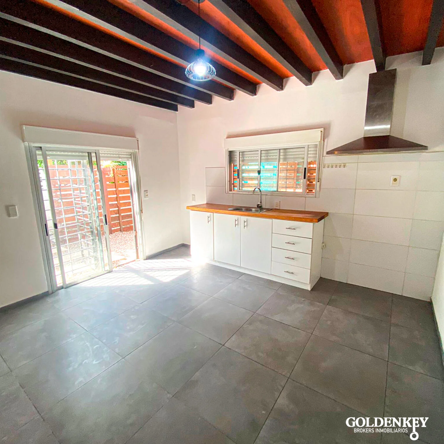 Acceso a Cocina Comedor amplia, por puerta reja y puerta ventana en aluminio.