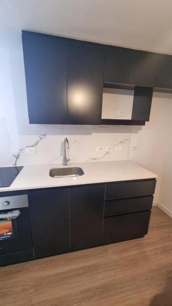 Cocina semi-definida, equipada con horno, anafe, muebles aéreos y espacio de guardado.