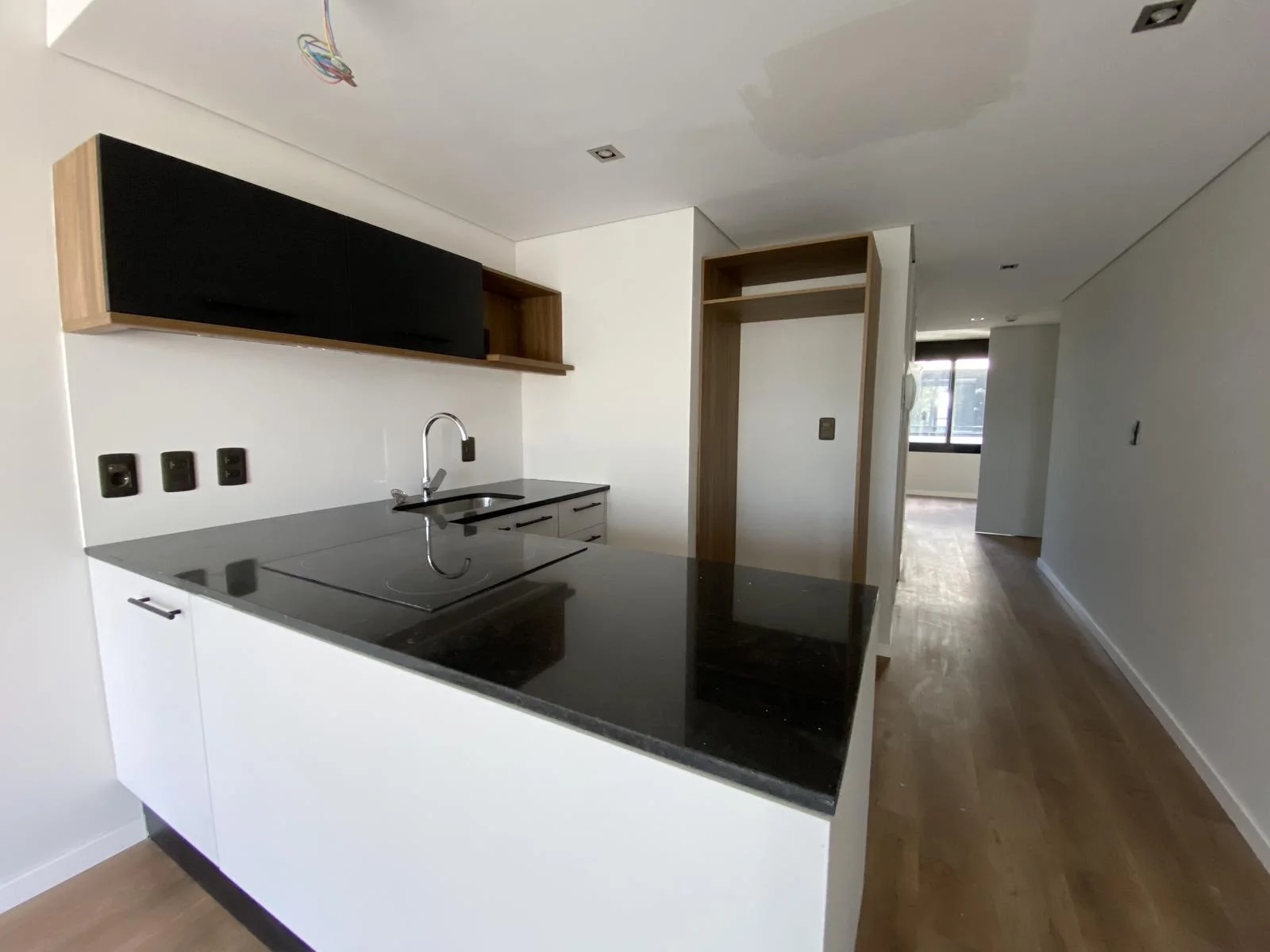 Cocina integrada de concepto abierto en forma de L, con muebles aéreos y bajo mesada de excelente calidad.