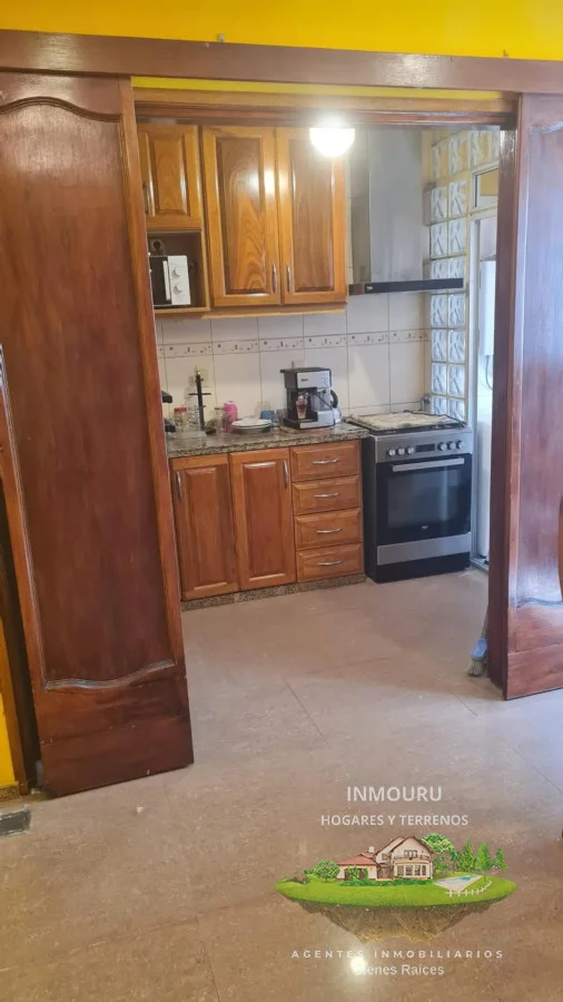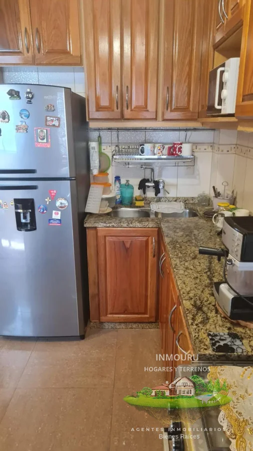 Cocina definida tiene mesada de mármol, mueble bajo mesada y aéreo, muy bien equipada y con terraza lavadero