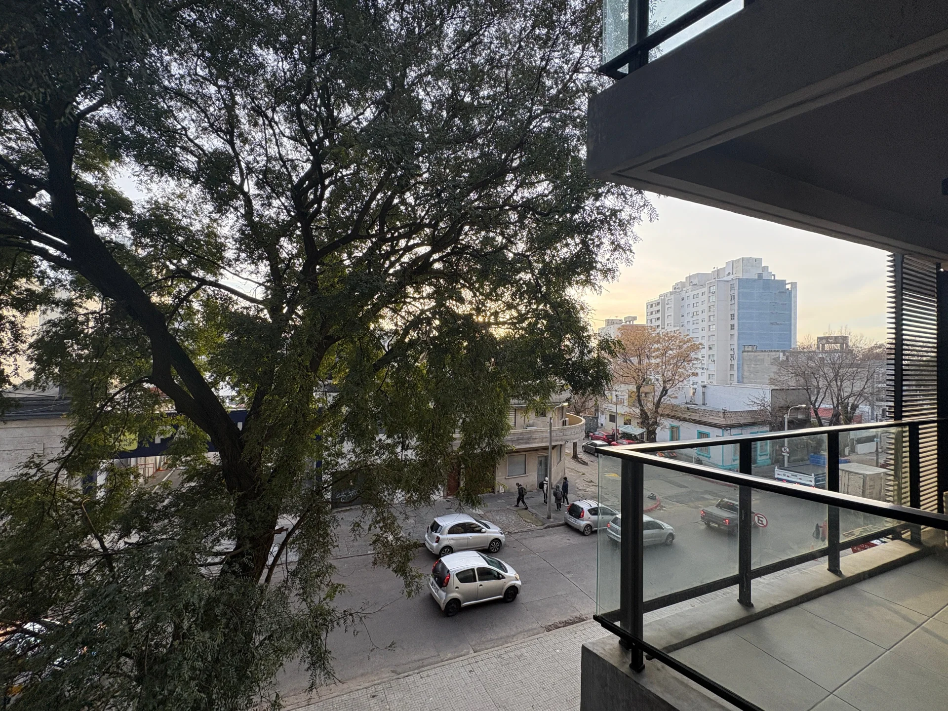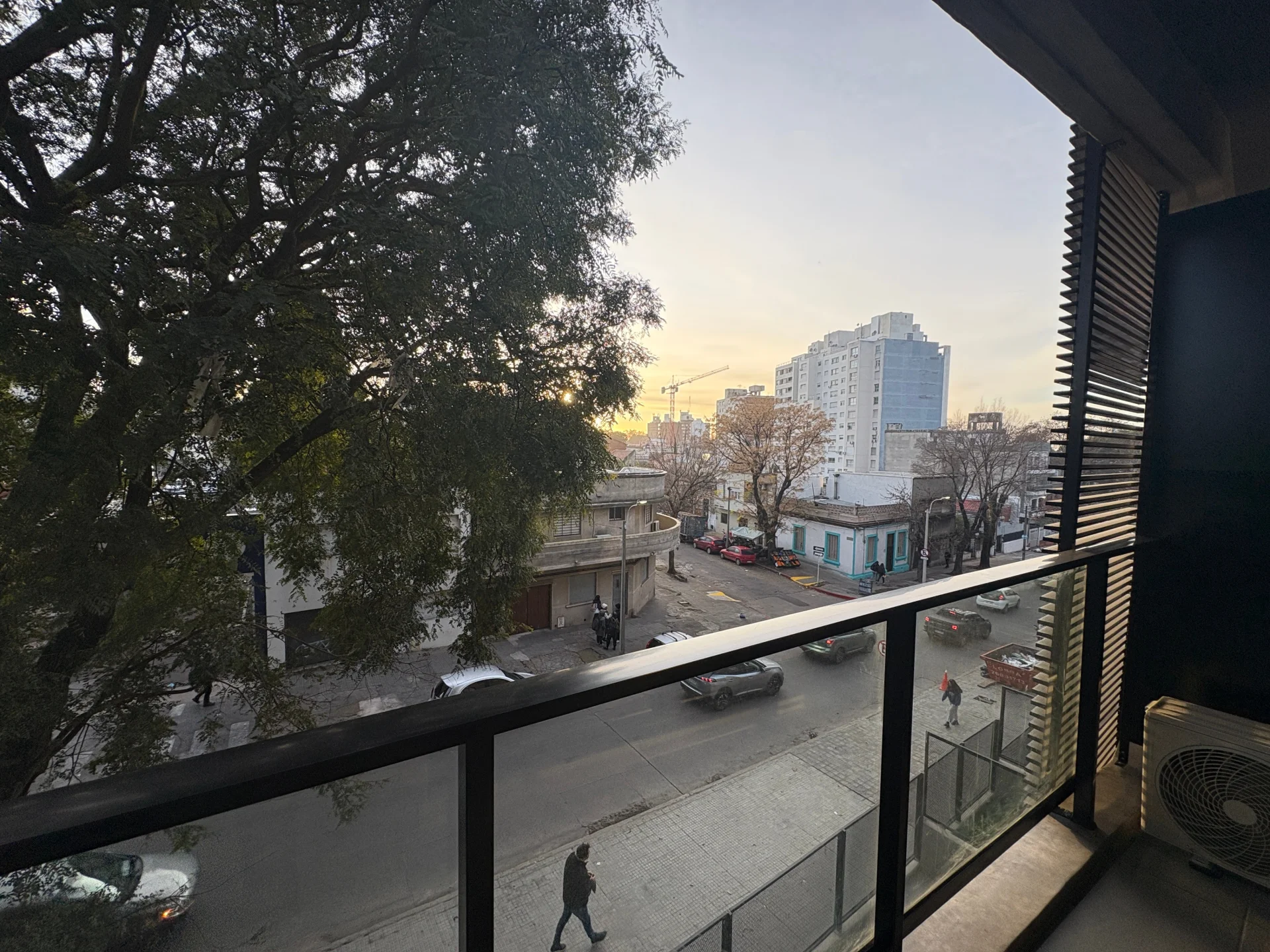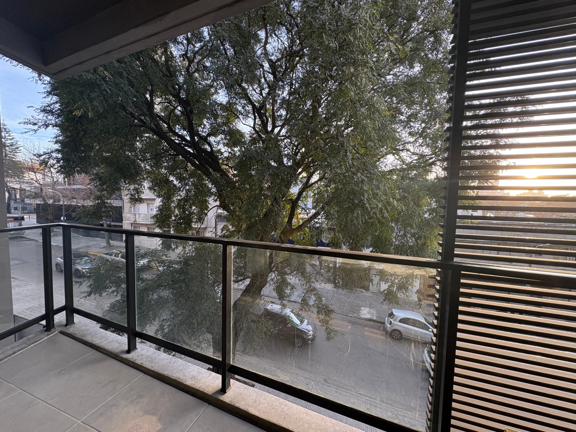 La unidad se encuentra en el segundo piso al frente, con orientación Este. Ofrece un living luminoso con aire acondicionado, balcón con vista despejada y cocina semi integrada equipada con campana extractora, placares bajo mesada y aéreos. El dormitorio cuenta con placard y un gran ventanal que aporta luz natural durante todo el día.