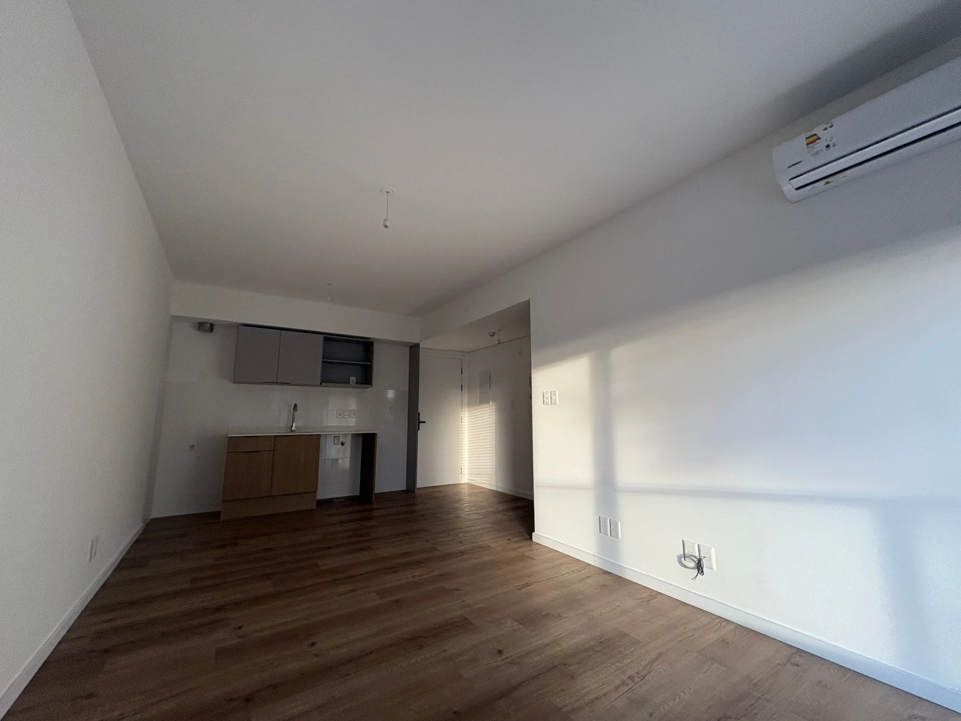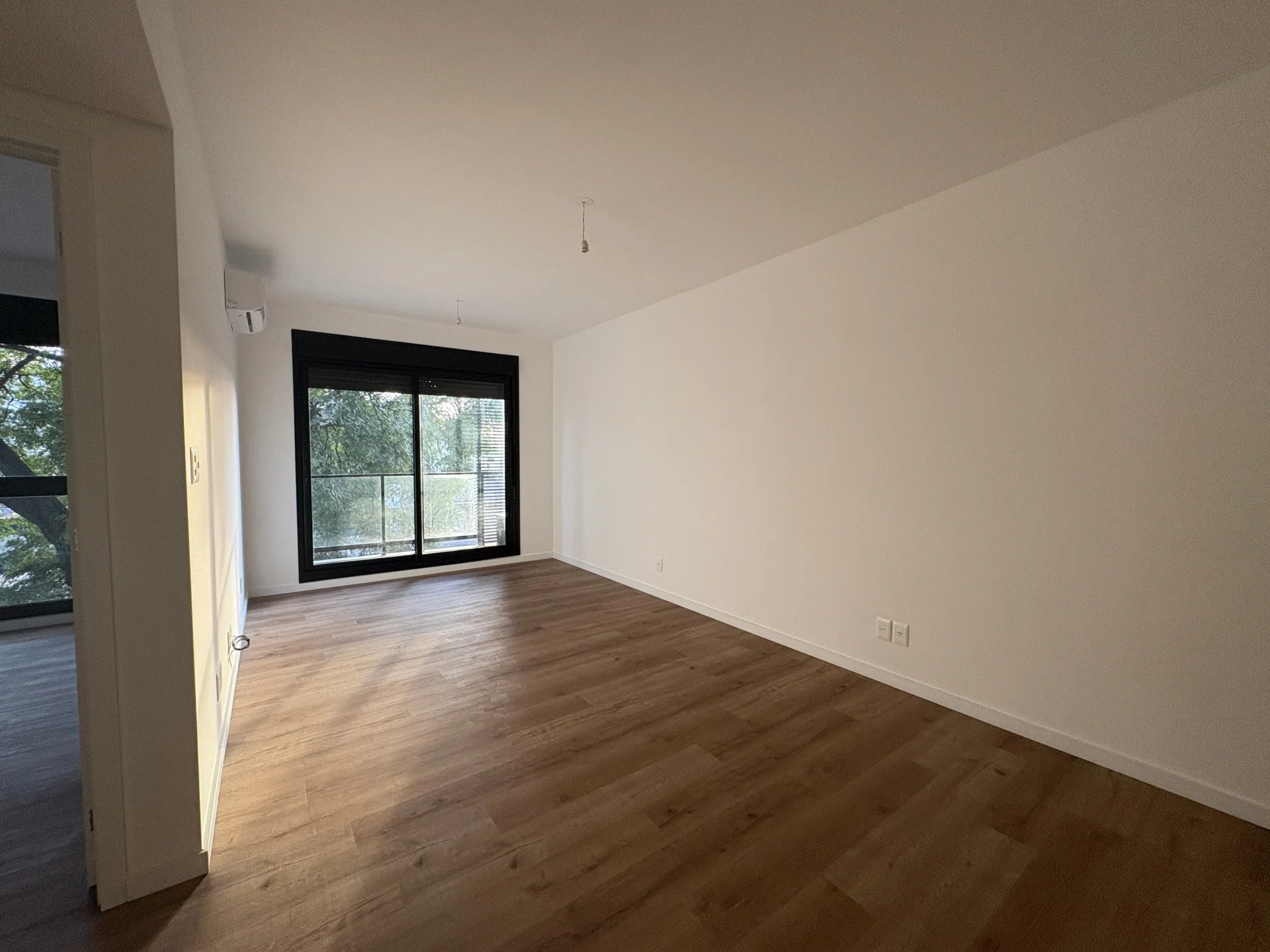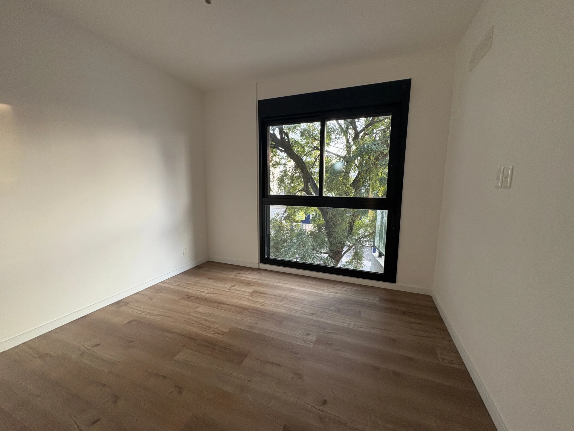 La unidad se encuentra en el segundo piso al frente, con orientación Este. Ofrece un living luminoso con aire acondicionado, balcón con vista despejada y cocina semi integrada equipada con campana extractora, placares bajo mesada y aéreos. El dormitorio cuenta con placard y un gran ventanal que aporta luz natural durante todo el día.