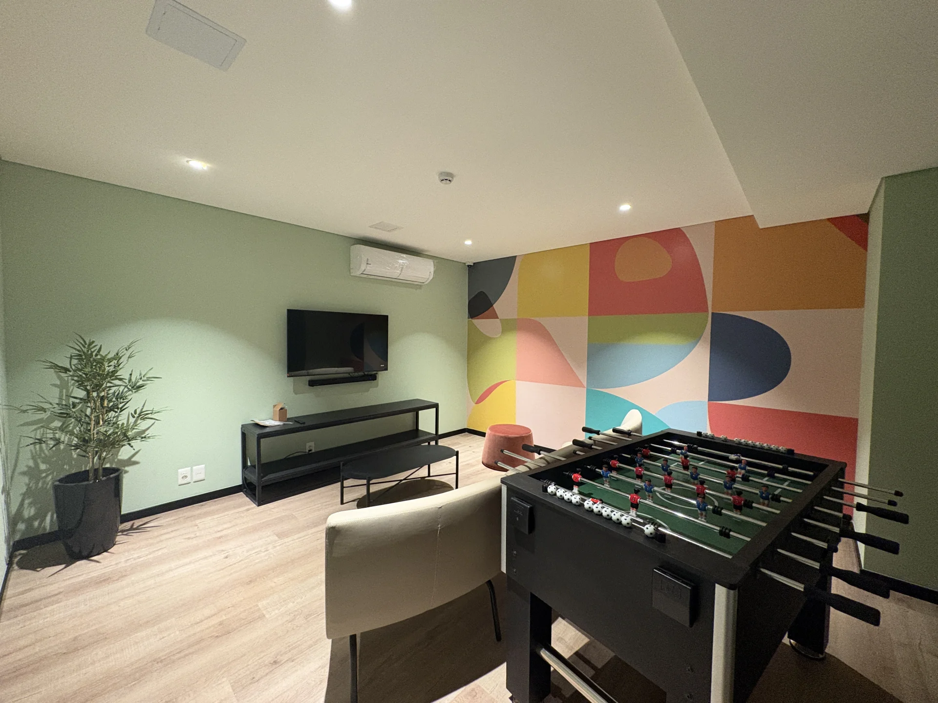 El edificio suma una propuesta completa de amenities: barbacoa con parrillero y amplia terraza, gimnasio, laundry, game room, study room, print center, cowork, meeting room, bicicletas de cortesía, smart lockers y seguridad mediante CCTV y cerradura digital.