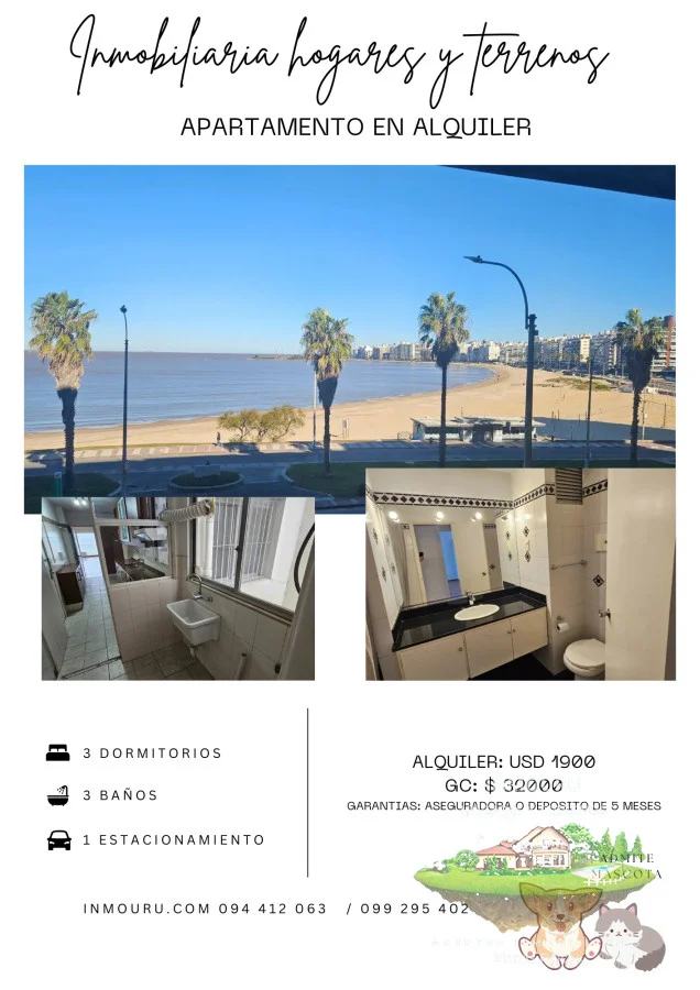 Apartamento en Pocitos - Montevideo (Rambla Republica del Perú esquina Guayaqui) Unidad de 3 dormitorios, 3 baños, cocina, living comedor, balcón. Equipamiento : Aire Acondicionado Alquiler: USD 1900 Gastos comunes : $ 32000 Garantías: Aseguradoras o 5 meses de deposito Consulte con nuestros asesores. Referencia Interna : Tera-1787