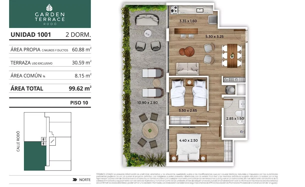 La unidad se ubica en el piso 10 al frente con vista despejada y orientación Sur.