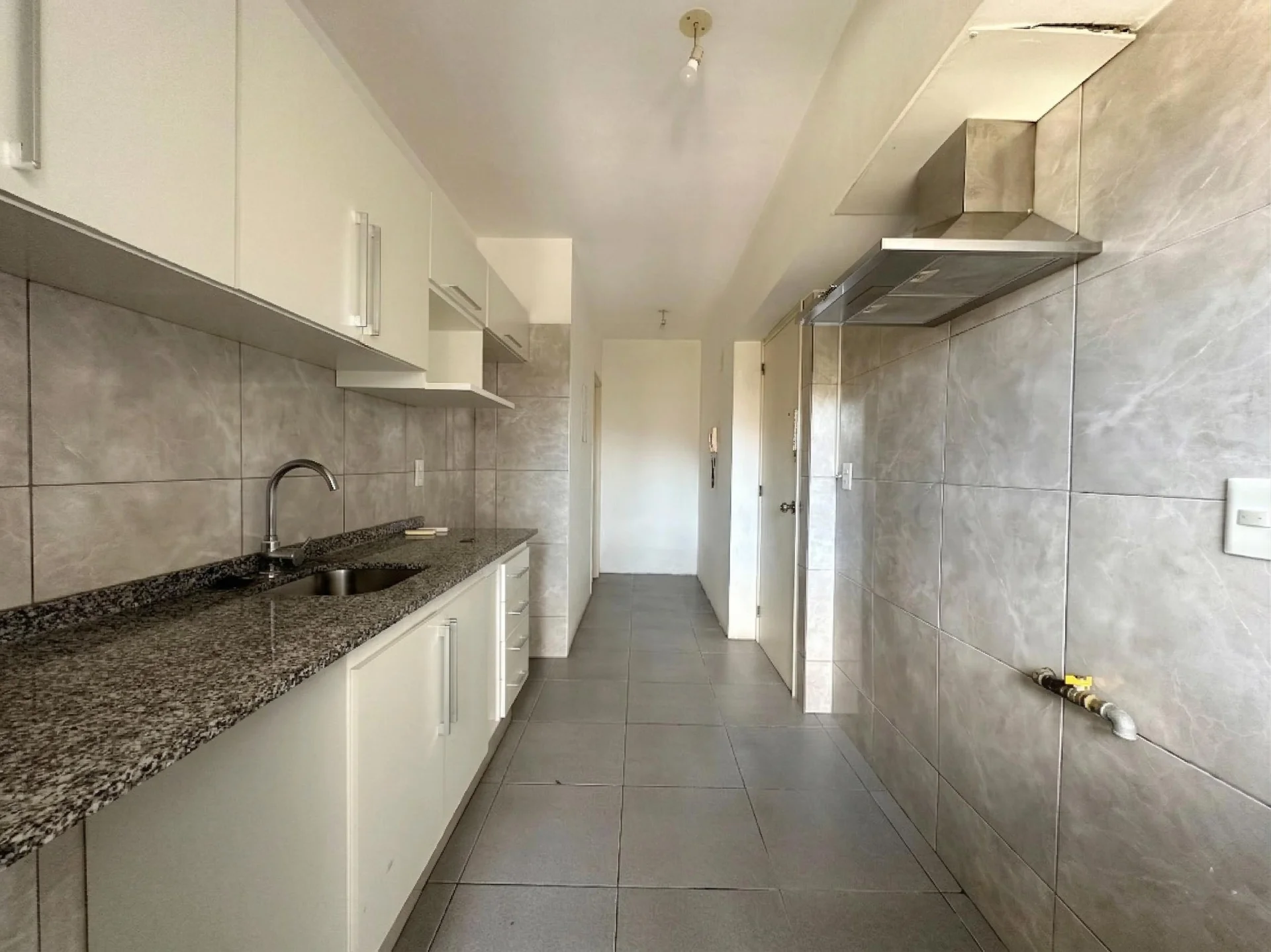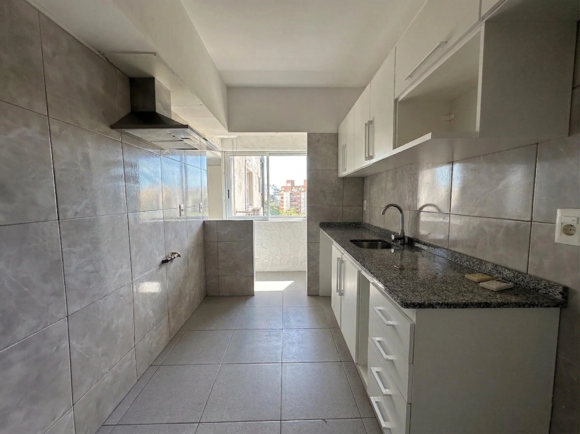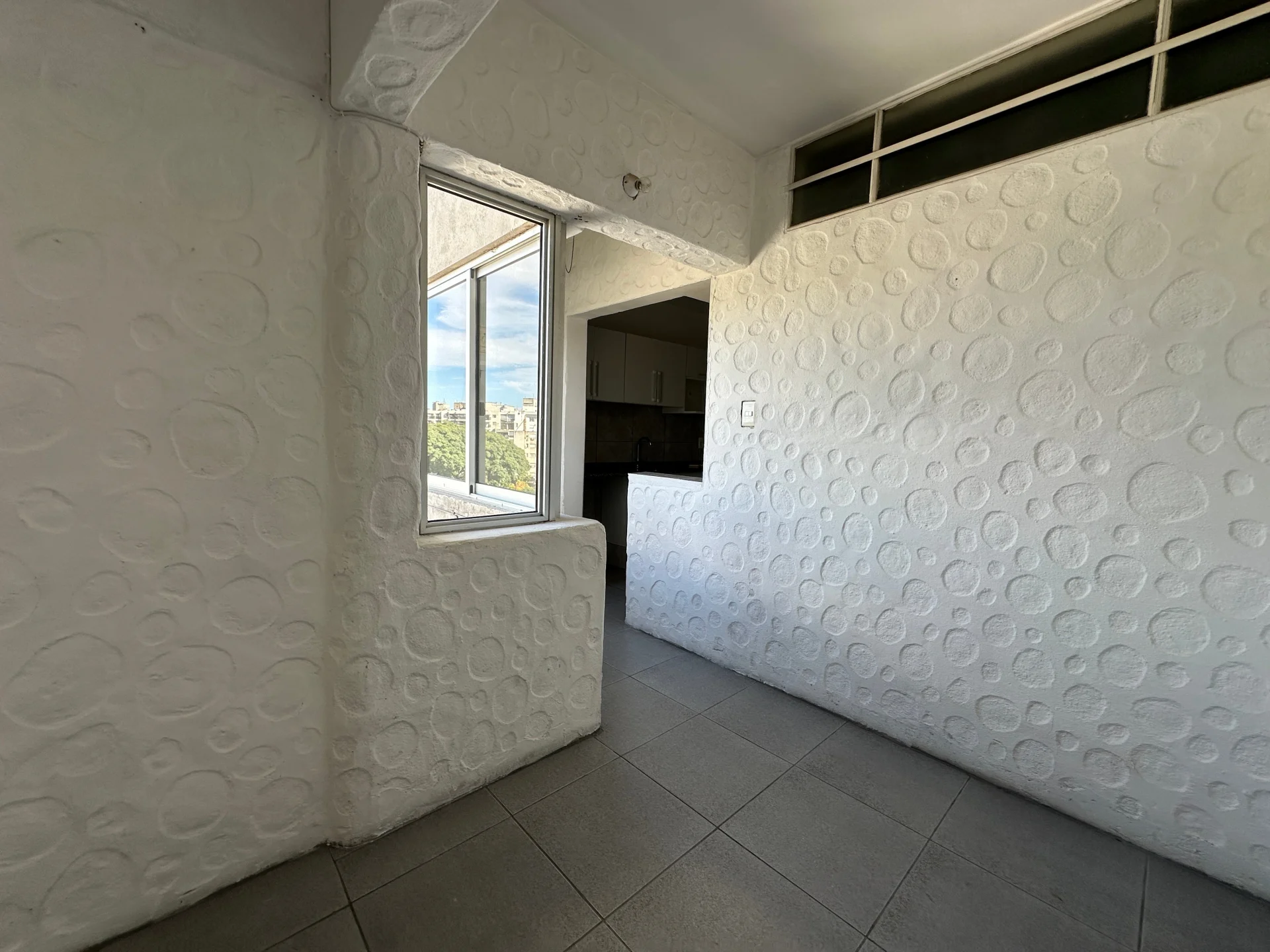 Consta de amplio living comedor al frente con acceso a terraza. Cocina con placares, campana y servicio completo con baño