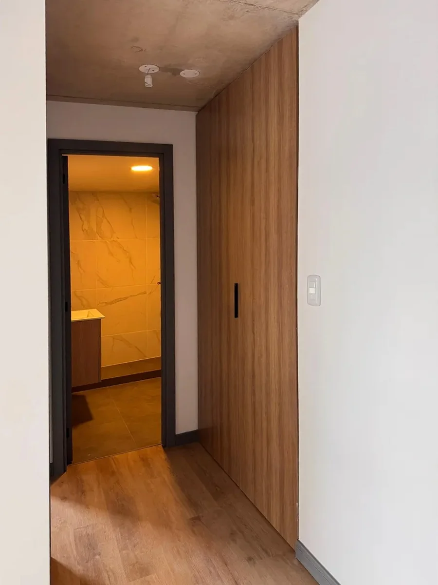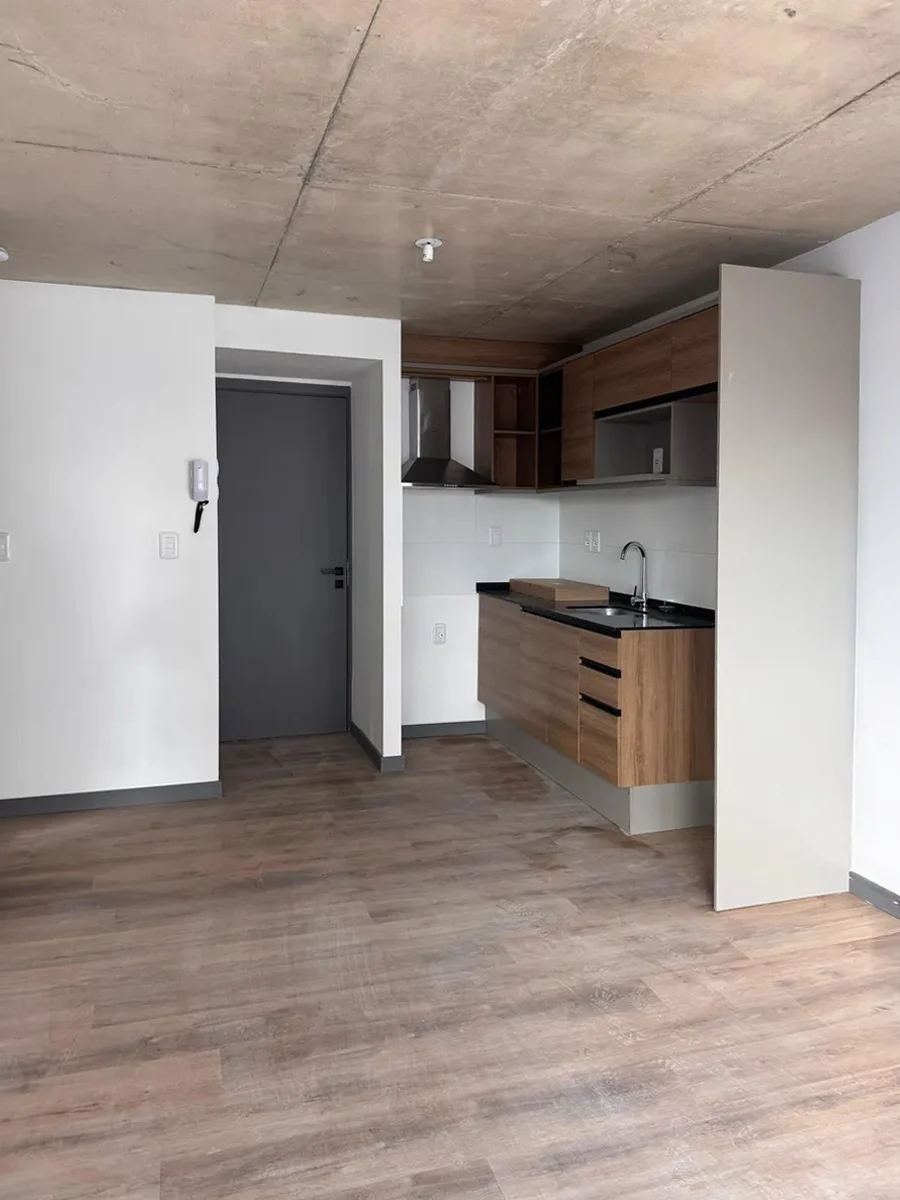 Su luminoso living comedor, ubicado en un piso alto, se caracteriza por una amplia vista despejada, complementado por un aire acondicionado que asegura un ambiente agradable en todo momento. La cocina integrada está equipada con placares bajo y sobre mesada y cuenta con una campana de extracción, brindando funcionalidad y estilo. El apartamento dispone de un confortable dormitorio con placard y un baño completo con mueble bajo mesada. Además, un pasillo con placard ofrece un valioso espacio extra de almacenamiento.