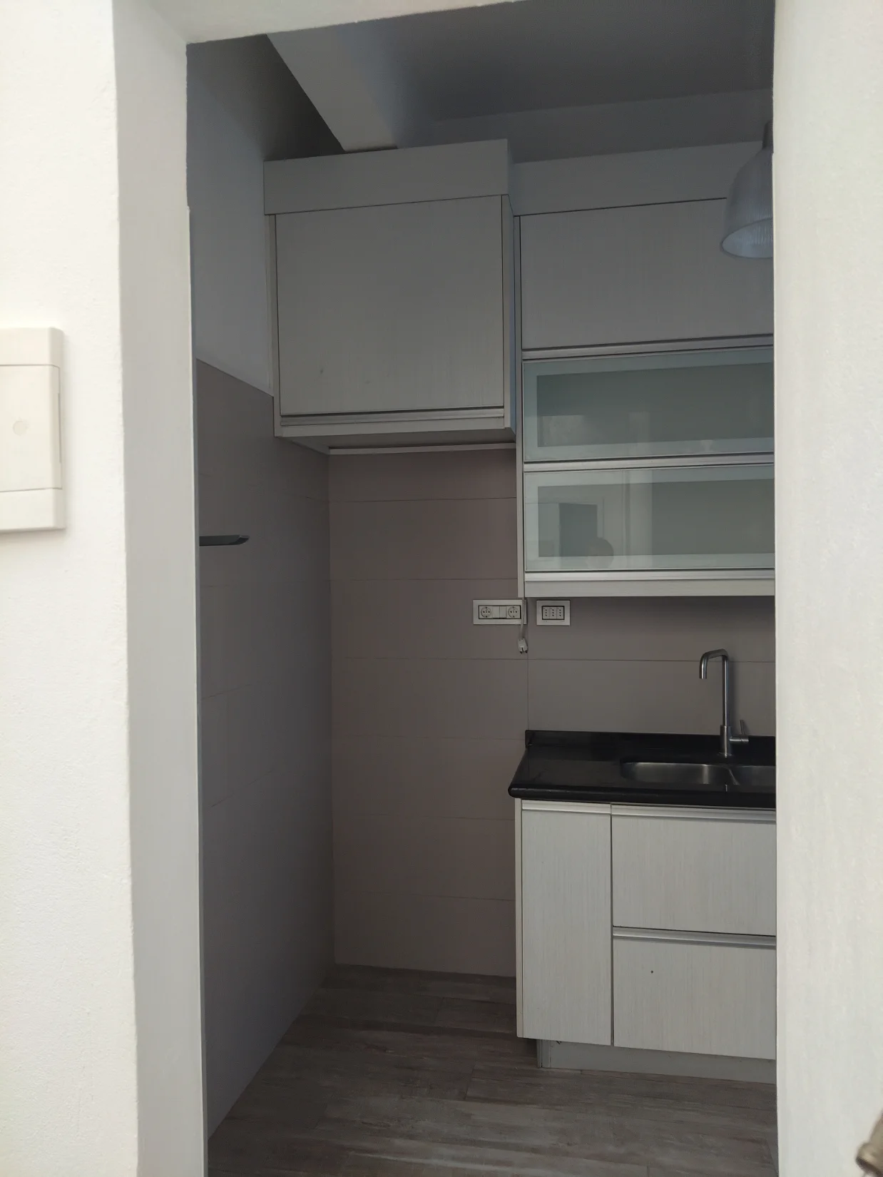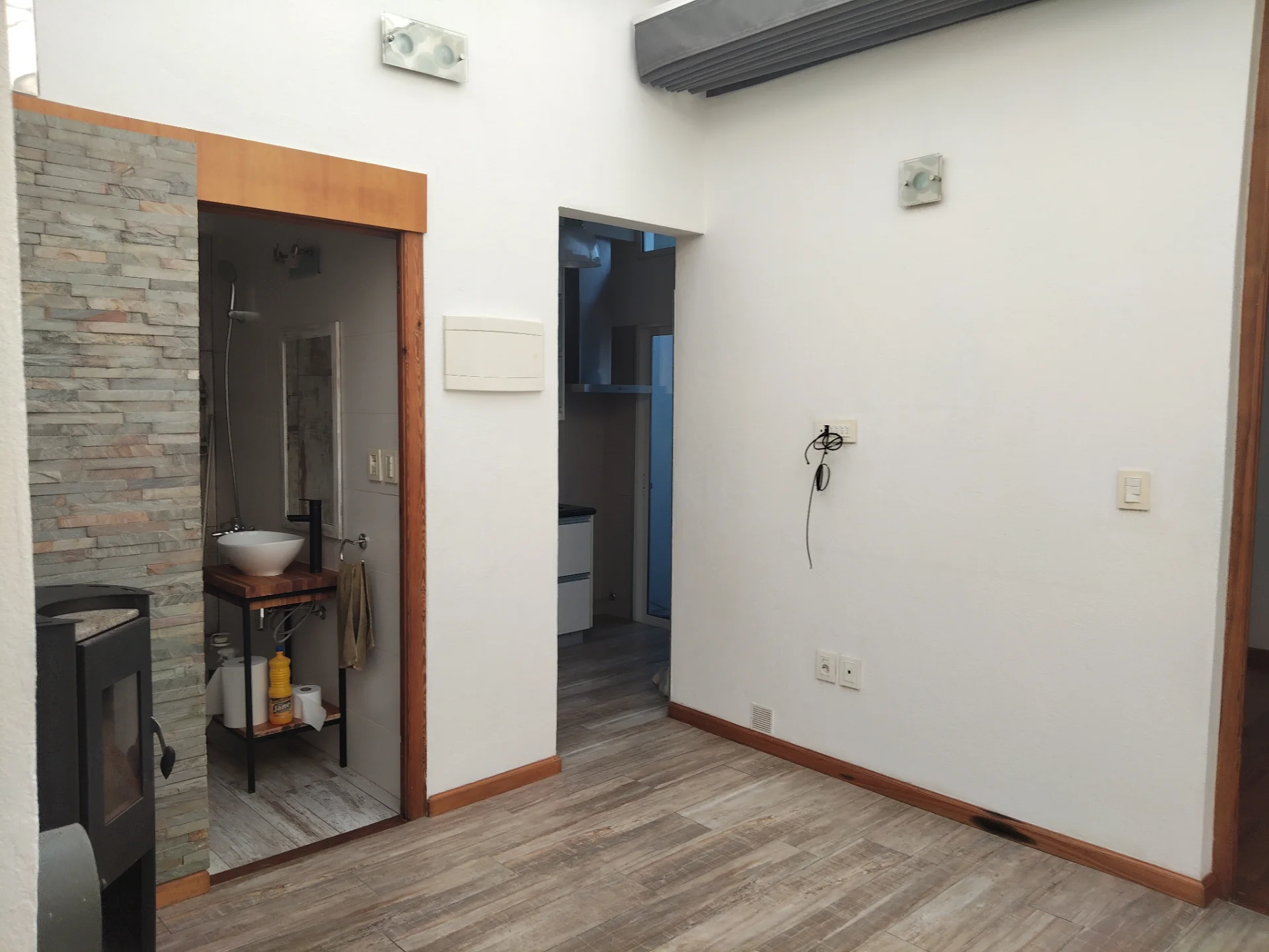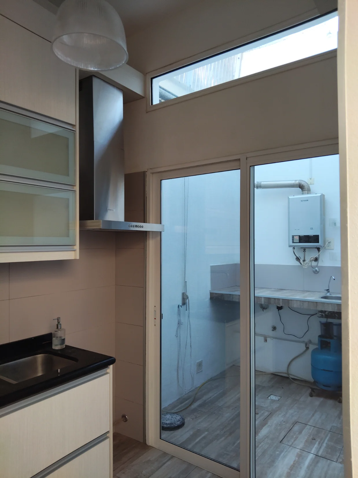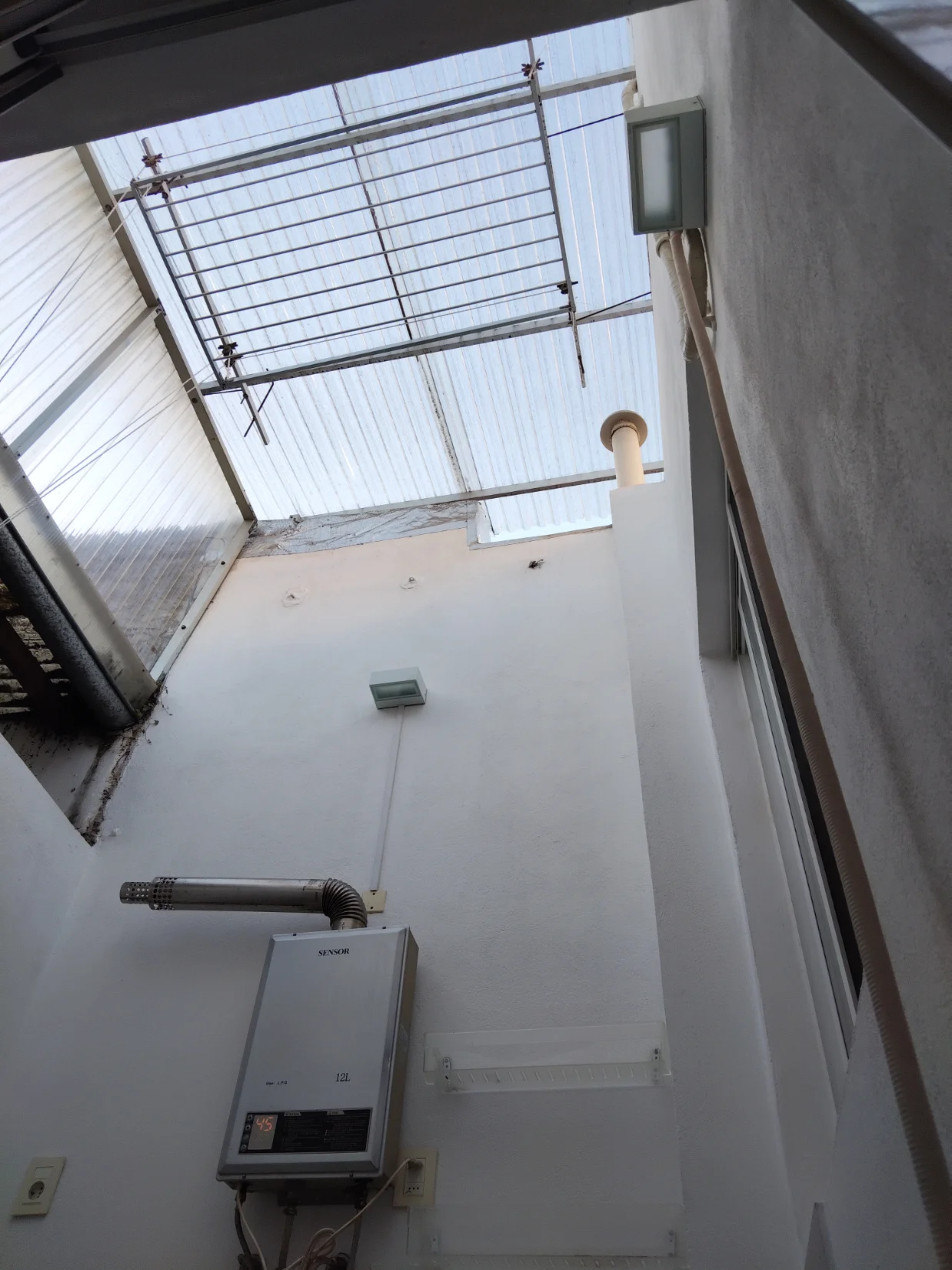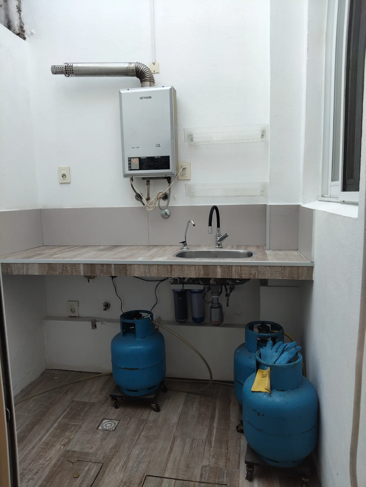 Pequeño patio techado con caldereta a gas para el agua caliente (3 garrafas), purificador de agua bajo mesada y tender.