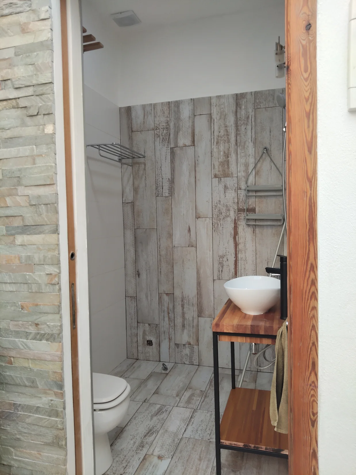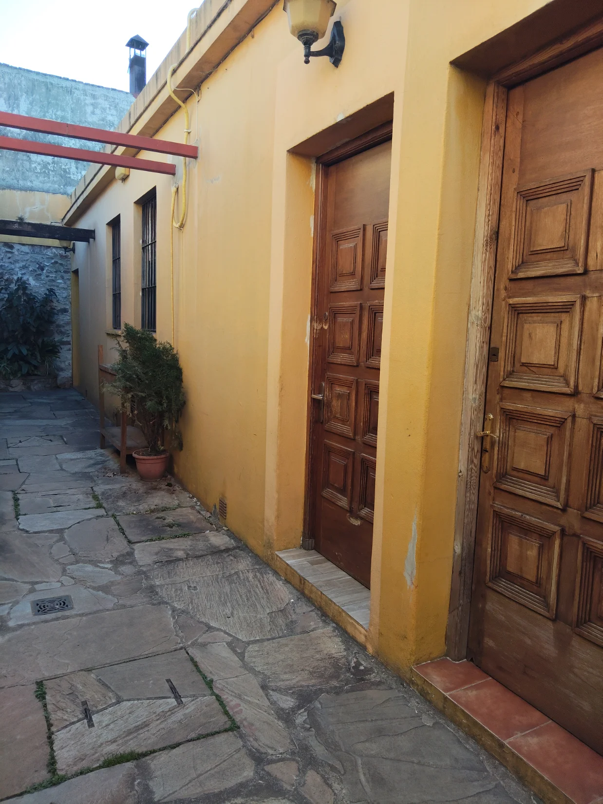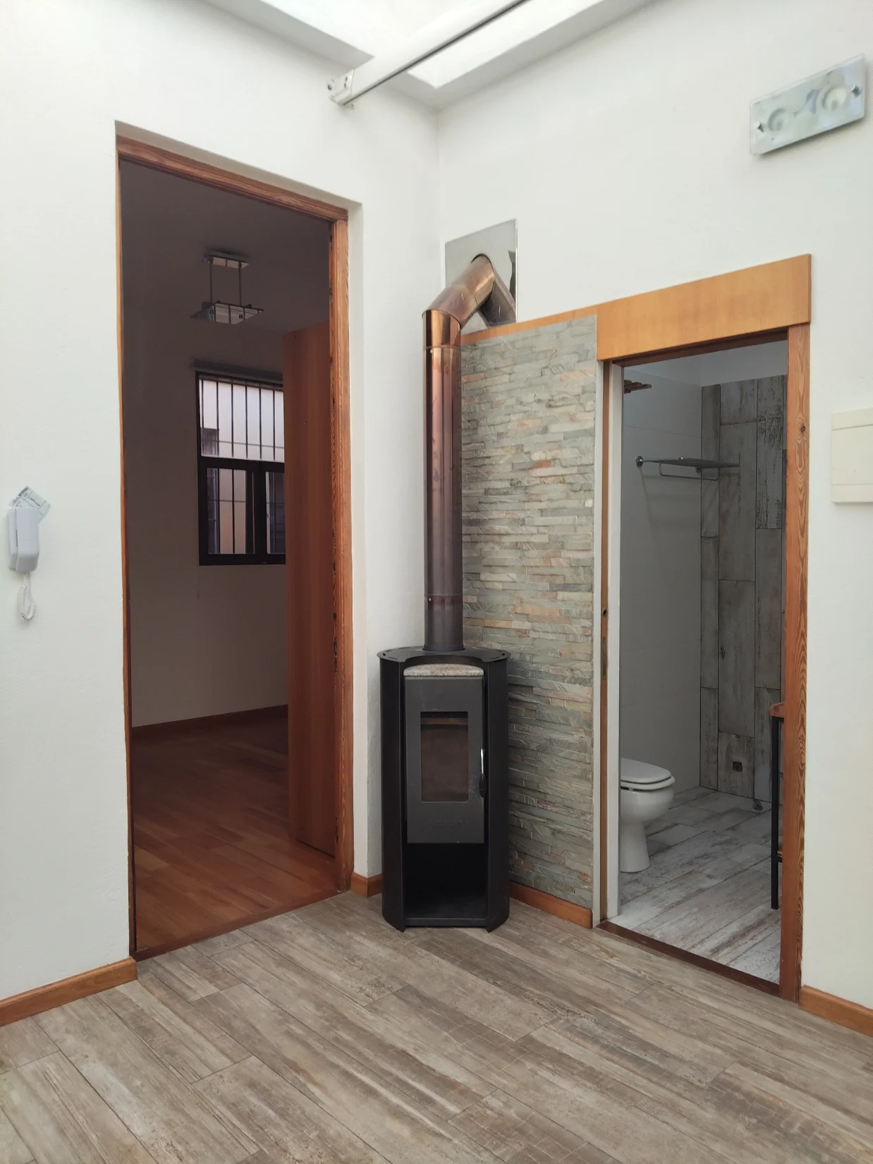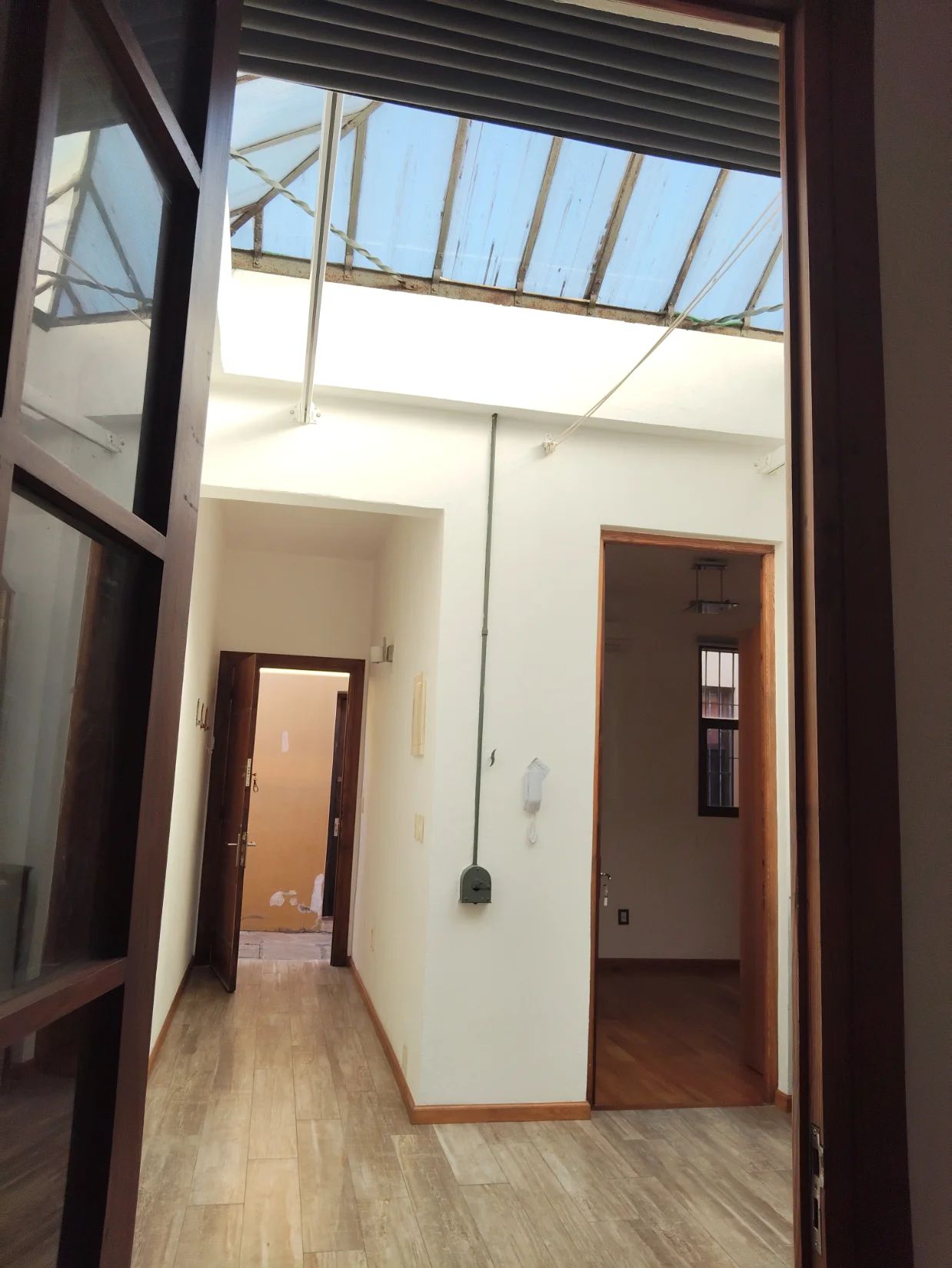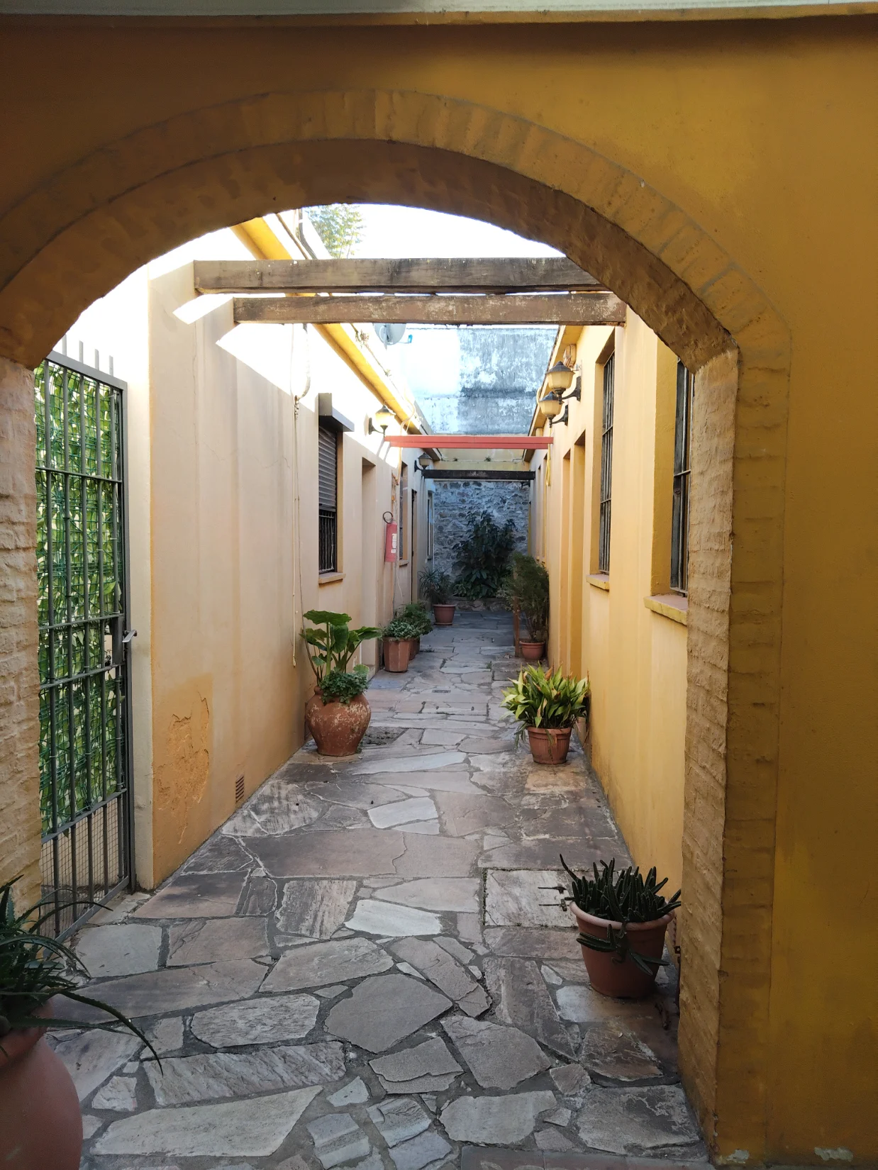 Pequeño patio techado con caldereta a gas para el agua caliente (3 garrafas), purificador de agua bajo mesada y tender.