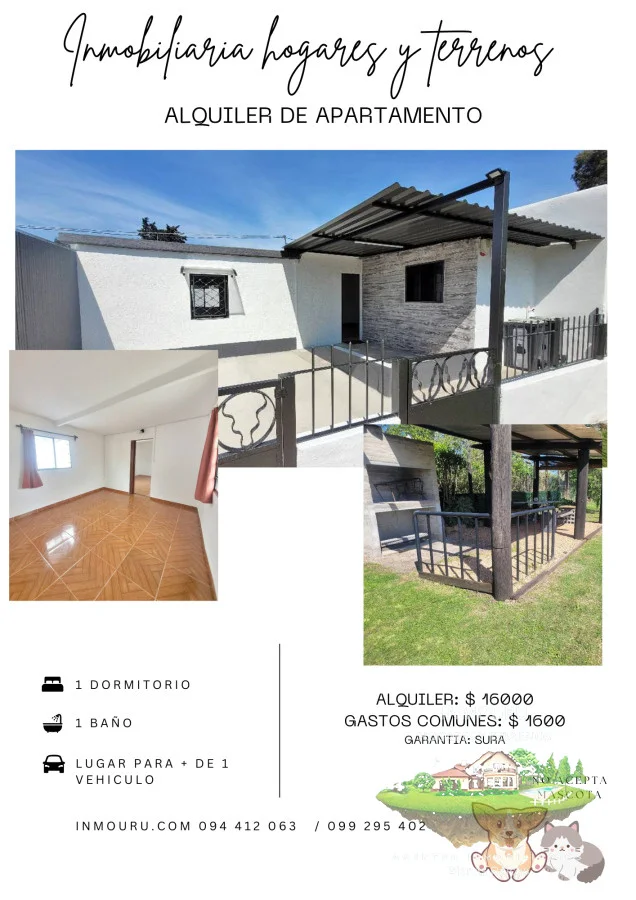 Apartamento en Paso de la Arena - Montevideo (La Deligencia esquina Ideario Artiguista) Unidad de: *1 Dormitorio *1 Baño *Cocina *Living Comedor *No acepta mascota Alquiler: $ 16000 Gastos comunes : $ 1600 ((Jardinería , mantenimiento de zonas en comun, iluminación , impuesto municipal.) Garantía: Aseguradora (Preferible Sura) Consulte con nuestros asesores. Referencia Interna : Tera-1910