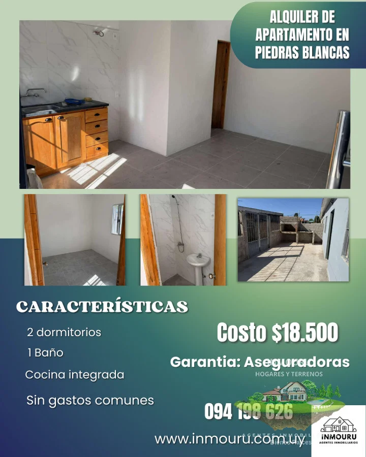ALQUILER DE APARTAMENTO A ESTRENAR – PIEDRAS BLANCAS ???? Ubicación: Arq. Carlos Pérez Montero y Mendoza ???? Superficie: 35 m² ???? Alquiler: $18.500 ???? Sin gastos comunes ???? Garantía: Aseguradoras Cuenta con: ✅ 2 dormitorios ✅ Cocina integrada ✅ Baño completo ✅ Patio independiente ✅ Totalmente Cerrada Honorarios: 1 mes de alquiler agente Vanesa Referencia Interna : Tera-1958