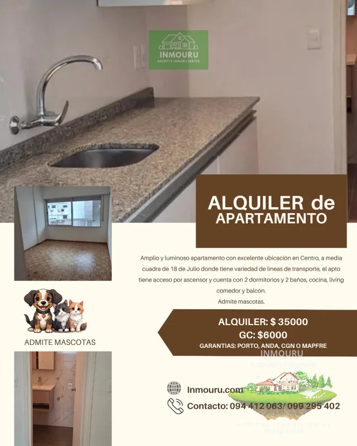 Apartamento en Centro Montevideo - Montevideo (Paraguay esquina Colonia) Unidad de 2 dormitorios, 2 baño, cocina, living comedor, balcón. Equipamiento : Aire Acondicionado Alquiler: $ 35000 Gastos comunes : $ 6000 Aseguradoras: Porto, Anda, CGN o ,Mapfre Consulte con nuestros asesores. Referencia Interna : Tera-2053