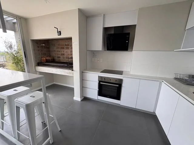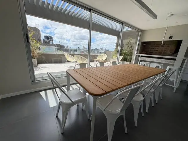 Espacio comodo luminoso con gran ventanal, cocina semi integrada y barra divisora.