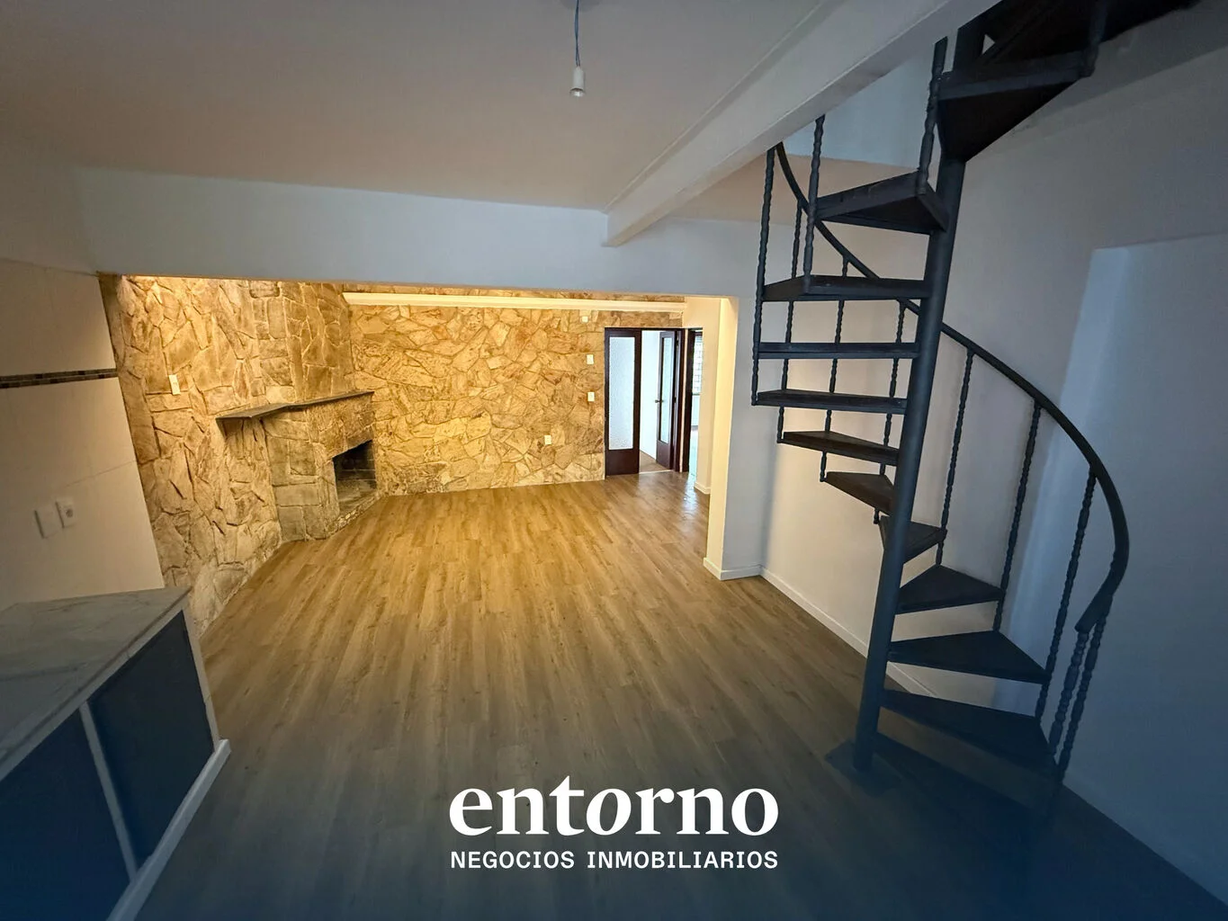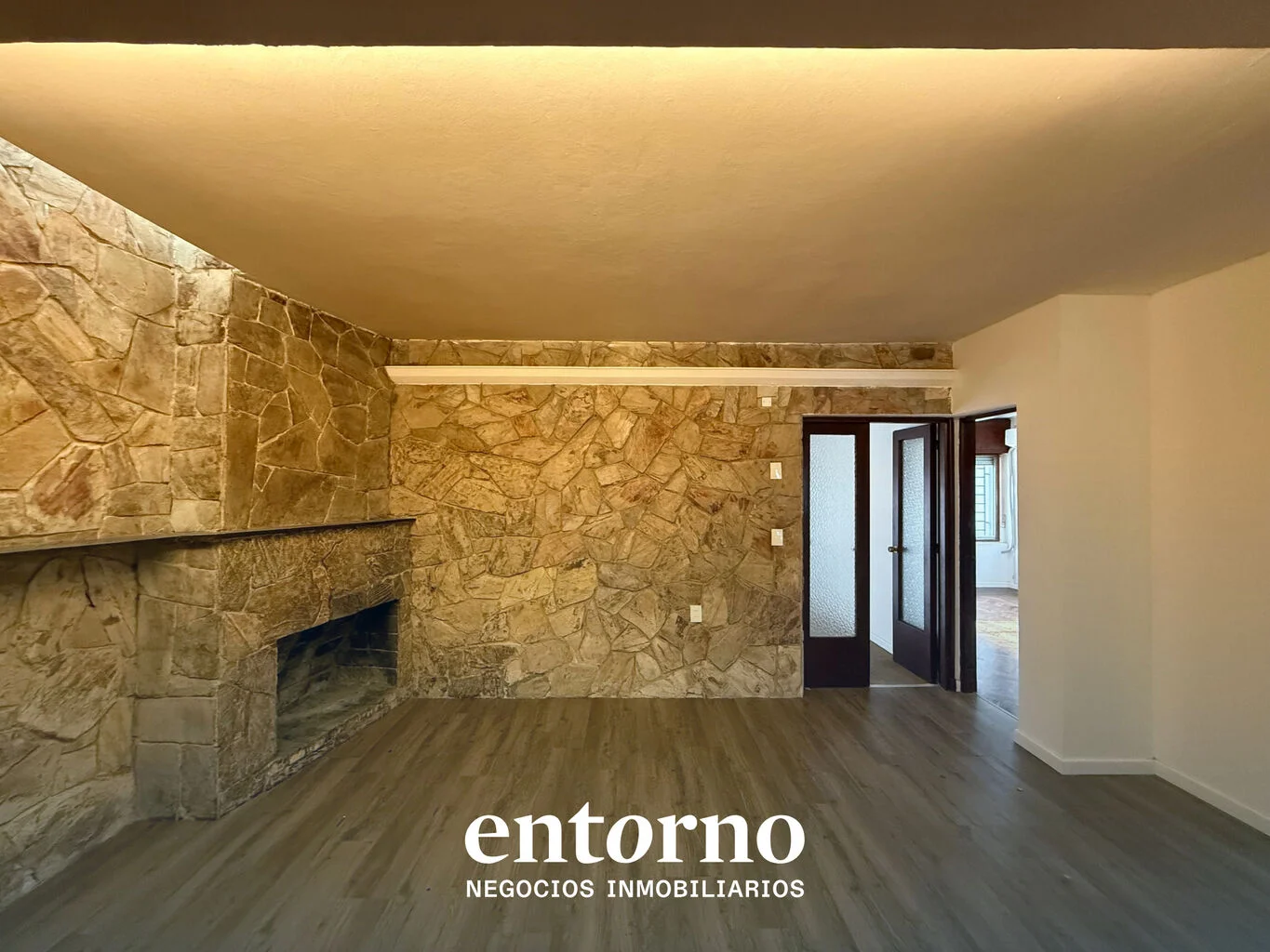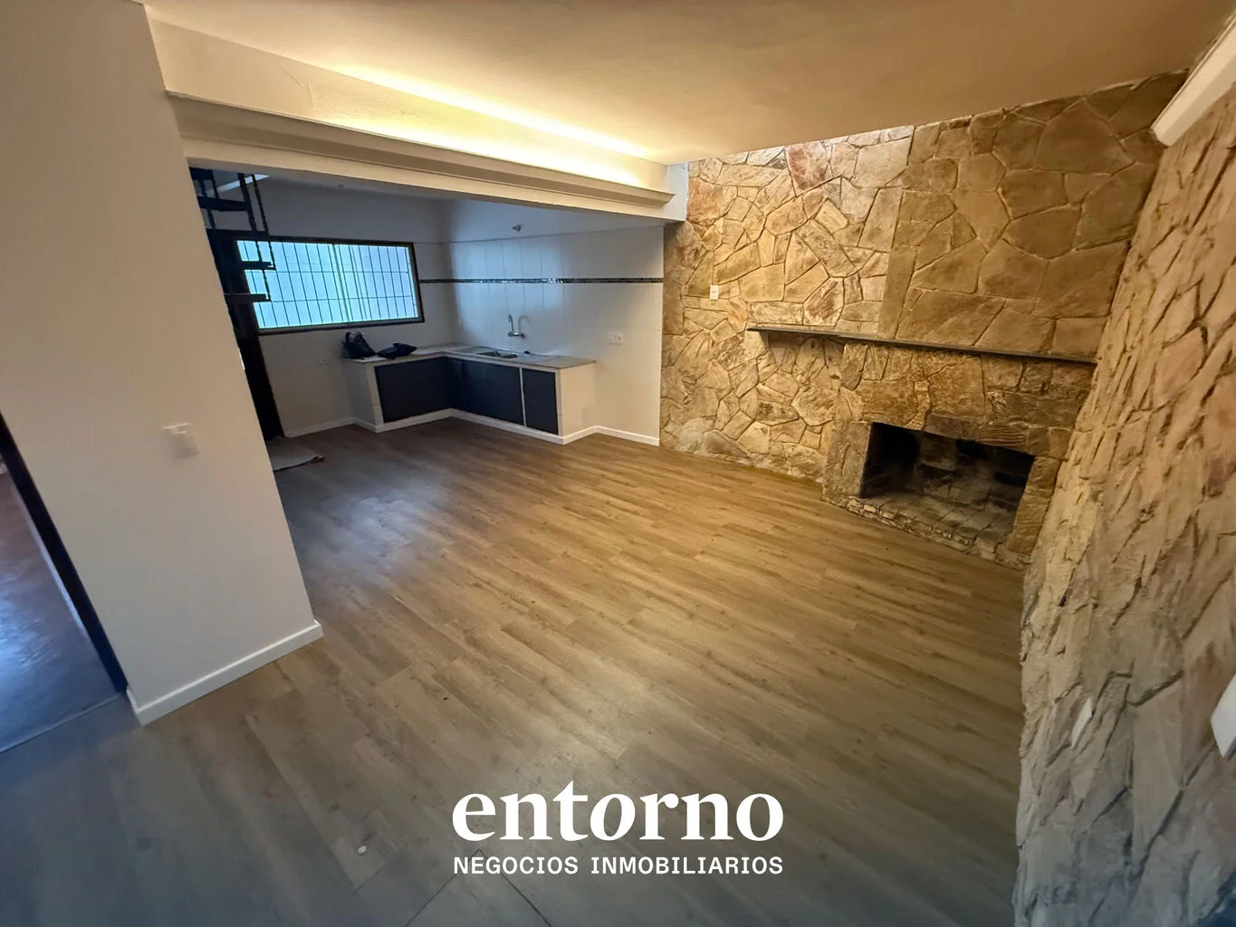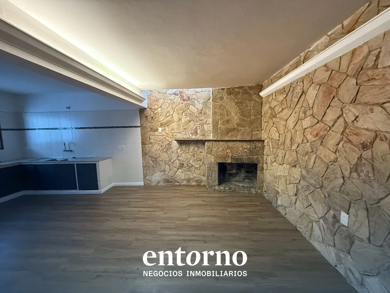 - Gran ambiente con estufa a leña y cocina integrada, perfecto como área social o recepción.