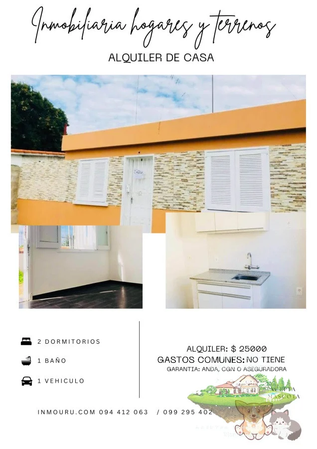 Casa en Cerro - Montevideo (a metros de Carlos María Ramírez) Cuenta con 2 dormitorios, 1 baño, cocina, living comedor, patio (el agua es compartida con 4 apto, la luz si es individual), acepta mascota. Alquiler: $ 25000 Garantías: Anda, CGN o aseguradora. Fotos brindadas por el propietario Honorarios profesionales 1 mes de alquiler + IVA Agente Natalia Consulte con nuestros asesores. Referencia Interna : Tera-1832