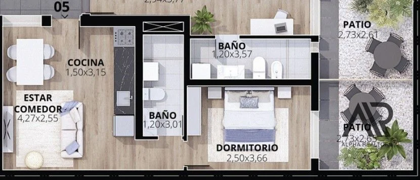 • 36,4 m² interiores + 7,3 m² de patio privado