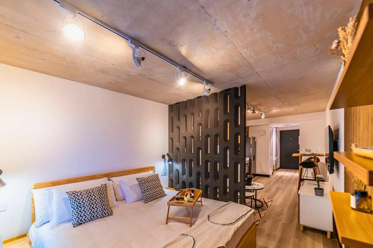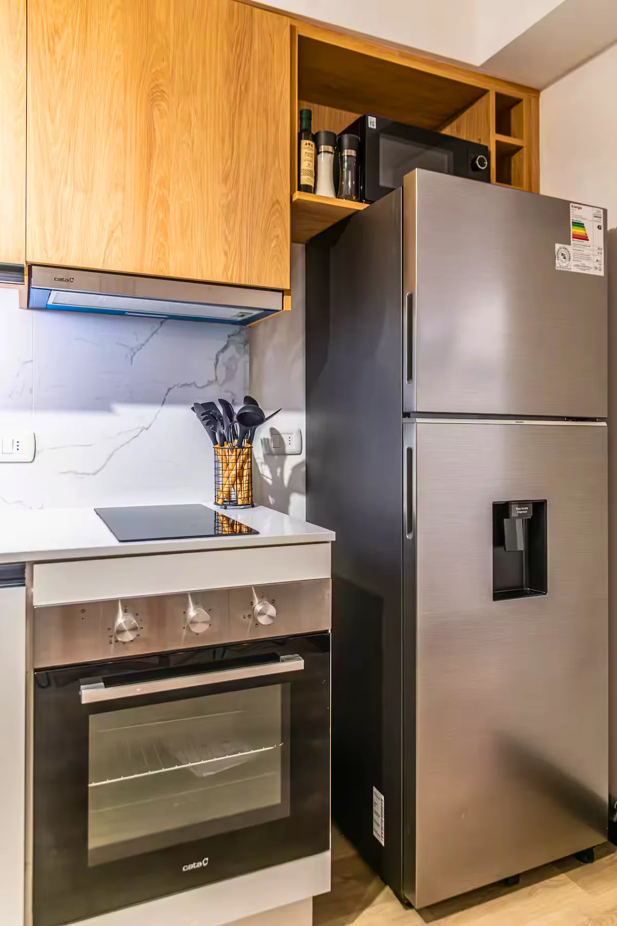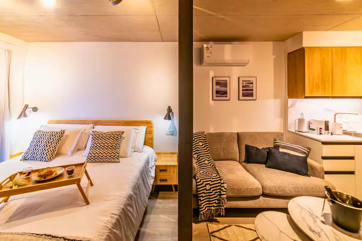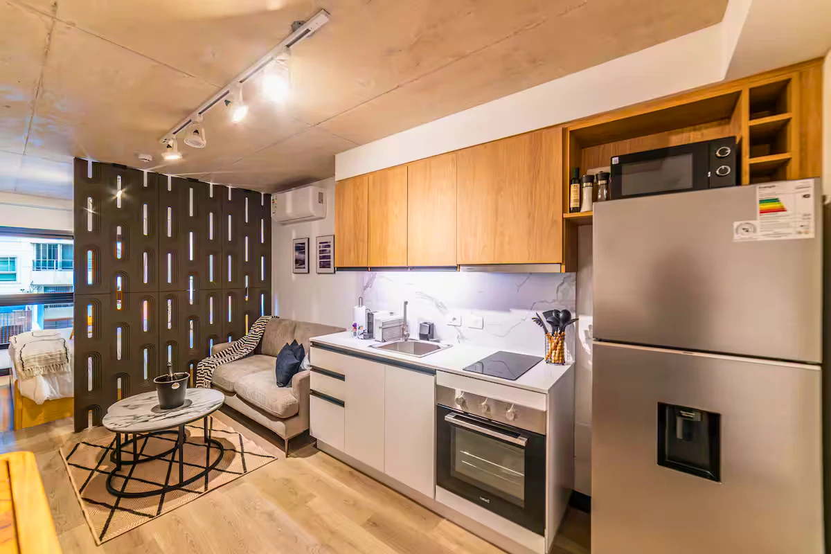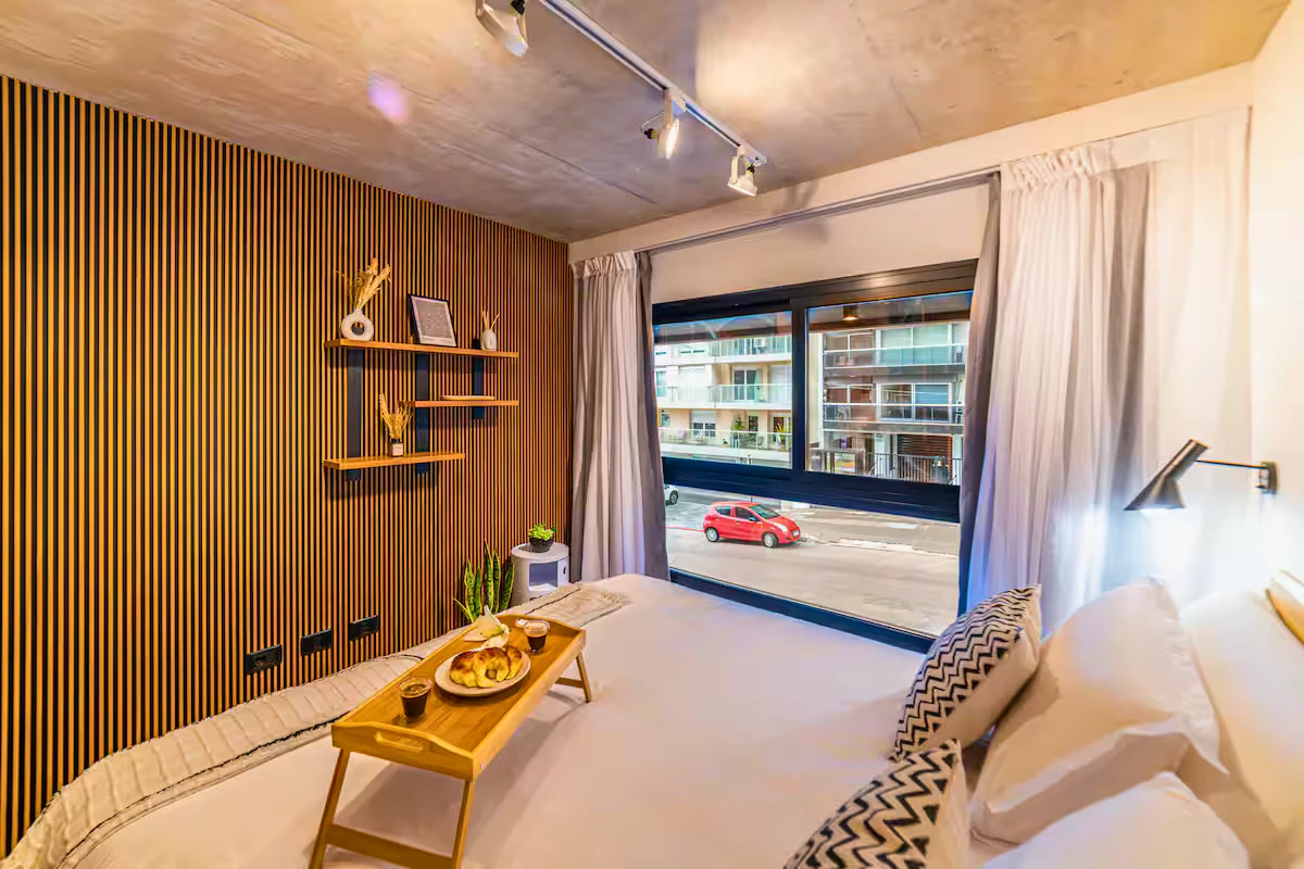 • Cama ubicada frente al ventanal, living climatizado, cocina equipada y baño completo.