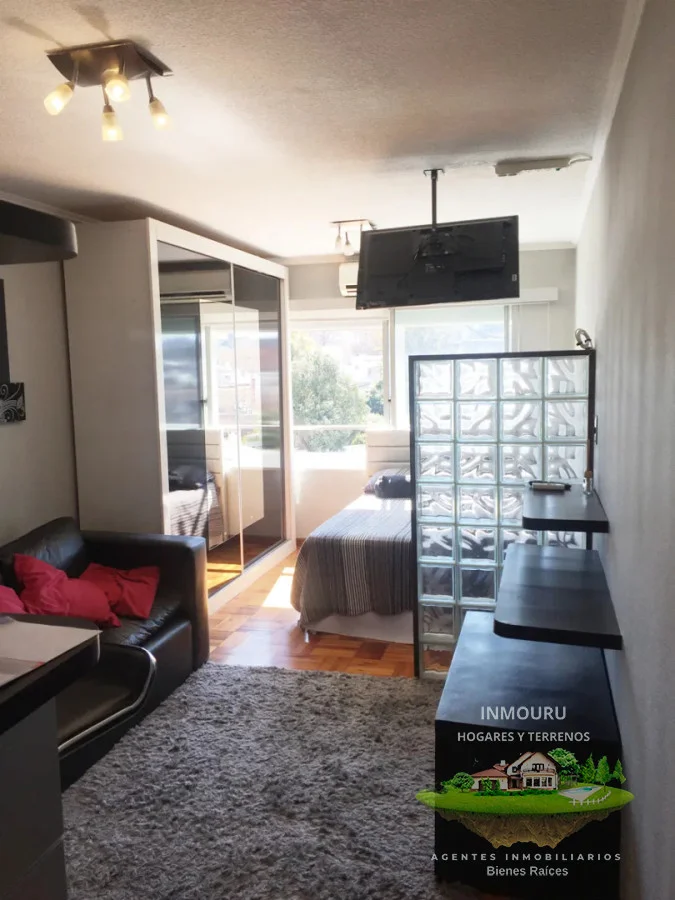 Dormitorio con amplio placar, pared de ladrillos de vidrio, cama sommier doble, cortinas roller y de enrollar. Aire acondicionado 12.000 BTU y cuerdas externas para ropa.