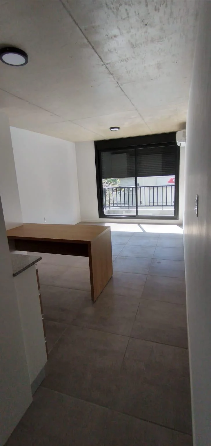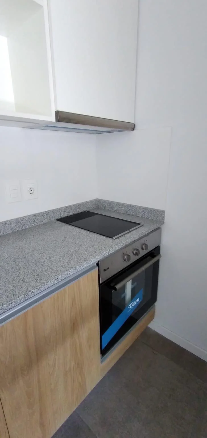 El interior se distribuye en un dormitorio con placard, una moderna cocina integrada equipada con barra, muebles bajo mesada y aéreos, horno empotrado y anafe, y un living comedor con salida directa al balcón. El baño es completo y funcional, diseñado para maximizar el confort.