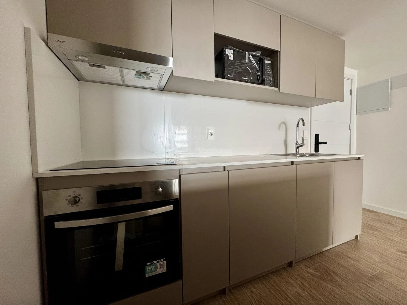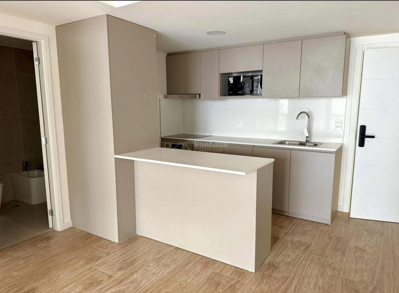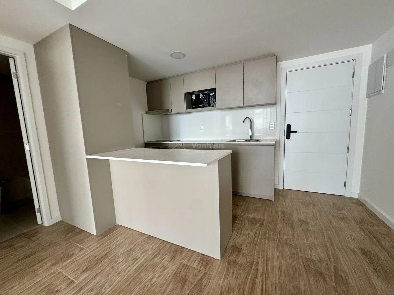 Entrada a living comedor de cómodo tamaño con cocina integrada por barra, con muy buena cantidad de armarios, ya equipada con horno, anafe, extractor y microondas.