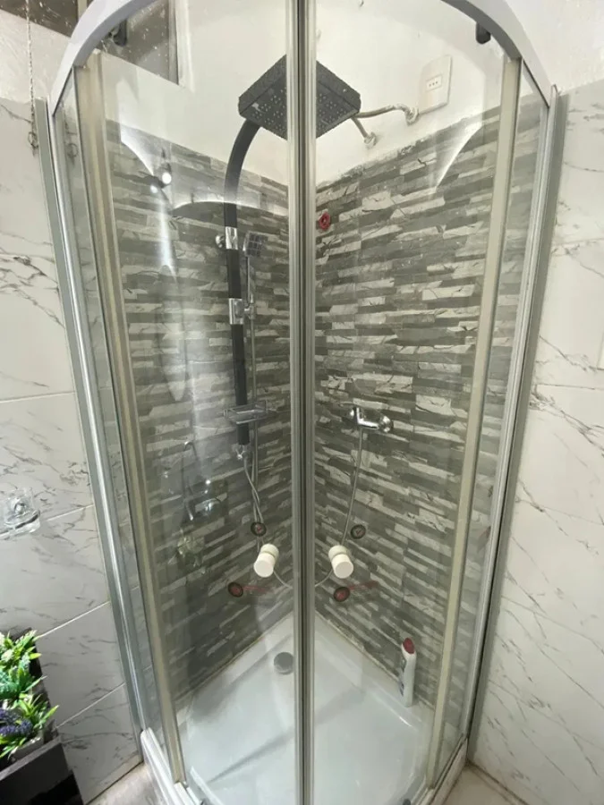 . Baño moderno con cabina de ducha, bacha de cristal y espejo con luces led