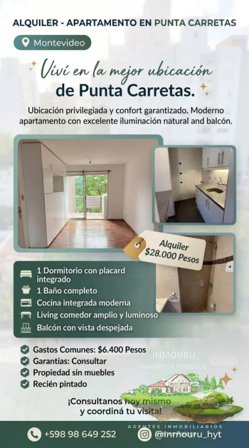 Propiedad Tipo Apartamento en Punta Carretas Ubicacion: Enrique Muñoz Piso 7 1 Dormitorios 1 Baño Living Comedor Cocina Integrada Balcón Hermosa Vista Estado: Impecable Precio Alquiler: 28000 Pesos Gastos Comunes: 6400 Pesos Garantias: Consultar. Honorarios Profesionales: 1 Mes de Alquiler + IVA Agente Valeria. Referencia Interna : Tera-2730