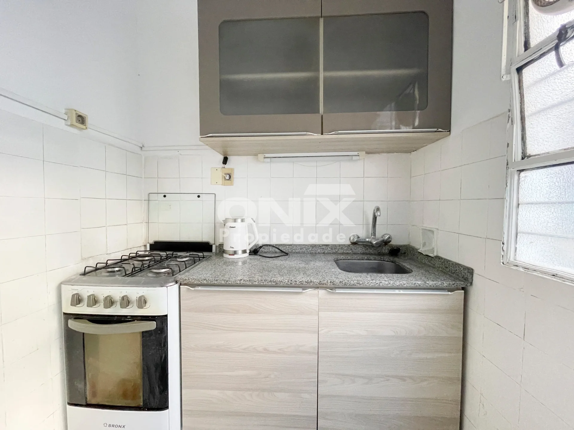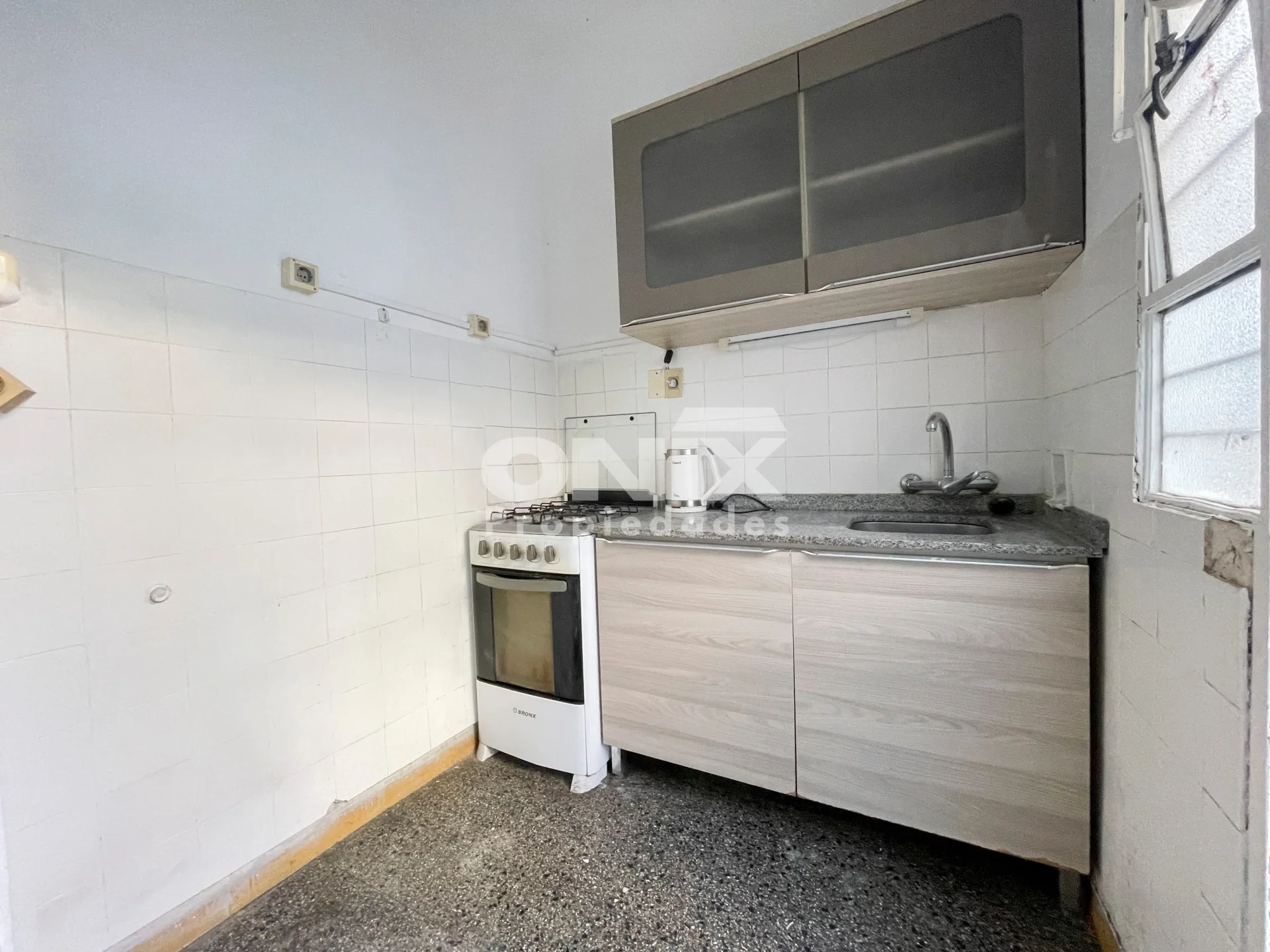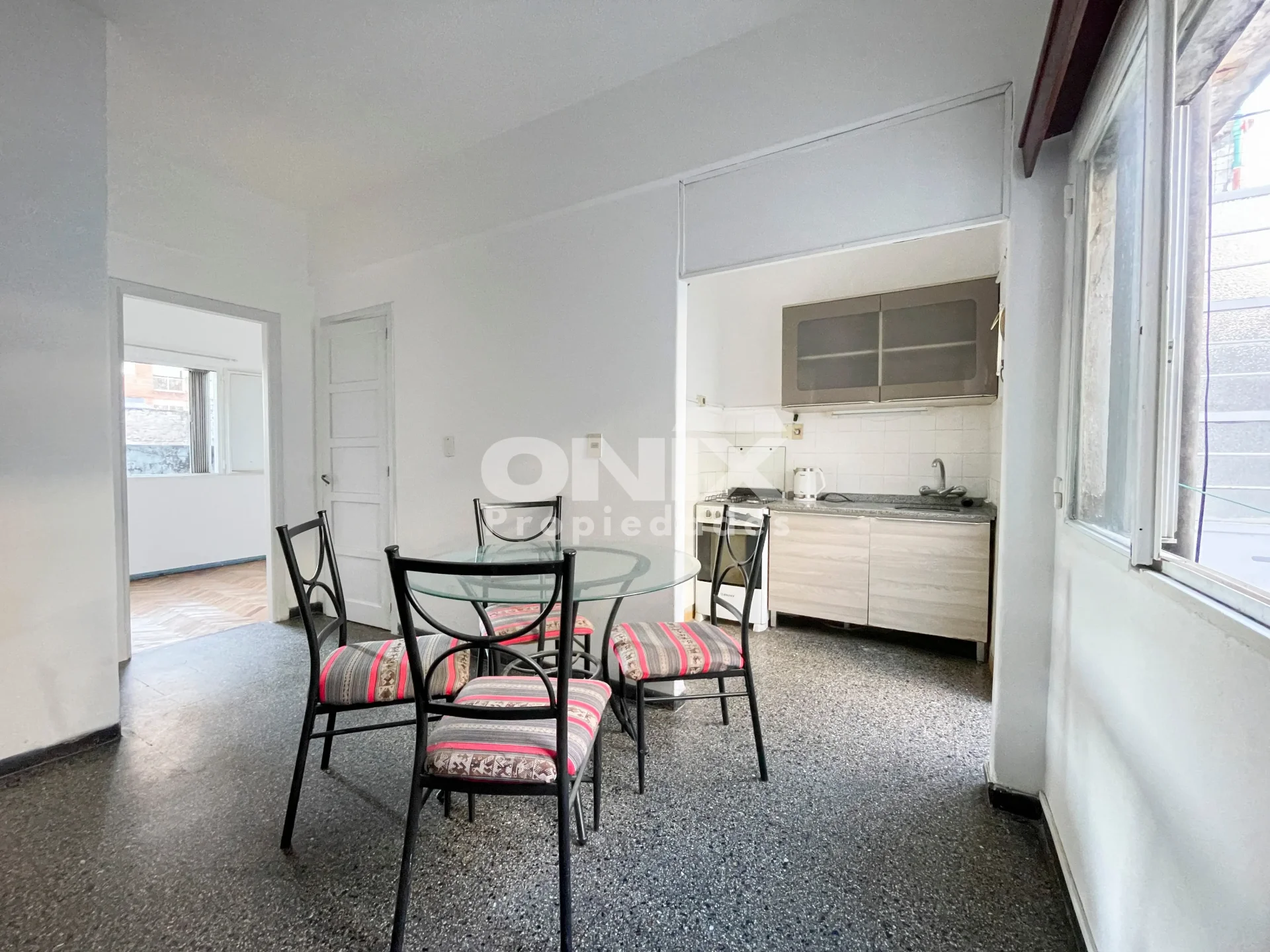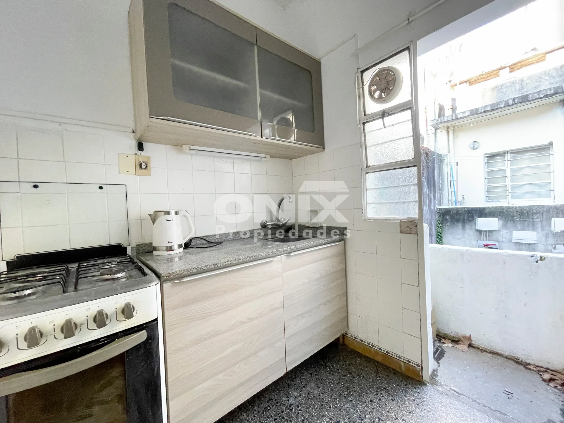 Cocina con muebles aéreos y bajo mesada, acceso a pequeña terraza
