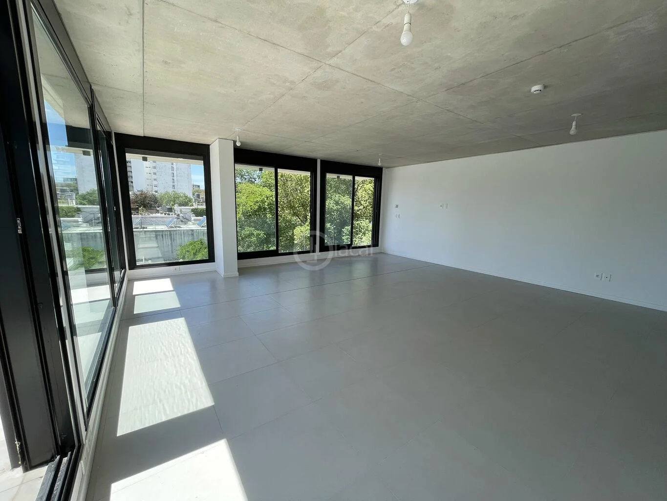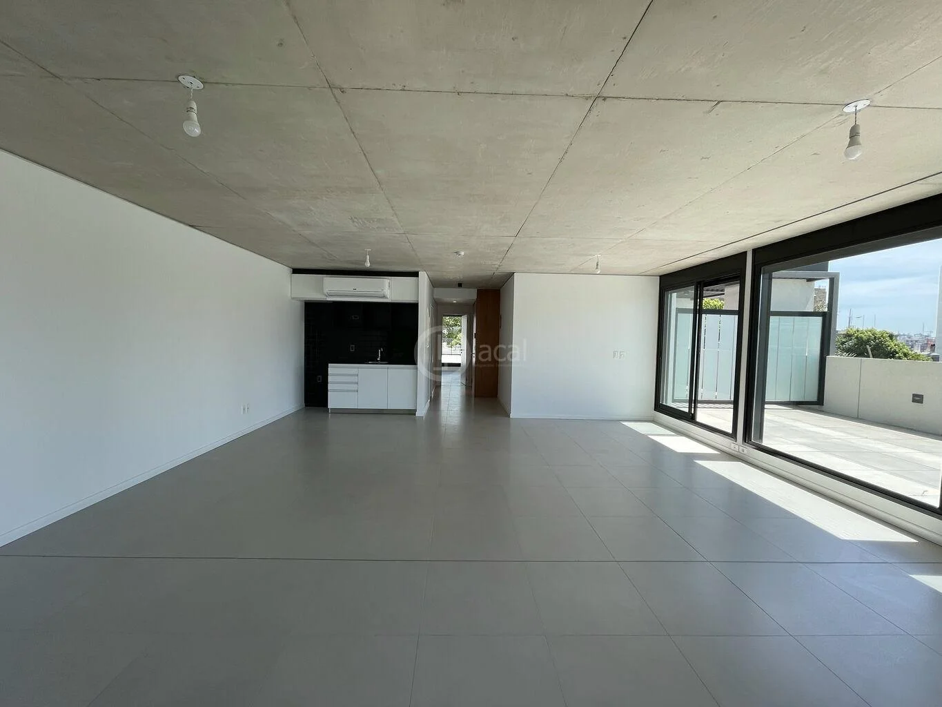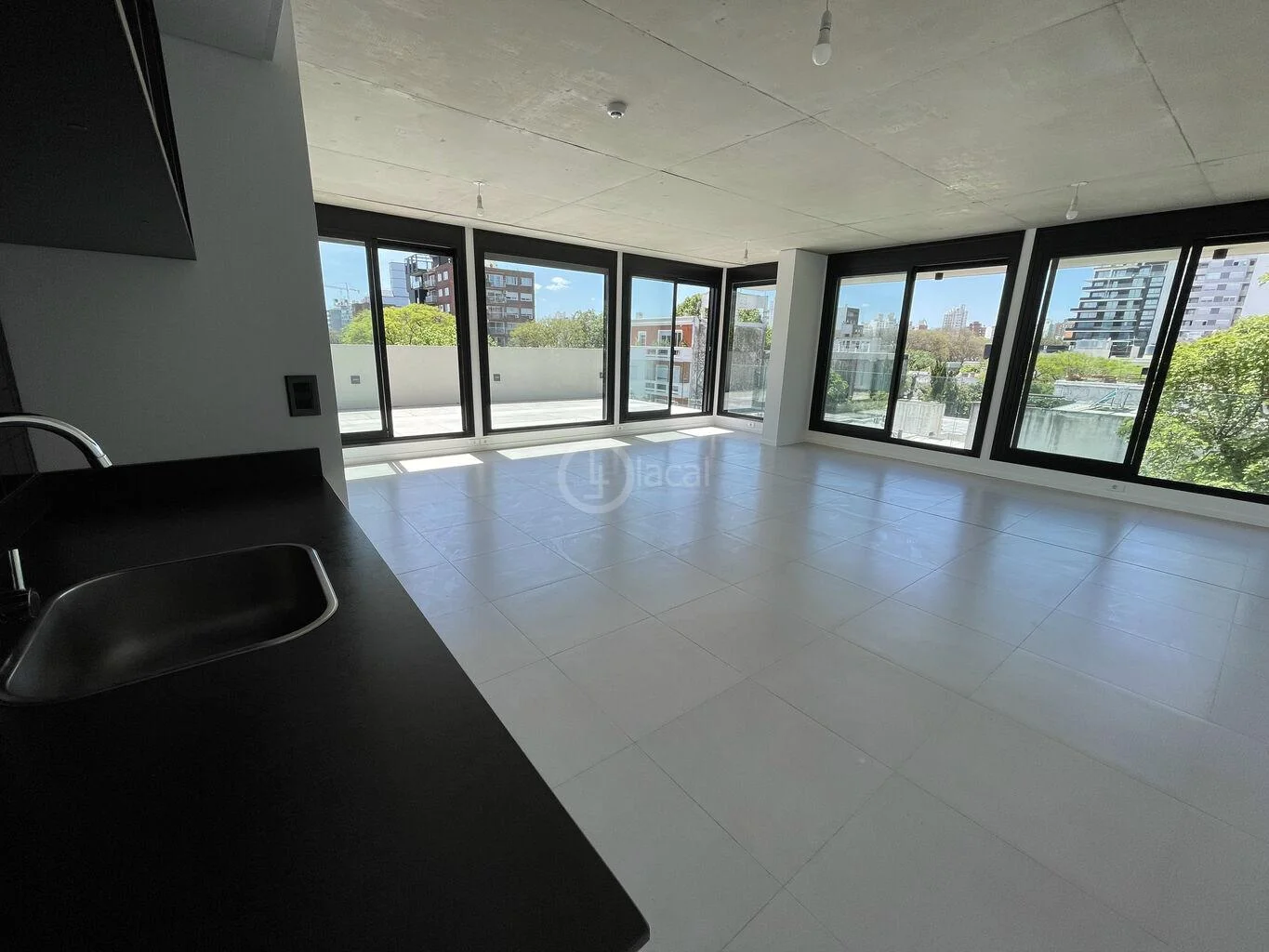 - Ambiente principal con cocina integrada, rodeado de ventanales de piso a techo, amplia terraza lateral y balcón al frente, exclusivas.