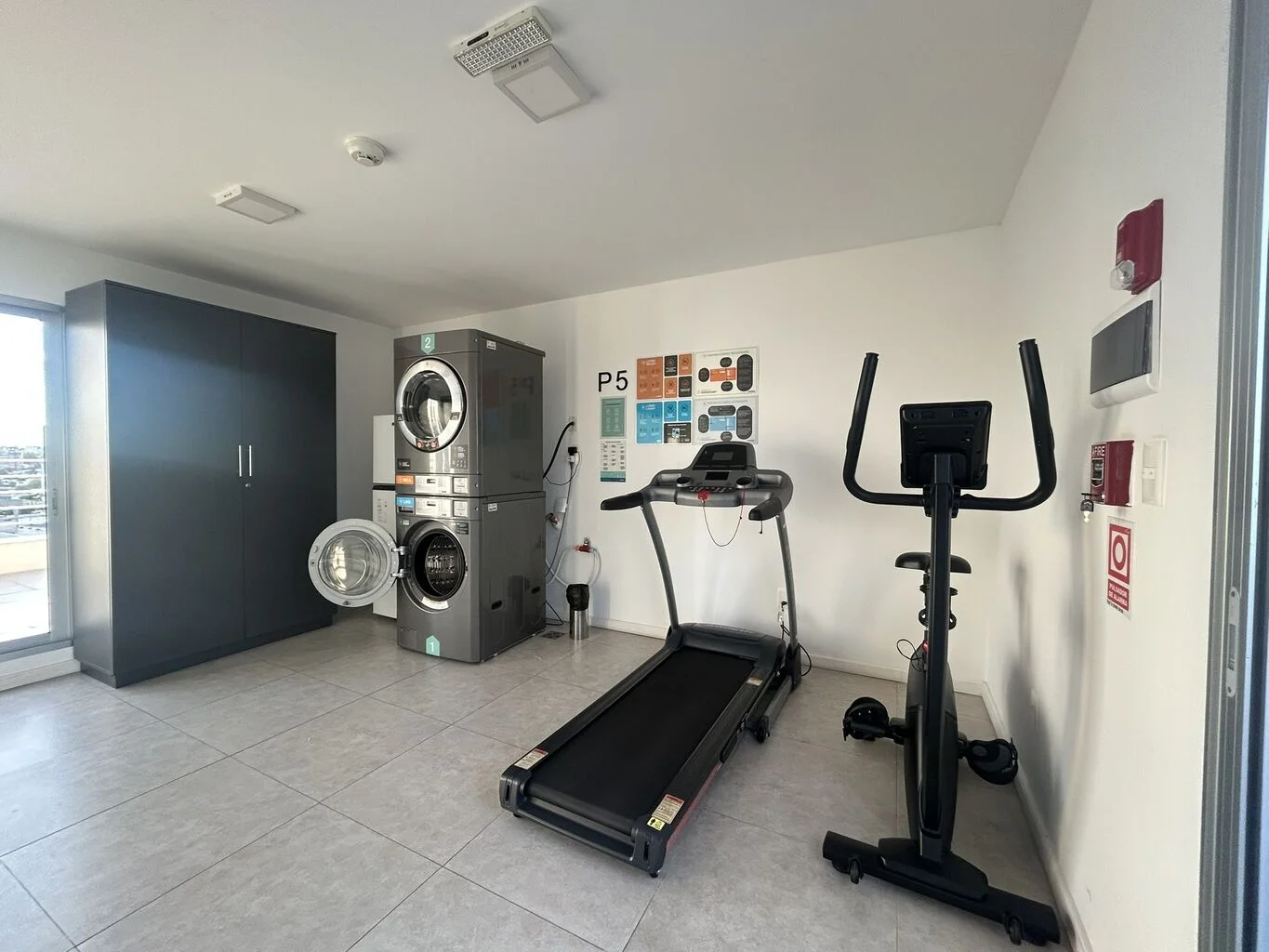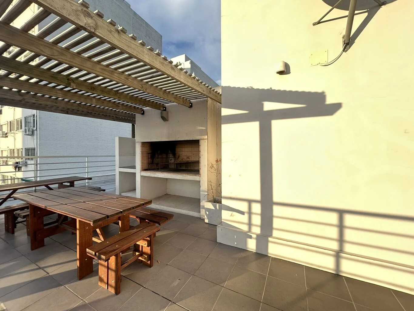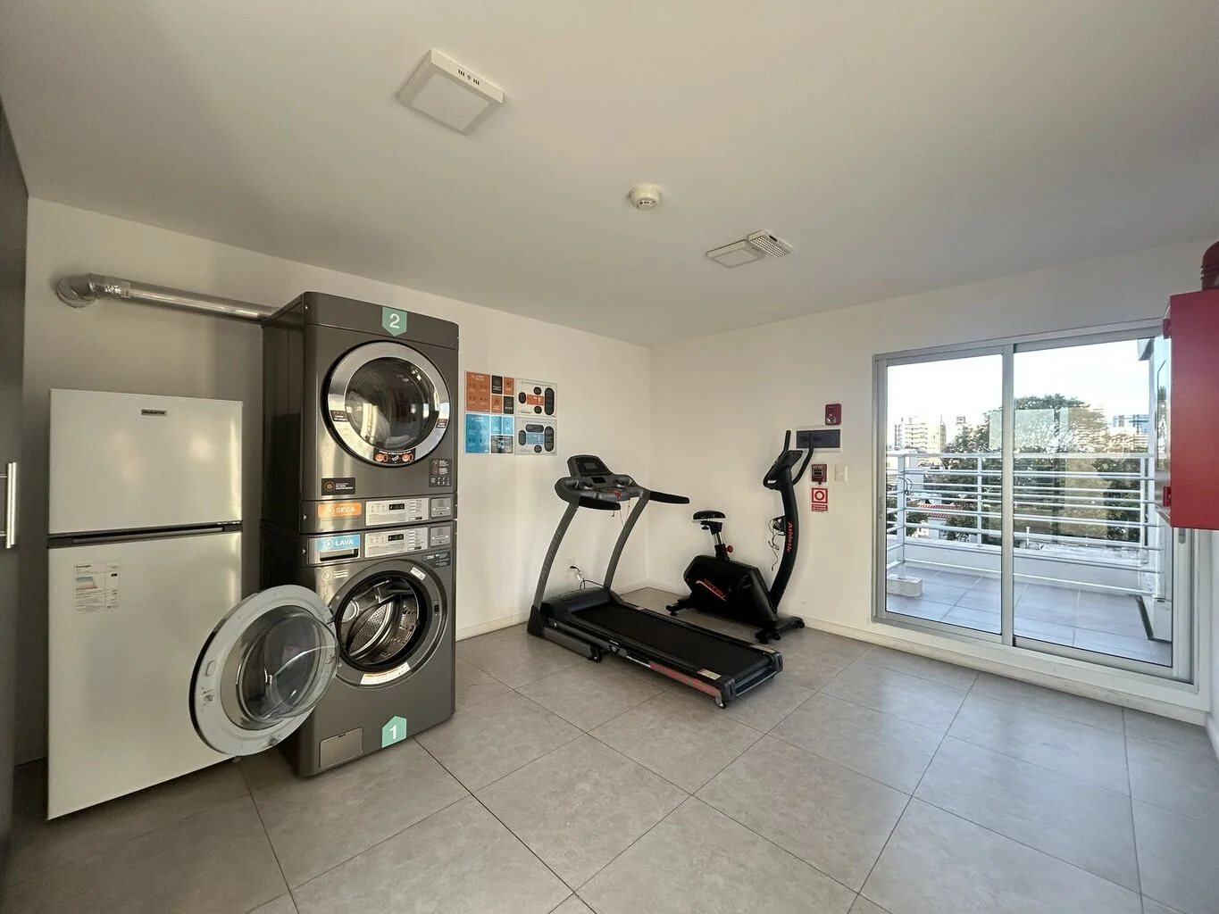 Edificio con amenities: barbacoa de uso común con parrillero, laundry y pequeño gimnasio