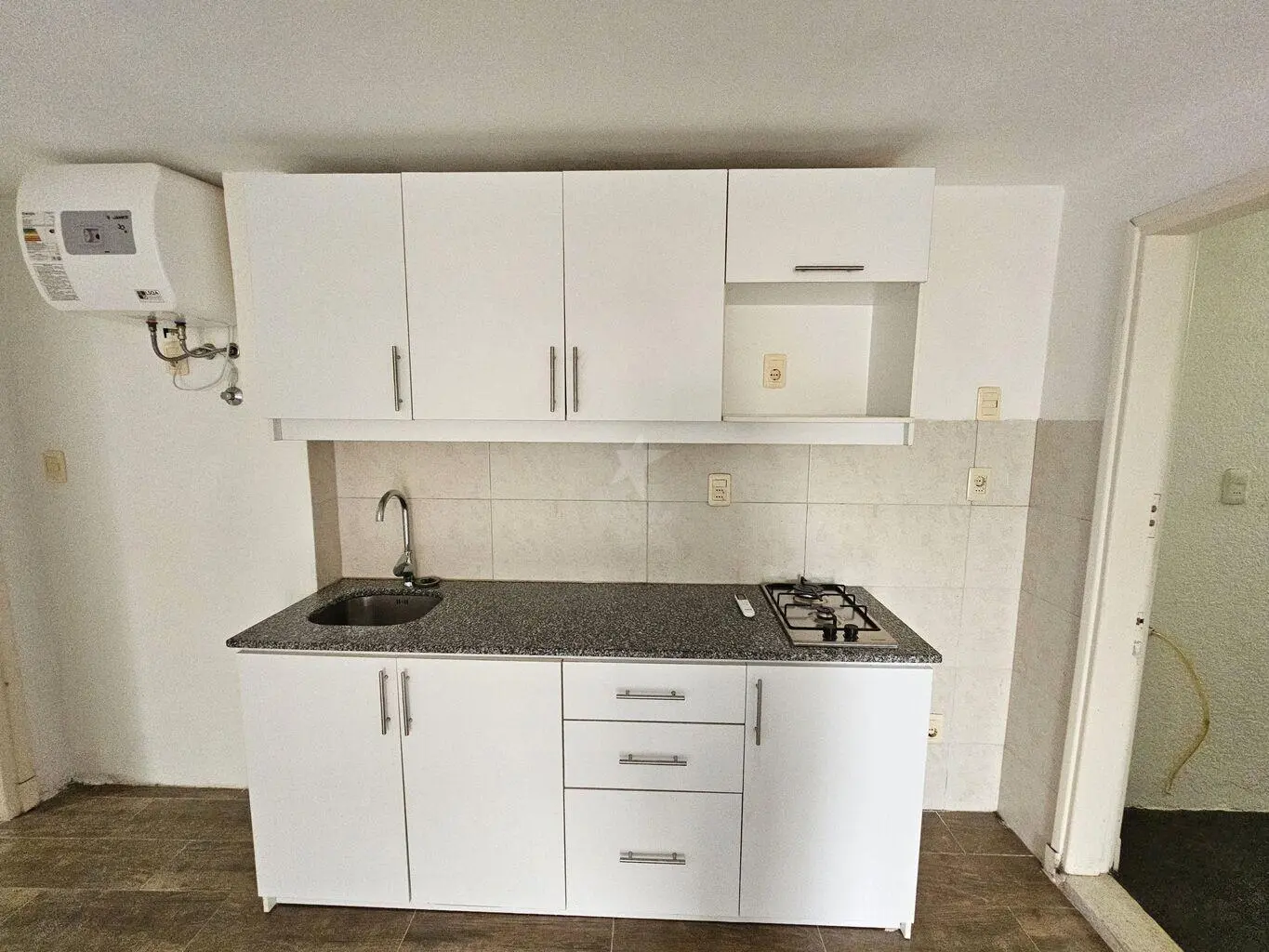 Cocina integrada con placares, anafe y extractor.
