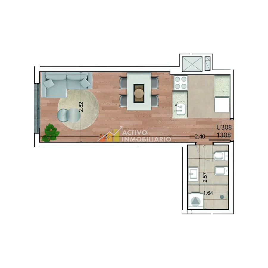 Posee 29,7m2 totales, distribuidos de la siguiente forma: