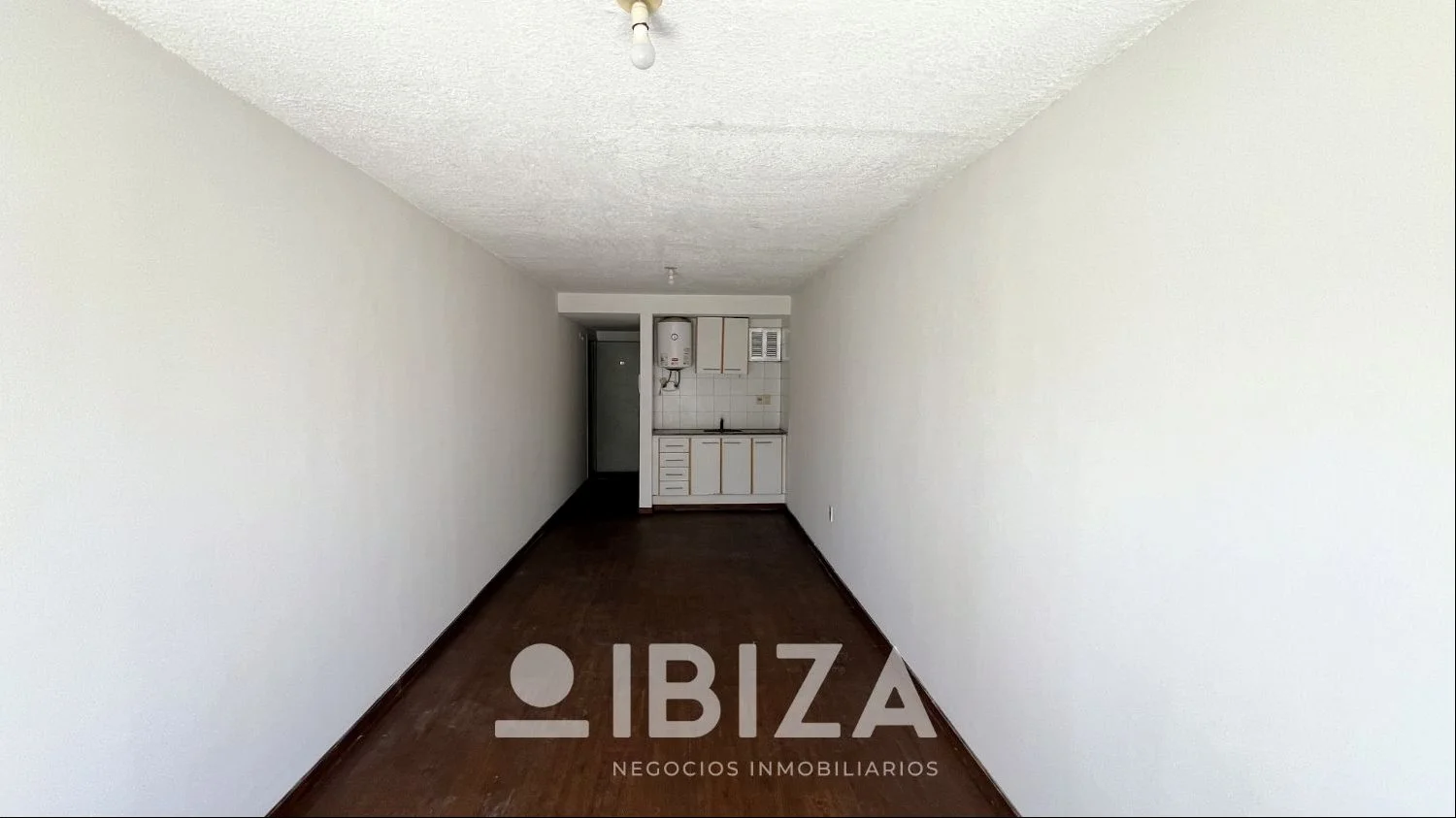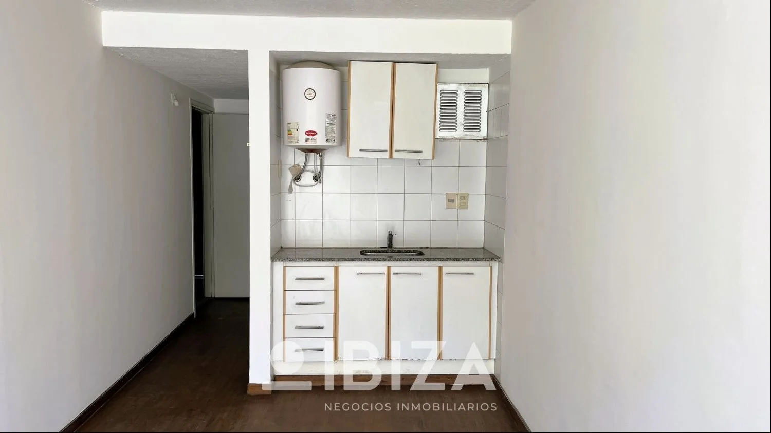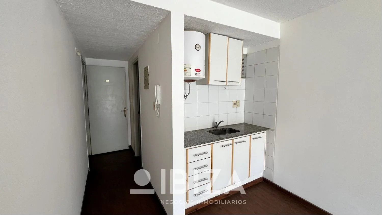 La distribución del apartamento es de un solo ambiente principal, optimizando el espacio disponible. Cuenta con una kitchenette integrada con placares sobre y bajo mesada, baño completo y una terraza al frente.