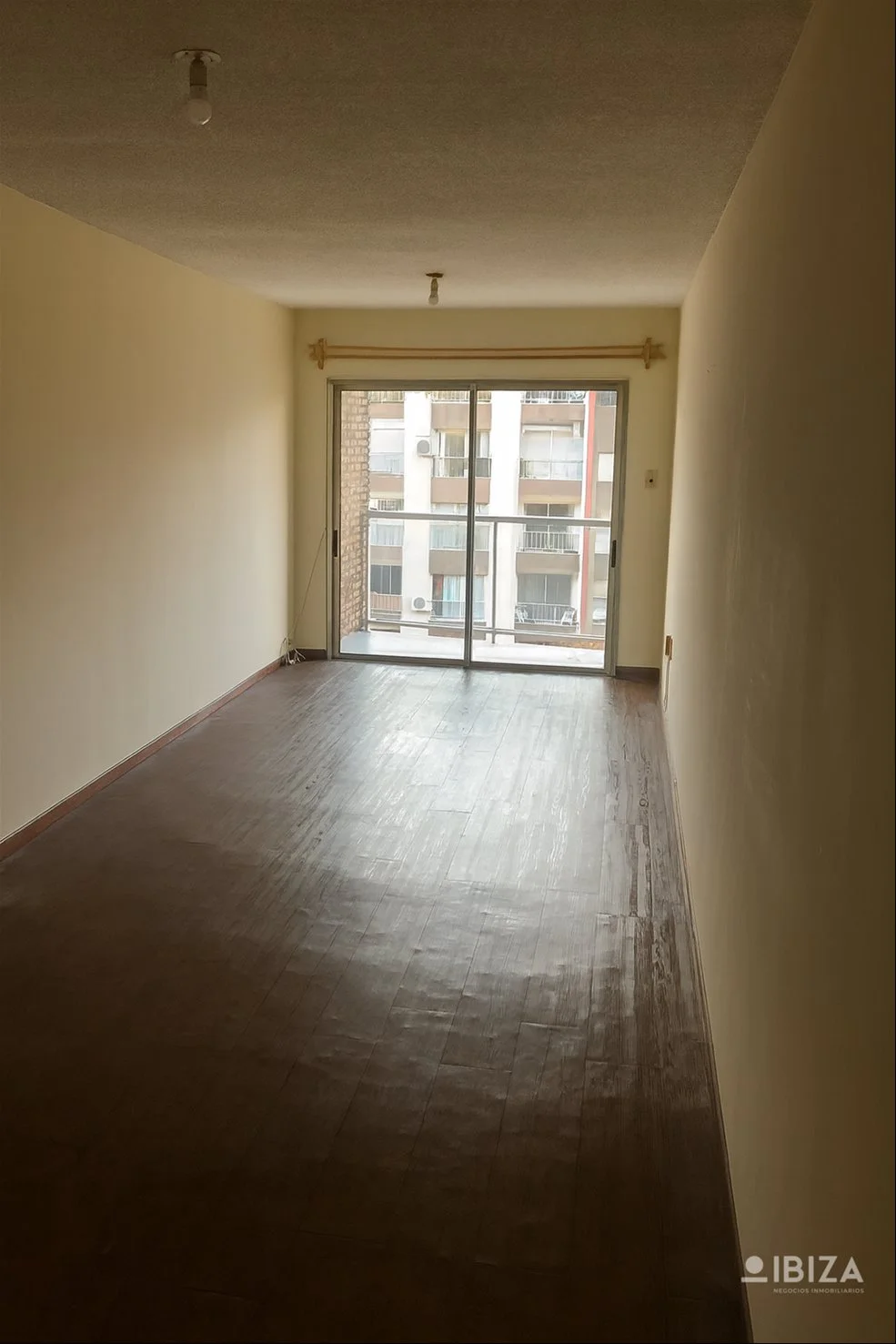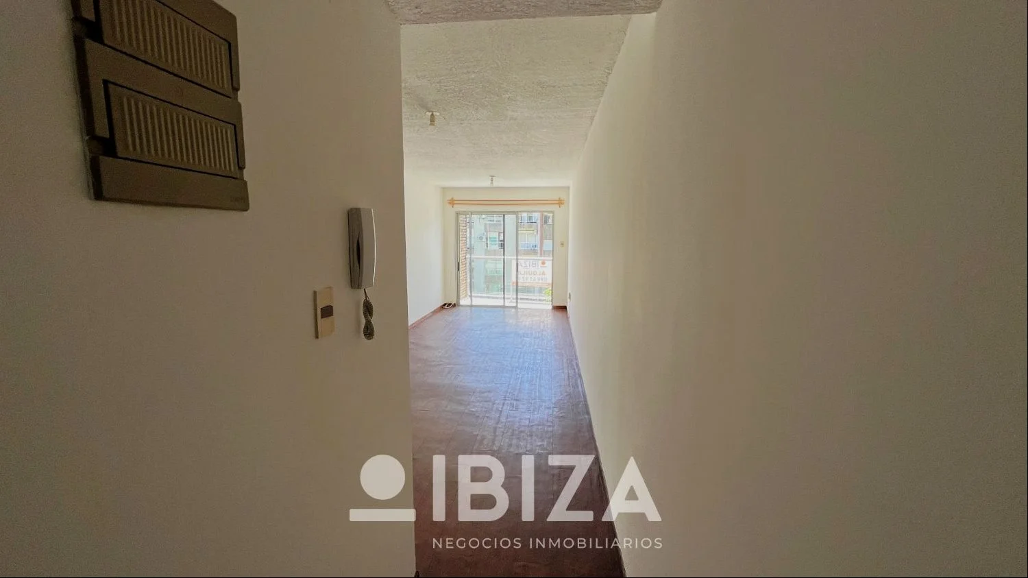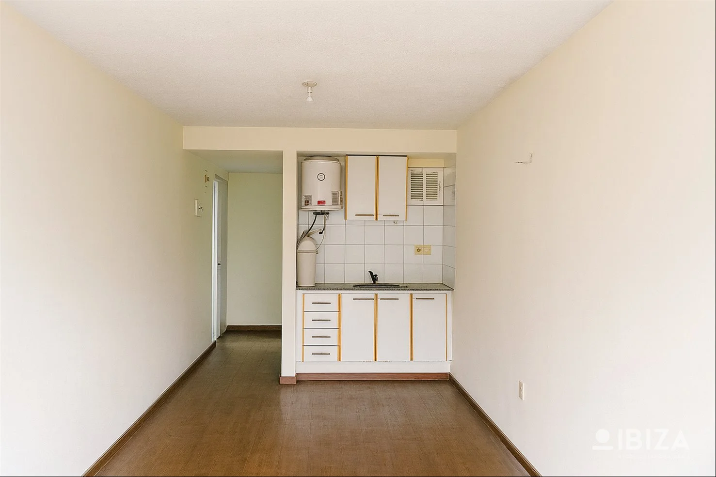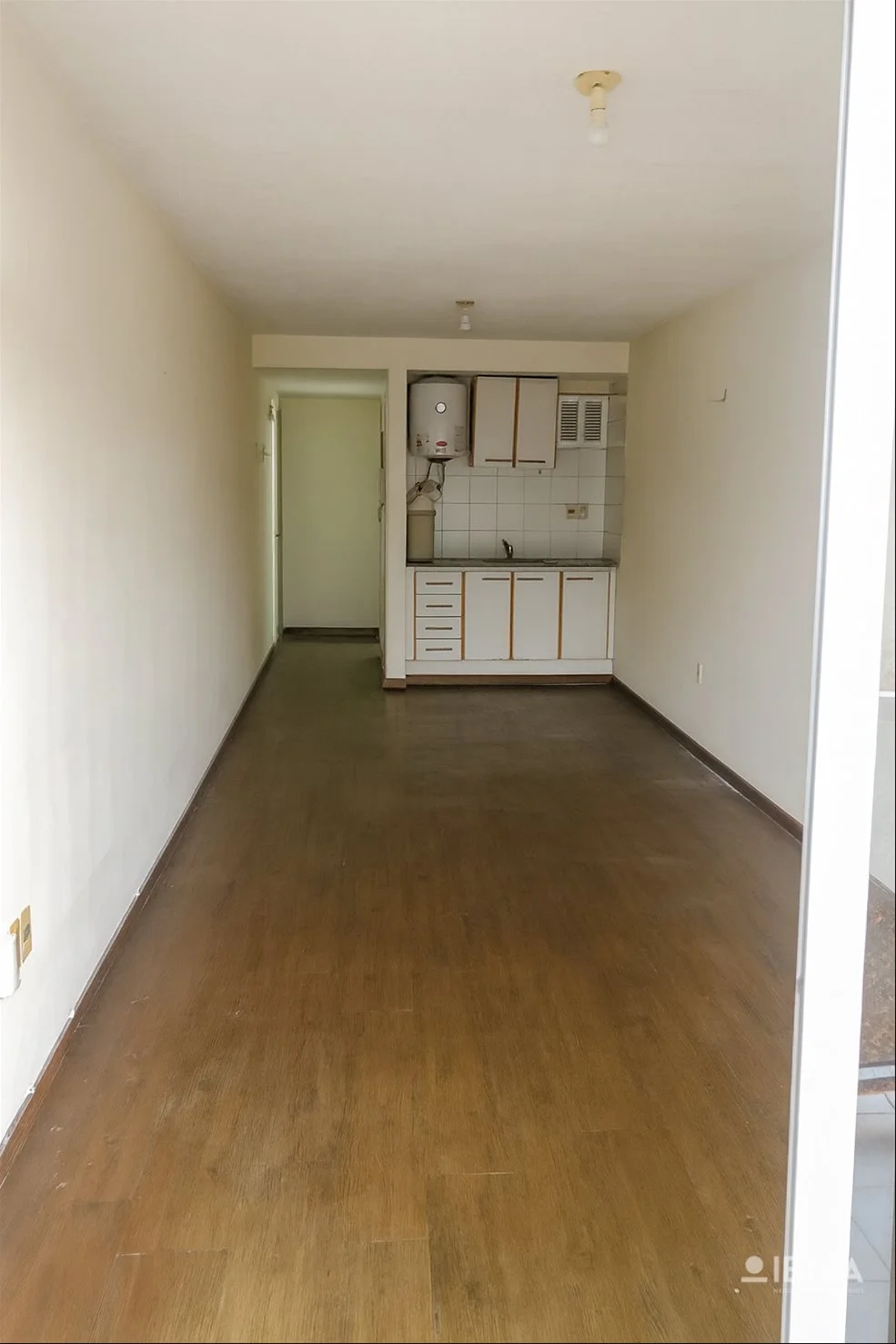 La distribución del apartamento es de un solo ambiente principal, optimizando el espacio disponible. Cuenta con una kitchenette integrada con placares sobre y bajo mesada, baño completo y una terraza al frente.