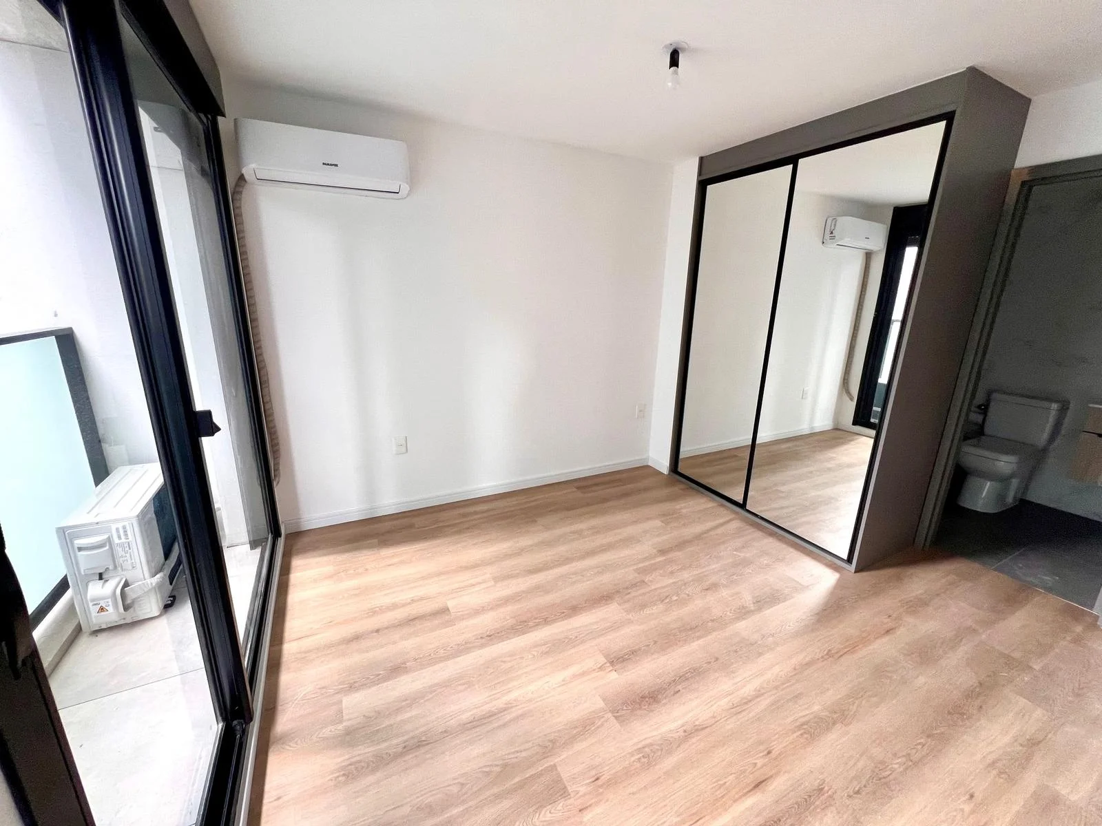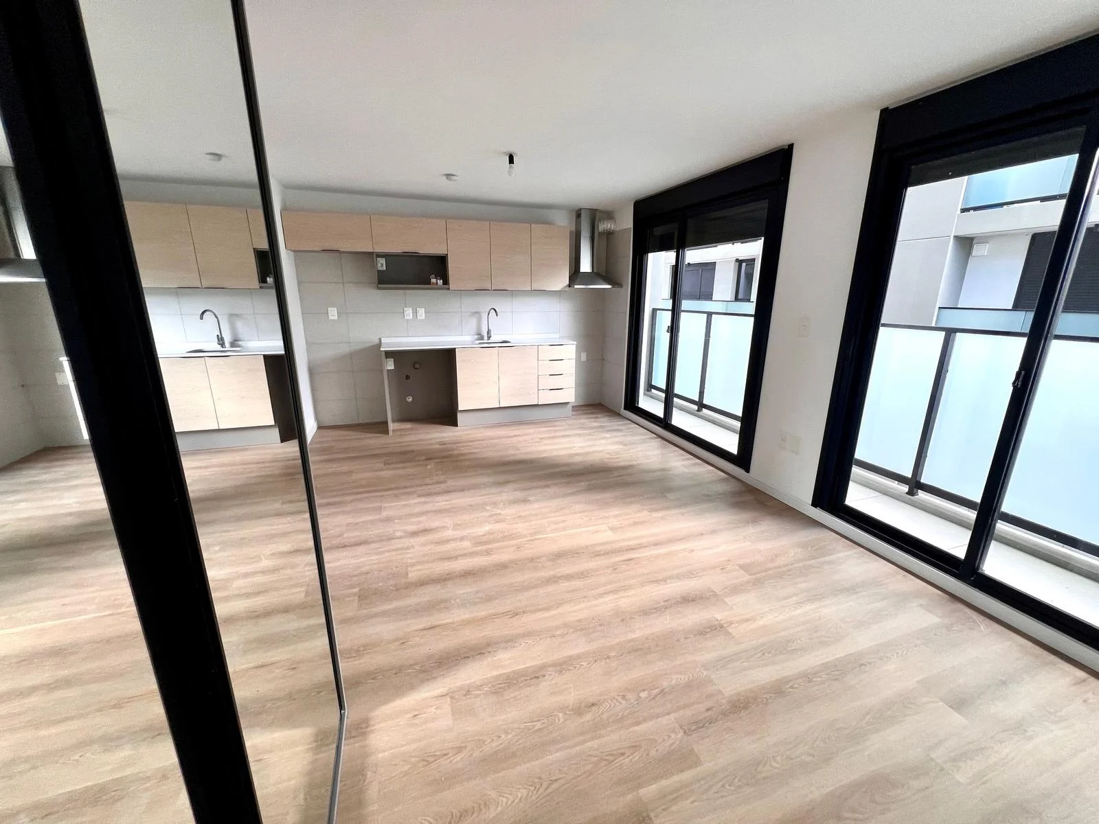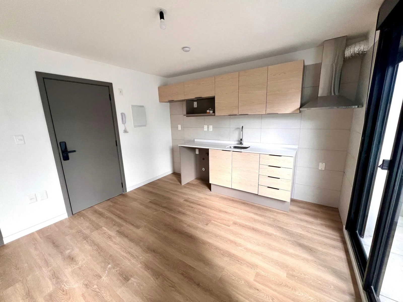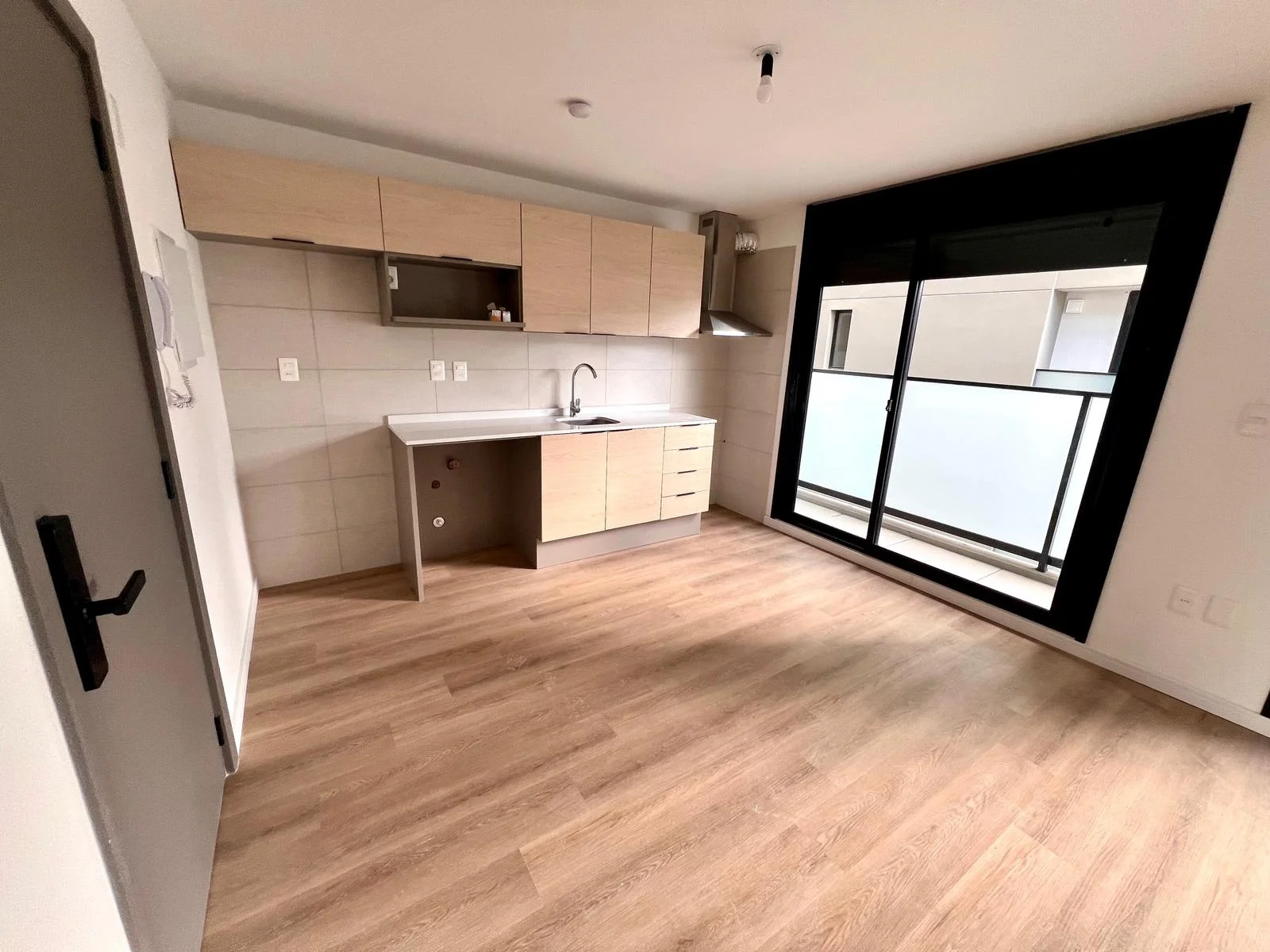 Ambiente rectangular con cocina integrada, dos grandes ventanales al balcón. Armario empotrado de buen tamaño. Baño.