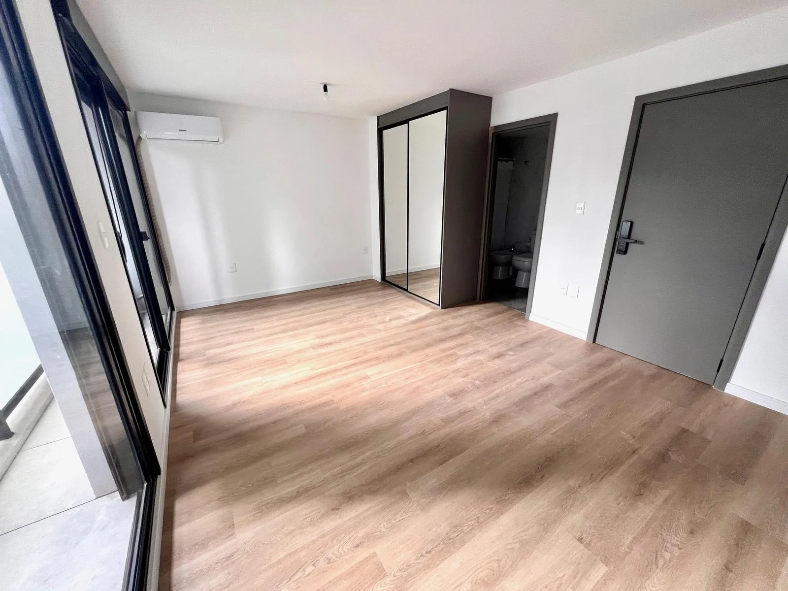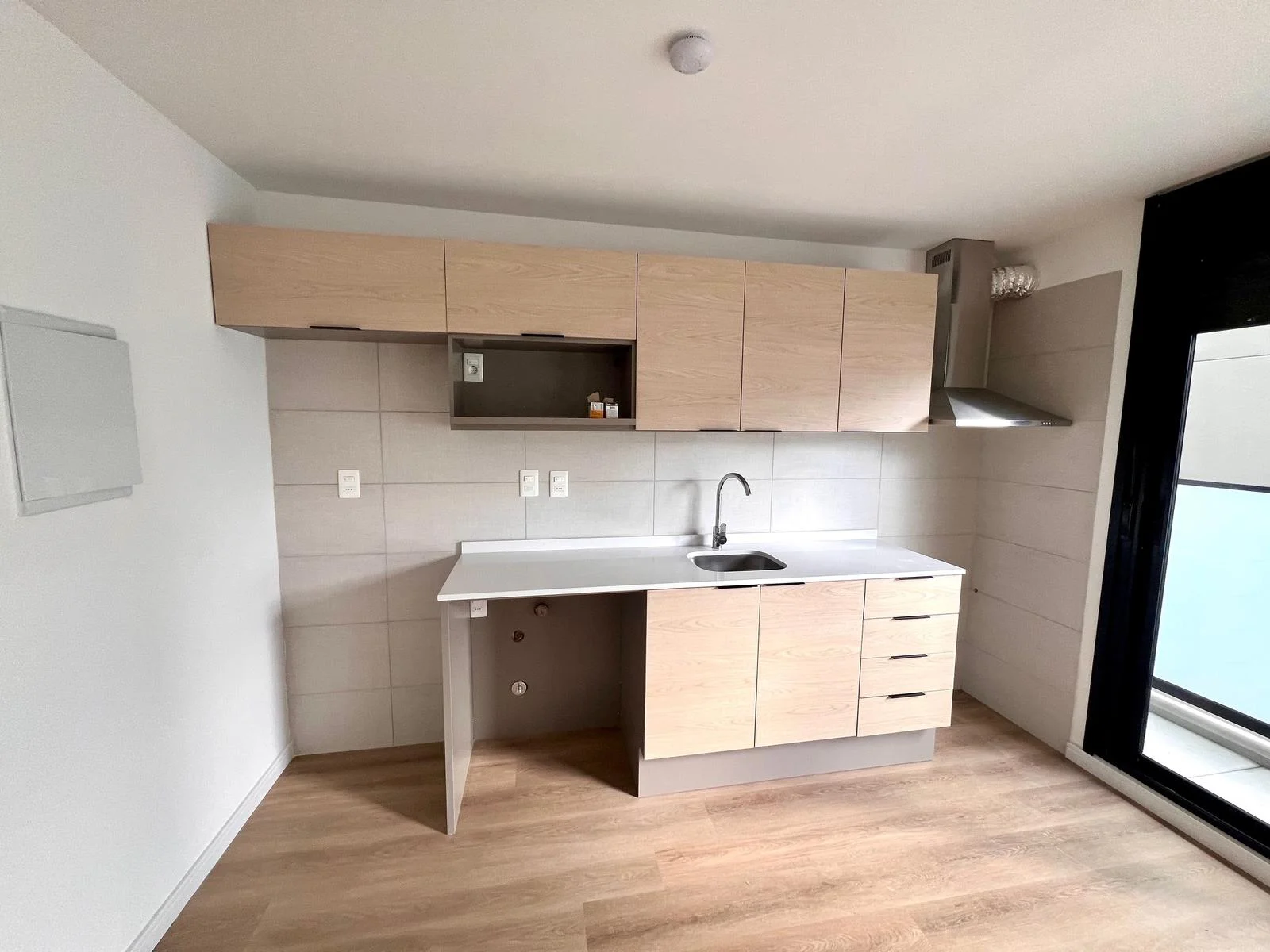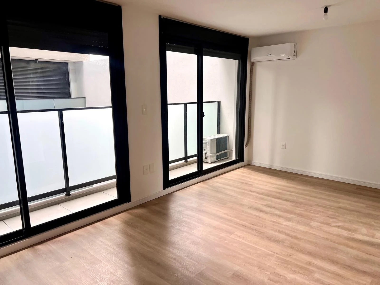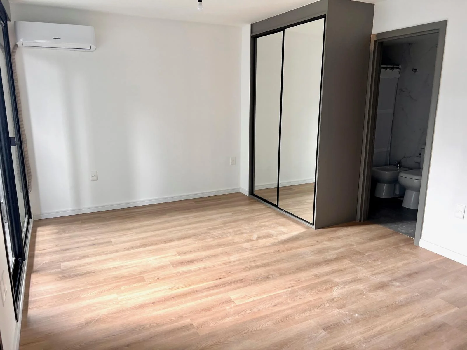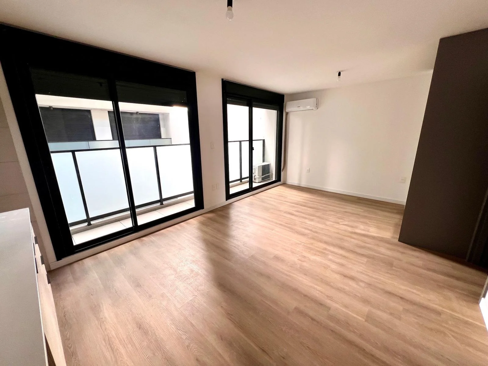 Ambiente rectangular con cocina integrada, dos grandes ventanales al balcón. Armario empotrado de buen tamaño. Baño.