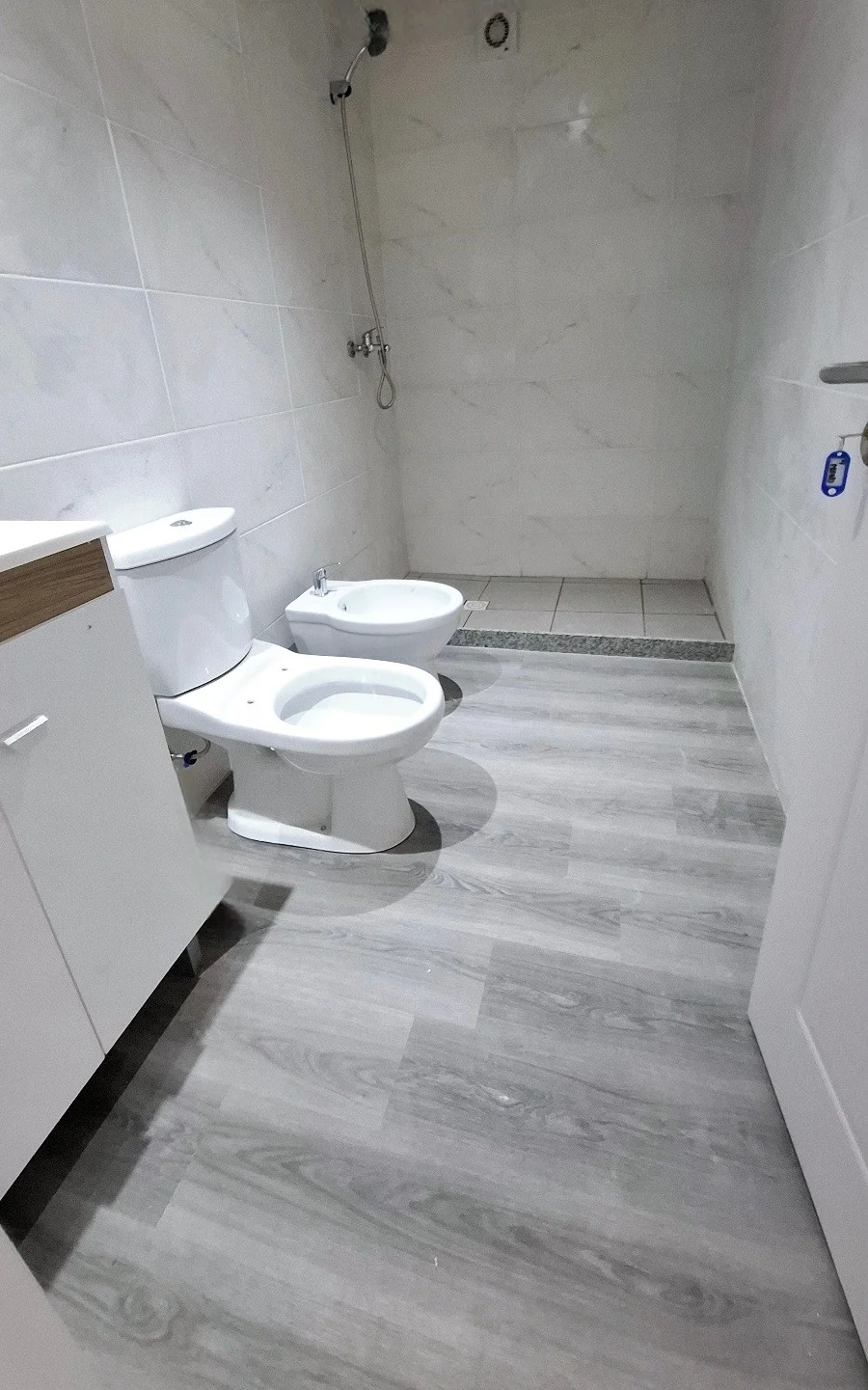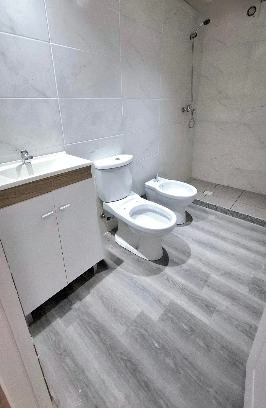 Baño amplio completo con ducha, bidet, extractor y bacha con mueble.