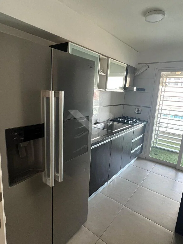 La cocina es completa y funcional, equipada con línea blanca que incluye anafe, horno empotrado y pasaplatos hacia el parrillero.