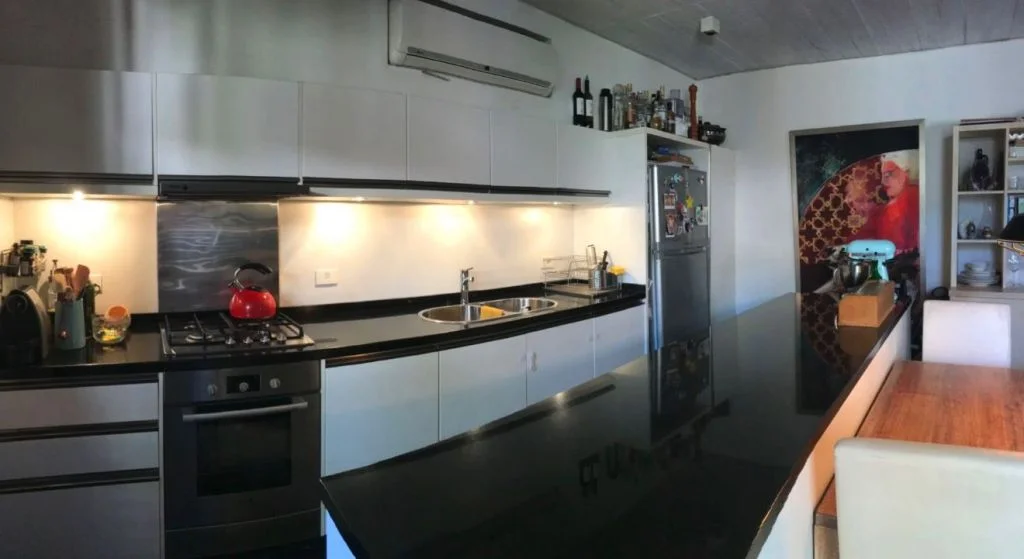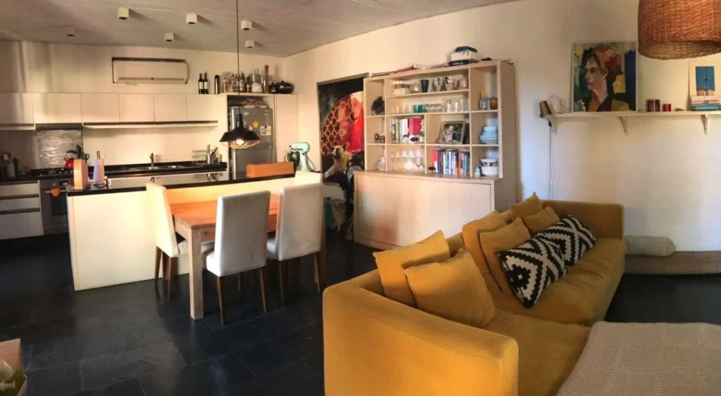 Tipologia duplex, planta baja con living comedor con estufa a leña, cocina integrada (cuenta con horno, anafe, campana); planta alta con 2 dormitorios y baño (con calefon).