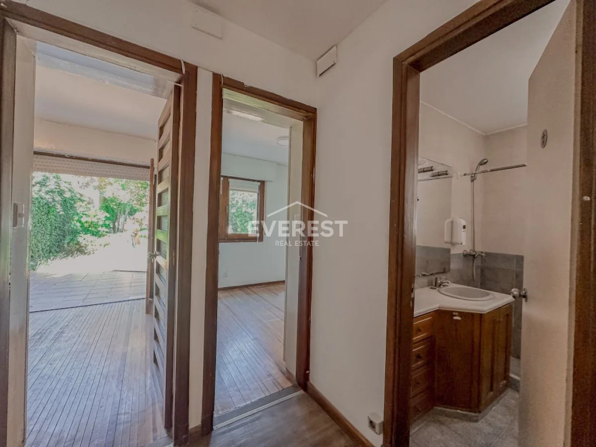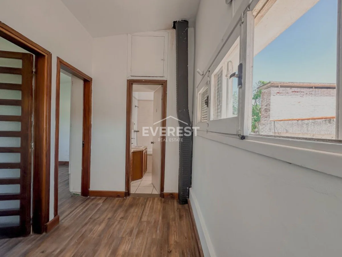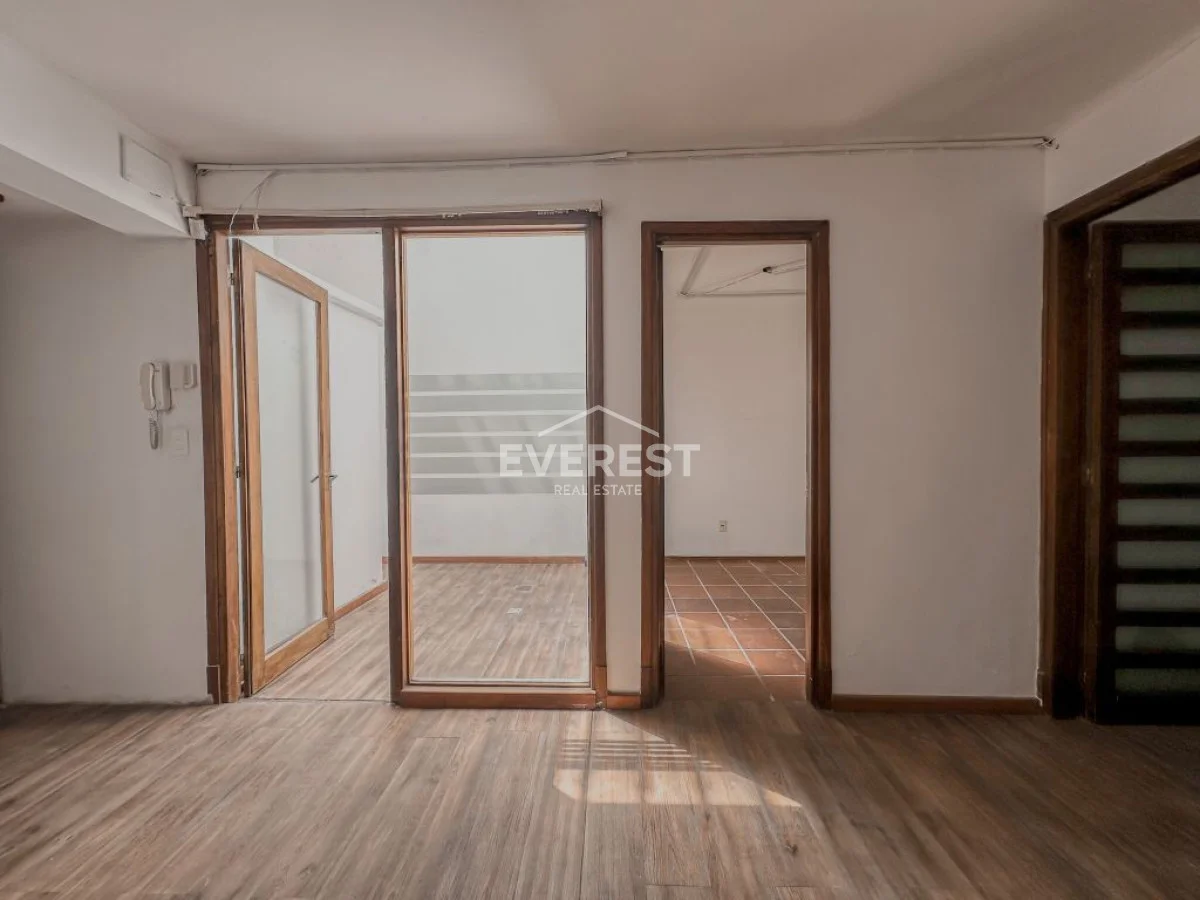 Cuenta con cochera para 1 o 2 autos, y un amplio ambiente principal actualmente dividido por una mampara de vidrio.