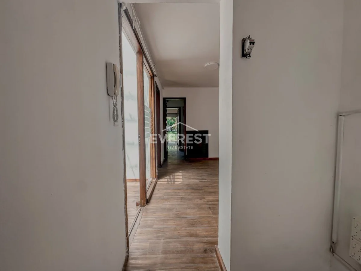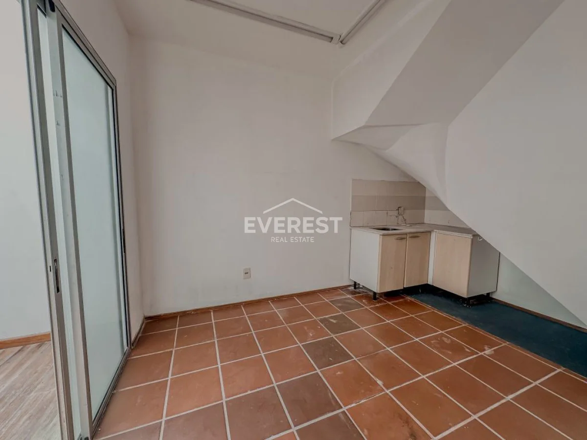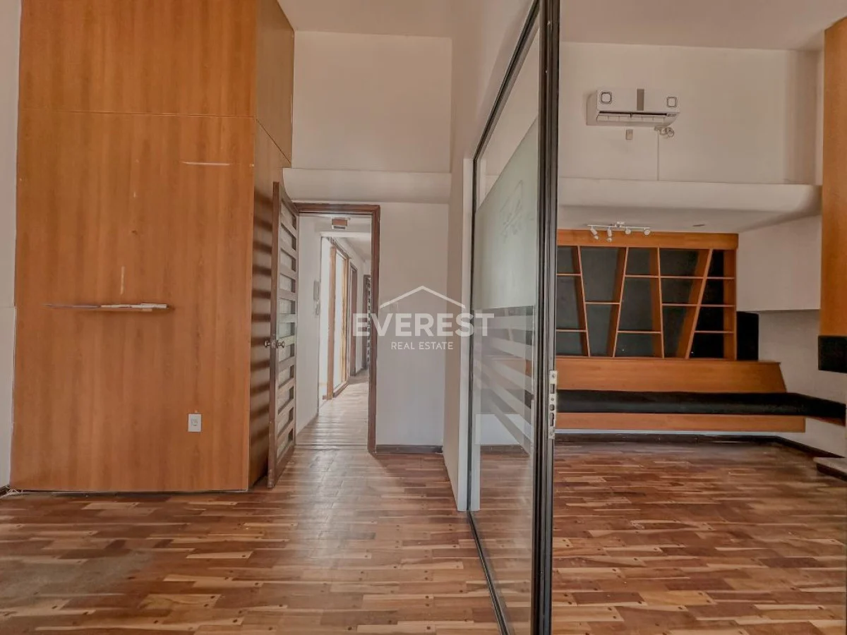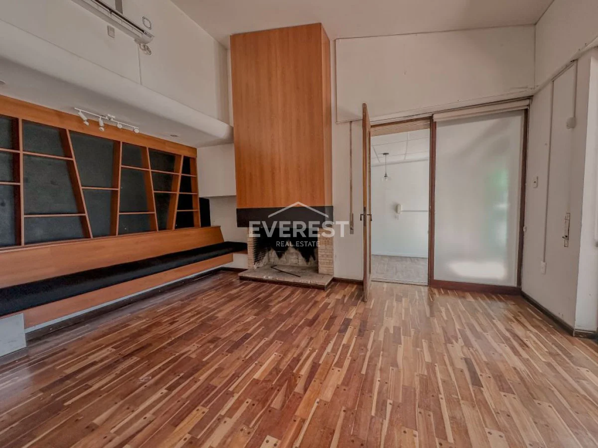 Cuenta con cochera para 1 o 2 autos, y un amplio ambiente principal actualmente dividido por una mampara de vidrio.